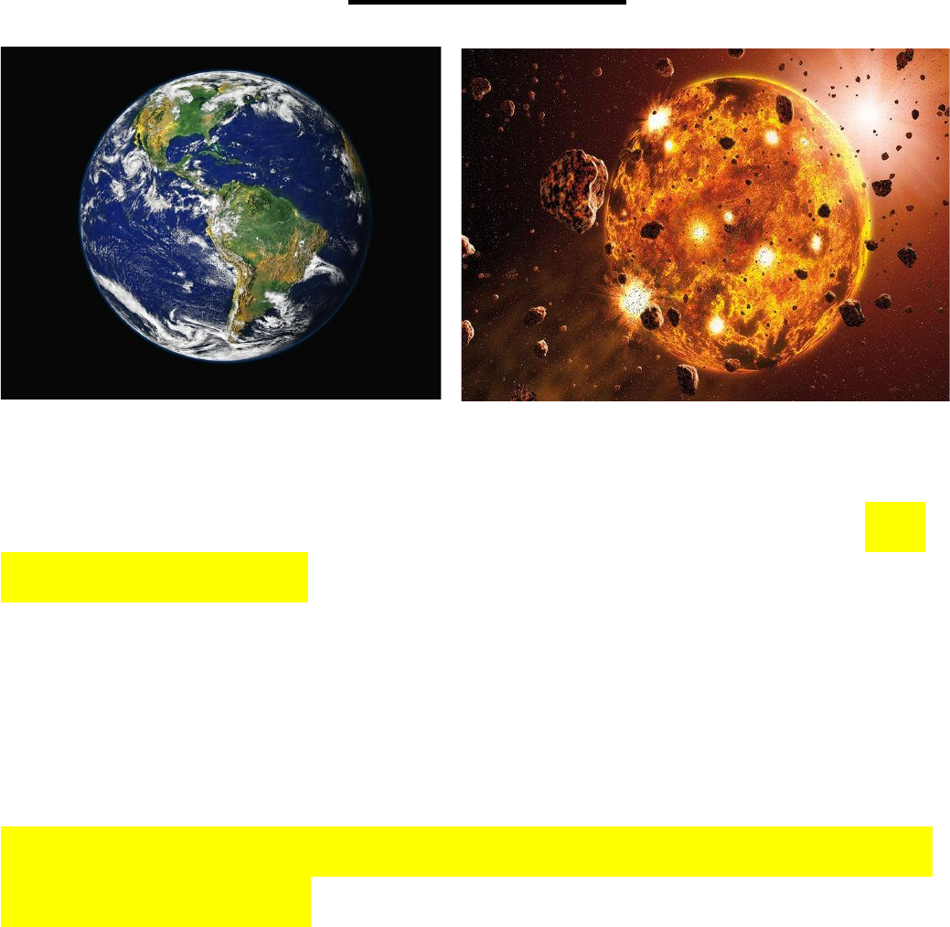 Planeta Terra - Os planetas e os astros do Sistema Solar teriam sido formados a partir de fragmentos de poeira e gases oriundas do sol há aproximadamente 4,6 bilhões de anos; - O Sistema Solar corresponde a um conjunto de planetas e astros que gira em torno do Sol; - A sequência se estabelece da seguinte forma, a partir do mais próximo para o mais distante: Mercúrio, Vênus, Terra, Marte, Júpiter, Saturno, Urano e Netuno; - Além de planetas, giram em torno do sol asteroides, cometas e satélites naturais. Formação e características do planeta Terra - A Terra, há 4,6 bilhões de anos, era uma massa de matéria magmática que, ao longo de milhões de anos, resfriou-se. Esse resfriamento deu origem a uma camada rochosa, a camada litosfera. Esse período é chamado de Era Pré- cambriana. - Ao longo desses bilhões de anos, várias mutações aconteceram no planeta, muitas violentas, como os terremotos. Esses abalos ocorrem de dentro para fora, nas camadas internas da Terra, alterando de forma significativa a superfície terrestre. - Outras mudanças menos violentas foram graduais, como a formação da camada de gases que envolvem o planeta, a atmosfera. Essa camada protege-nos da forte radiação solar que atinge a Terra, permitindo que haja vida. - Os movimentos do planeta, como a rotação (em torno de si) e a translação (ao redor do Sol), possibilitaram uma forma esférica da Terra, que é achatada nos polos. Essa forma recebe o nome de geoide. Modelo do formato geoide da Terra Atividades (COPIE NO CADERNO E RESPONDA) 1. Qual a idade aproximada de nosso planeta? 2. Quantos e quais são os planetas do Sistema Solar? 3. Explique o que é a atmosfera. 4. Por que nosso planeta tem formato geoide? 5. Desenhe como você imagina que era a Terra a milhões de anos atrás.