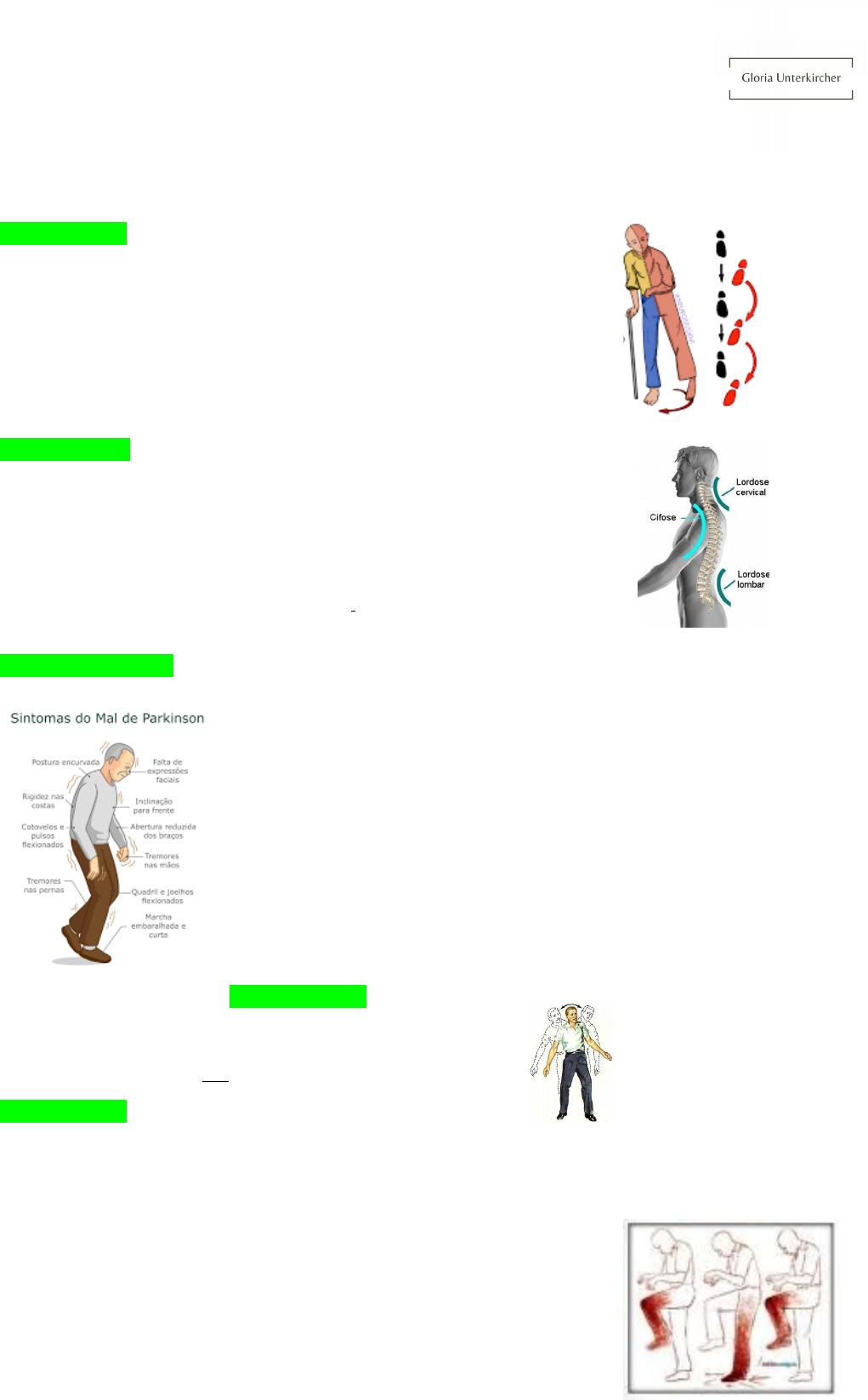 MARCHAS PATOLÓGICAS Na avaliação do equilíbrio dinâmico do paciente, podemos identificar diferentes marchas anormais pela análise das características comuns entre elas. Marcha ceifante - Membro superior fletido em 90 graus, em adução, com a mão fechada e com leve pronação. - Joelho sem flexão. - Forma um semicírculo ao andar. Essa marcha é identificada em pacientes com hemiplegia devido a AVC. Marcha anserina - Lordose acentuada. - Paciente inclina o corpo ora para a direita, ora para a esquerda. - Apoio das mãos nos quadris. Essa marcha é característica de pacientes com diminuição da força dos músculos pélvicos e das coxas. Marcha parkinsoniana - Membros enrijecidos. - Cabeça olhando para baixo. - Passos curtos e rápidos, como se o paciente estivesse procurando seu centro gravitacional. - Olhar fixo. Essa marcha ocorre devido ao Parkinson. Marcha cerebelar - Andar em zigue-zague. Essa marcha pode ocorrer por embriaguez ou lesão cerebelar. Marcha tabética - Os membros inferiores são levantados abruptamente e colocados no chão com força no calcanhar. - Olhar fixo no chão. Essa marcha se desenvolve pela perda da propriocepção devido a lesão no cordão posterior da medula. Marcha de pequenos passos - Passos curtos, como se o paciente estivesse patinando. Essa marcha ocorre por paralisia pseudobulbar, doenças extrapiramidais e pode ser vista comumente em idosos. Marcha vestibular - O paciente não consegue andar em linha reta (lateropulsão). - Se solicitado que ande para trás, forma uma estrela (marcha de estrela). Essa marcha ocorre devido a lesões no labirinto do ouvido interno. Marcha escarvante - O paciente não flexiona dorsalmente o pé. - Tropeços. - Arrasta os pés ao invés de levantá-los. Marcha em tesoura ou espástica - Membros inferiores fletidos e enrijecidos, com cruzamento das pernas. Marcha claudicante - O paciente manca. Essa marcha ocorre por insuficiência arterial periférica e falhas no aparelho locomotor.