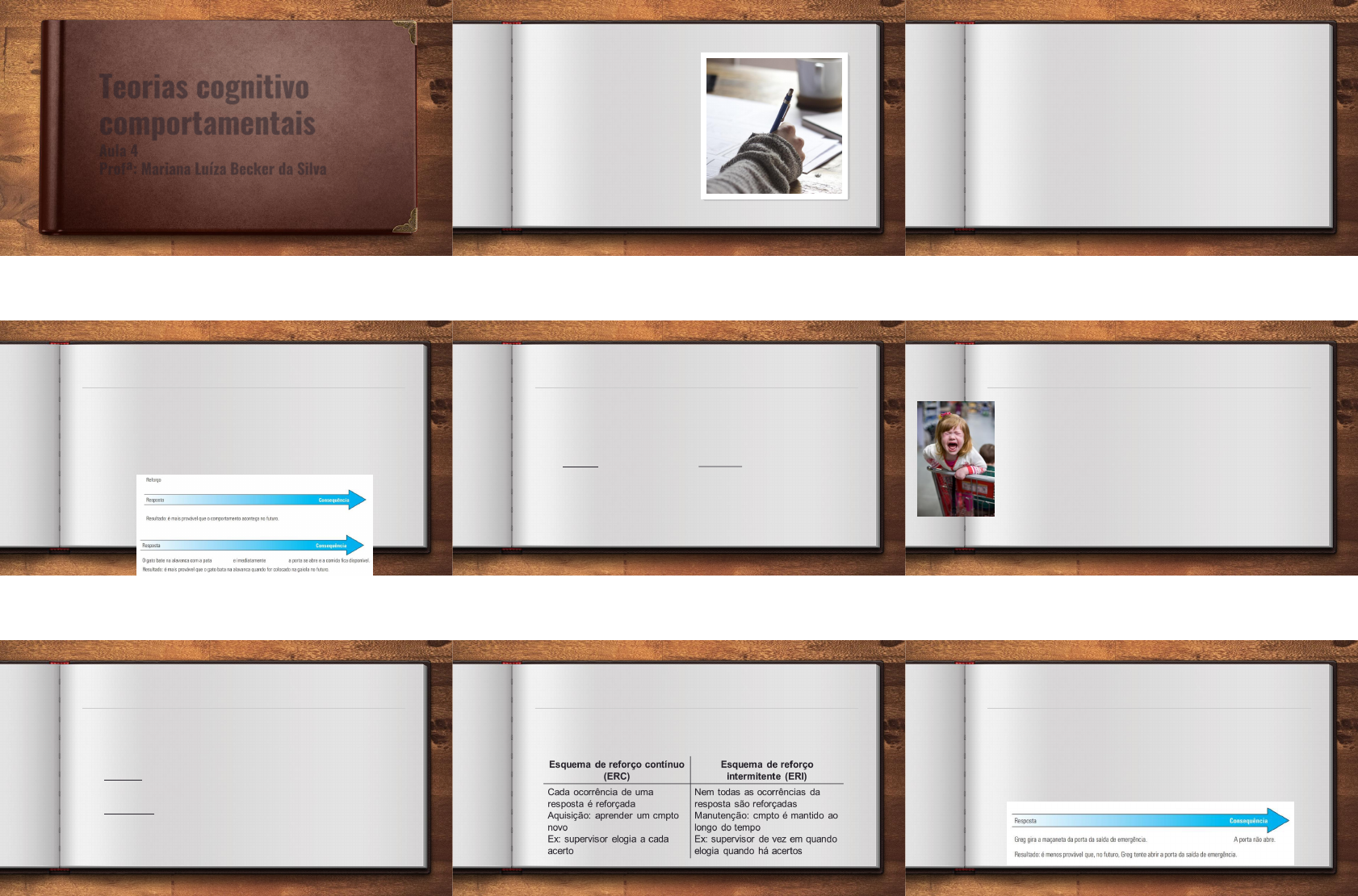 Teorias cognitivo comportamentais Aula 4 Profª: Mariana Luíza Becker da Silva Dúvidas? Sobre os textos... Sobre aulas... Sobre o vídeo de Skinner... 2 Retomando… Algumas colocações… • Relatos de queixas nem sempre referem-se a cmptos, menos ainda sobre antecedentes e consequências • Cabe ao psi conduzir a entrevista clínica para conseguir informações necessárias para a análise funcional • Análise funcional constituem hipóteses com base nas informações coletadas > validadas pela modificação do cmpto a partir de mudanças nas variáveis de controle • É possível que um cmpto tenha relação com outro (não linear) Reforço ◈ É o processo pelo qual um comportamento é fortalecido pela consequência imediata que acompanha a maior probabilidade de sua ocorrência no futuro. ◈ Reforço é sempre definido pelo efeito que tem sobre o cmpto > definição funcional. 4 Positivo Uma ocorrência de um comportamento é seguida pela adição de um estímulo ou aumento da intensidade de um estímulo, que resulta no fortalecimento do cmpto. Reforço Negativo Uma ocorrência de um comportamento é seguida pela remoção de um estímulo (aversivo) ou pela redução da intensidade de um estímulo, que resulta no fortalecimento do cmpto. 5 Exemplo de reforço Uma menina começa a fazer birra (chorando e gritando) na mercearia quando pede doces e a mãe diz que não vai comprar. A mãe finalmente compra o doce (reforçador positivo) e ela para de fazer birra (estímulo aversivo é removido). É mais provável que a mãe dê doces quando ela exigir e fizer birra (reforço negativo). Além disso, a criança ficará mais propensa a fazer birra na loja, porque assim a mãe vai dar doces a ela (reforço positivo). 6 Reforço ◈ O reforço pode ocorrer naturalmente, como resultado de nossas interações com o ambiente, ou pode ser planejado para mudar o cmpto de uma pessoa. ◈ Natural: um cmpto produz uma consequência reforçadora por meio do contato direto com o ambiente ◈ Arbitrário: um cmpto produz uma consequência reforçadora por meio das ações de outra pessoa. 7 Esquemas de reforço ◈ Especifica se toda resposta é seguida por um reforçador ou se apenas algumas são seguidas por um reforçador. 8 Extinção operante ◈ Processo que enfraquece o comportamento operante ◈ A suspensão do reforço (extinção) tem como resultado a gradual diminuição da frequência de ocorrência do cmpto ◈ Um cmpto que antes era reforçado > deixa de ser > para de ocorrer 9 Punição ◈ É a consequência que reduz a frequência do cmpto que a produz. ◈ Ex: diferentes bebidas > ressaca > menos provável no futuro ◈ Não necessariamente algo aversivo é diminuído ◈ Para dizer que houve uma punição > necessário uma diminuição na frequência do cmpto. 10 Punição Positiva A ocorrência de um cmpto é seguida pela apresentação, adição (+) de um estímulo aversivo torna menos provável que o cmpto ocorra Ex: alergia de camarão > passa mal > não come + Negativa A ocorrência de um cmpto é seguida pela remoção (-) de um estímulo reforçador torna menos provável que o cmpto ocorra no futuro. Ex: fumar > não receber beijos da namorada > diminuir os cigarros 11 Reforço x Extinção x punição 12 Contingência de três termos ◈ Unidade básica do cmpto operante ◈ Relação entre um estímulo antecedente, um comportamento e a consequência do comportamento: ED → R → ER (reforçador) ou EP (punidor) ◈ Um estímulo antecedente controla um cmpto porque é reforçado/punido apenas na presença desse estímulo 13 Debate: É comum observar no cotidiano familiar o uso indiscriminado dos punidores potenciais, por parte dos pais, com o intuito de modificar a conduta dos filhos. Quais as desvantagens deste procedimento? Quais as alternativas que podem de forma mais adequada e proveitosa, em uma perspectiva comportamentalista, substituir punidores? Qual a diferença de comportamentos controlados aversivamente daqueles mantidos por reforço positivo? Qual a relação dessa discussão com os reforçadores naturais e arbitrários? Reforço e cidadania, qual a relação entre esses construtos? 14 Apontamentos... ◈ Modelagem e controle aversivo na formação do repertório cmptal das pessoas ◈ Impacto na sociedade ◈ Pode produzir agressão, fuga, efeitos emocionais ◈ Contracontrole: pode ser emitido novo cmpto que impede o punidor de manter o controle sobre o cmpto ◈ Pode ser reforçado - > cada vez + palamadas 15 Apontamentos... ◈ Principal razão que leva sofrimento psi é histórico de controle aversivo do cmpto ◈ Por que punimos tanto? Imediaticidade da consequência, não necessita de privação e facilidade nas contingências ◈ Alternativas ao controle aversivo: Reforço + ao invés de reforço - > elogiar acertos e não criticar erros; extinção ao invés de punição (redução de danos) ◈ Falta de punição não é igual a liberdade total: práticas alternativas 16 Atividade verificadora: Paulo era uma criança de 21 meses, fisicamente muito fraca e necessitando de muito cuidado especial, como consequência de uma séria enfermidade sofrida durante os primeiros 18 meses de vida. Agora, como já garantira o médico, sua saúde havia melhorado bastante, entretanto, ele continuava a exigir muita atenção e cuidado, impondo os seus desejos com um comportamento de birra, especialmente à noite. Sistematicamente, quando colocado na cama, fazia birra, desde que seus pais deixassem o quarto antes que ele já tivesse dormido. Os pais perceberam que o menino protelava o sono pelo máximo de tempo que aquentasse, exercendo assim grande controle sobre eles. Qual conduta adotar considerando o modelo de aprendizagem operante? 17 Atividade para próxima aula: Ler: Garry Martin e Josoph Pear. Modificação de Comportamento: O que é e como fazer 10ed, cap. 23 e 24. 18 Referências HOLLAND, J. G.; SKINNER, B. F. A Análise do Comportamento. São Paulo: E