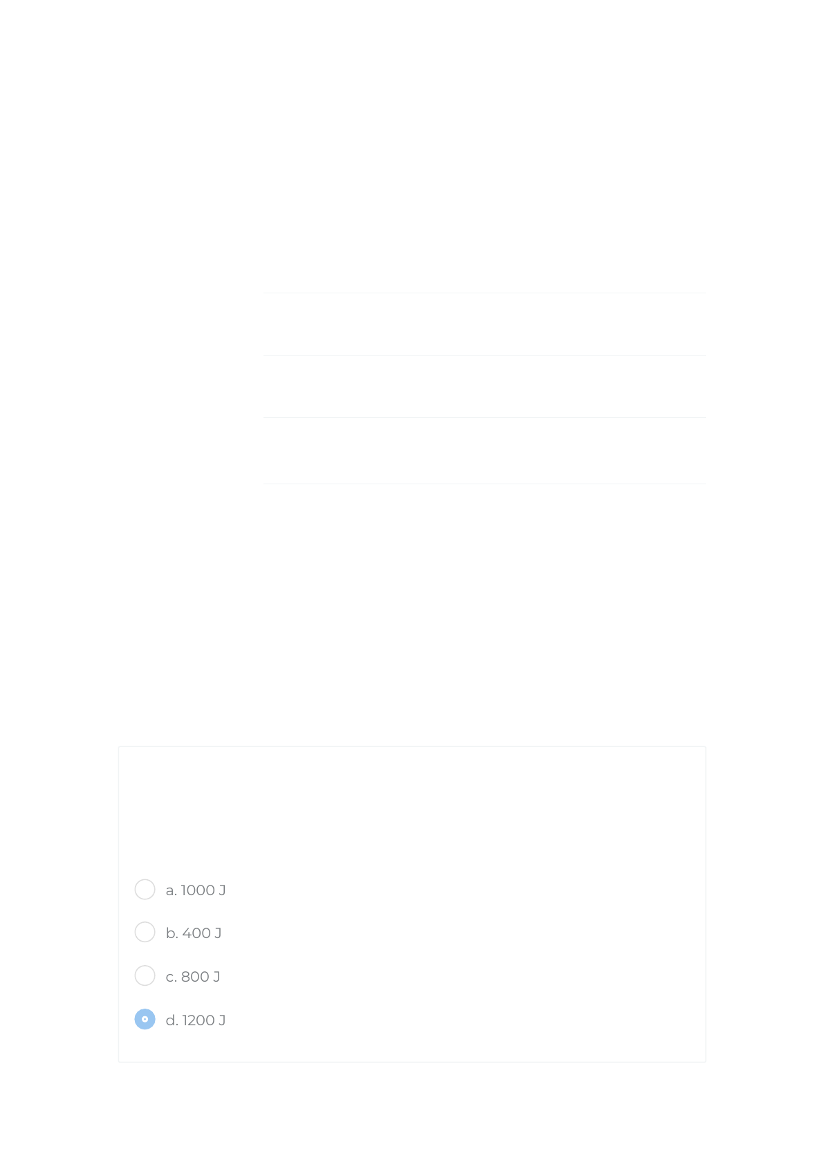 16/07/2021 Questionário - Aula 01 https://ava.politecnicabr.com.br/mod/quiz/review.php?attempt=1761730 1/4 Painel / Minhas Disciplinas / 20A118 / Aula 01 - Conceitos Básicos / Questionário - Aula 01 Fundamentos da Eletricidade I Iniciado em sexta, 16 Jul 2021, 18:11 Estado Finalizada Concluída em sexta, 16 Jul 2021, 18:15 Tempo empregado 4 minutos 46 segundos Avaliar 10,00 de um máximo de 10,00(100%) Questão 1 Correto Atingiu 2,00 de 2,00 Se uma força constante de 150 newtons é necessária para puxar um barco, quanto trabalho é realizado para puxá-lo por 8 metros? Escolha uma opção: a. 1000 J b. 400 J c. 800 J d. 1200 J https://ava.politecnicabr.com.br/my/ https://ava.politecnicabr.com.br/course/view.php?id=954 https://ava.politecnicabr.com.br/course/view.php?id=954#section-3 https://ava.politecnicabr.com.br/mod/quiz/view.php?id=25986 https://ava.politecnicabr.com.br/ 16/07/2021 Questionário - Aula 01 https://ava.politecnicabr.com.br/mod/quiz/review.php?attempt=1761730 2/4 Questão 2 Correto Atingiu 2,00 de 2,00 Qual é a unidade básica de medida de energia? Escolha uma opção: Questão 3 Correto Atingiu 2,00 de 2,00 Podemos a�rmar que "trabalho" é uma medida da aplicação de uma força para deslocamento de um objeto; energia é medida da capacidade de realização de trabalho. Escolha uma opção: a. Newton (N) b. Joule (J) c. Watts (W) d. Trabalho (T) Verdadeiro Falso https://ava.politecnicabr.com.br/ 16/07/2021 Questionário - Aula 01 https://ava.politecnicabr.com.br/mod/quiz/review.php?attempt=1761730 3/4 Questão 4 Correto Atingiu 2,00 de 2,00 Que energia é necessária para deslocar um carro por 120 metros quando se aplica uma força constante de 360 newtons? Escolha uma opção: Questão 5 Correto Atingiu 2,00 de 2,00 Podemos a�rmar que a temperatura de uma bateria em processo de descarga aumenta devido uma ine�ciência do sistema converte parte energia da bateria em calor. Escolha uma opção: a. 43.200 joules b. 40.200 joules c. 33.200 joules d. 45.200 joules Verdadeiro Falso https://ava.politecnicabr.com.br/ 16/07/2021 Questionário - Aula 01 https://ava.politecnicabr.com.br/mod/quiz/review.php?attempt=1761730 4/4 © 2020 - Escola Politécnica Brasileira Entre em Contato https://www.politecnicabr.com.br 0800 084 2627 indisponível devido a pandemia de COVID-19, use outro canal! 0800 084 2627 comercial@politecnicabr.com.br Links Úteis Dicas da nossa Diretora Acadêmica Planner de Estudos Declaração de Matrícula Orientações do AVA Abertura de Ticket Fale com o Tutor Cronograma de Estudos Solicitação de Diploma Manual de Estágio Manual de Competência Siga-nos nas redes sociais https://ava.politecnicabr.com.br/mod/quiz/0 https://www.politecnicabr.com.br/ mailto:comercial@politecnicabr.com.br https://soundcloud.com/user-501638417/sets/escola-politecnica-brasileira https://storage.googleapis.com/sirius-pubstore/semestre_plannerdeestudo%20poli.pdf https://storage.googleapis.com/sirius-pubstore/declaracao_matricula.pdf https://storage.googleapis.com/sirius-pubstore/orientacoes_ava.pdf https://storage.googleapis.com/sirius-pubstore/abertura_ticket.pdf https://storage.googleapis.com/sirius-pubstore/fale_com_tutor.pdf https://storage.googleapis.com/sirius-pubstore/cronograma_estudos.pdf https://storage.googleapis.com/sirius-pubstore/solicitacao_diploma.pdf https://storage.googleapis.com/sirius-pubstore/manual_estagio.pdf https://storage.googleapis.com/sirius-pubstore/manual_competencia.pdf https://www.facebook.com/politecnicabr https://www.instagram.com/politecnicabr_oficial https://ava.politecnicabr.com.br/