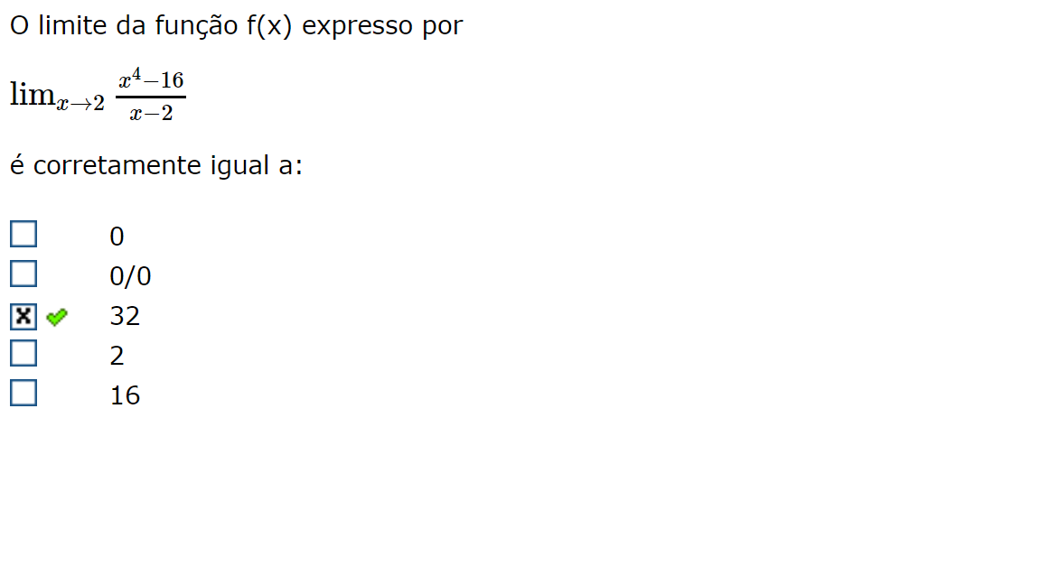 O limite da função f(x) expresso por lim x 2 x 4 16 x 2 é corretamente igual a
