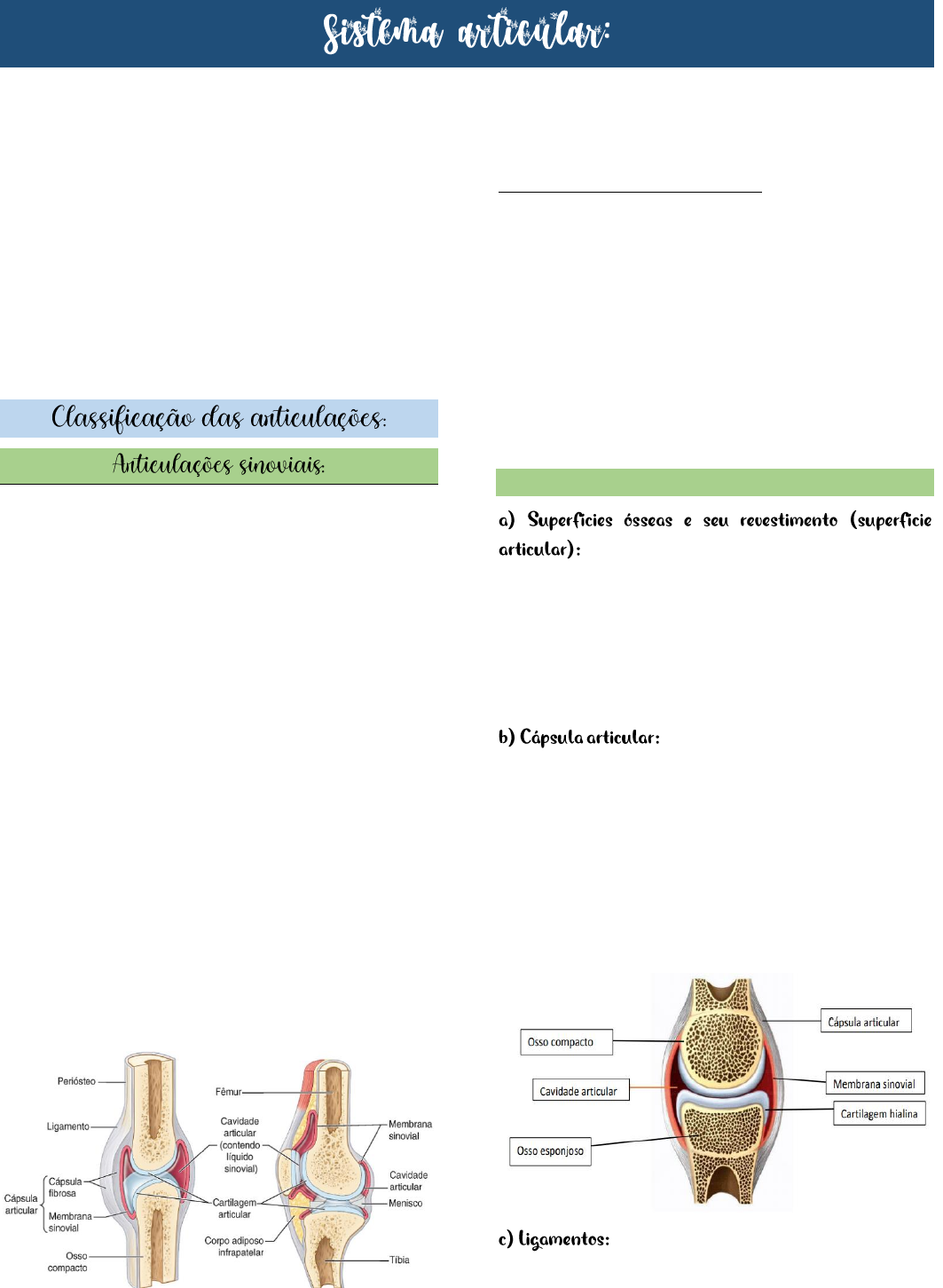 ➤Articulação é o conjunto de partes moles e duras que servem de união entre dois ou mais ossos. ➤As articulações são mais simples na cabeça, mais complicadas no tronco e de maior complexibilidade ao nível dos membros. ➤Sinartrose - pouca / nenhuma mobilidade (principalmente articulações fibrosas) ➤Anfiartrose - alguma mobilidade (principalmente articulações cartilaginosas) ➤Diartrose - elevada mobilidade (articulações sinoviais) ➤Também chamadas de diartroses ou móveis, possuem uma cavidade cheia de liquido sinovial, que funciona como um lubrificante. ➤Essas articulações possuem uma maior liberdade e são as mais encontradas no nosso corpo ➤A articulação é envolvida por uma cápsula que envolve a cavidade articular. ➤O interior da cápsula é coberto por uma membrana sinovial, que produz e secreta líquido sinovial que lubrifica a articulação, ajudando a reduzir o atrito entre as extremidades ósseas onde elas se articulam. ➤No interior da cápsula, a cartilagem articular cobre as faces articulares dos ossos; todas as outras faces internas são revestidas por membrana sinovial. ➤São mais encontradas ao longo dos membros ➤Para que uma articulação seja classificada como sinovial, os dois ossos adjacentes da articulação devem ser revestidos por cartilagem hialina. ➤A cápsula é reforçada ainda por ligamentos, tendões e músculo esquelético. ➤Essas articulações são capazes de uma ampla gama de movimentos e, consequentemente, são mais suscetíveis a luxações. Exemplos de articulações sinoviais: •a articulação esternoclavicular •o ombro •o cotovelo •o quadril •o joelho •a articulação radiocarpal •as articulações tibiofibulares proximais COMPONENTES ➤São aquelas que entram em contato em determinada articulação. Essas superfícies são revestidas em toda a sua extensão por cartilagem hialina (porção do osso que não foi ossificada). Por conta desse revestimento essas superfícies são lisas e polidas. ➤É uma membrana conjuntiva que envolve a articulação. ➤Apresenta duas camadas: uma fibrosa, externa e resistente e a membrana sinovial que é interna. Essa cápsula é muito vascularizada e inervada, sendo responsável pela produção de liquido sinovial, que contem ác. Hialurônico. Tem a função de nutrir e lubrificar as superfícies articulares. ➤São estruturas compostas de tecido conjuntivo fibroso que atuam na manutenção da posição dos ossos que se articulam nesse tipo de articulação, além de limitar movimentos indesejáveis. ➤Divididos em extra-capsulares e intra-capsulares Os ligamentos extracapsulares: ➤São ligamentos externos que auxiliam no fortalecimento da cápsula articular, que reveste toda a articulação. ➤Temos 5 ligamentos extracapsulares: ligamento da patela, ligamento colateral fibular, ligamento colateral tibial, ligamento poplíteo oblíquo e ligamento poplíteo arqueado. ➤Ainda podem se dividir em dois tipos: ligamento de reforço, os que se justapõem à cápsula articular para reforça-la e ligamentos à distância, apesar de estarem mais ou menos longe da cápsula, inserem-se nos ossos que participam da articulação. Os ligamentos intra-capsulares: ➤Estão localizados por dentro da cápsula, geralmente curtos e muito resistentes, encontramos na articulação do quadril e joelho. ➤São sacos fechados contendo liquido sinovial que se localizam entre os músculos ou em áreas onde tendões passam sobre um osso. ➤Bursite ocorre com mais frequência em articulações que fazem movimentos repetitivos frequentes, como ombro, cotovelo, quadril e joelho. 1 – Bursa subacromial 2 – Bursa subcoracoide 1 – Pré-patelar 2 – Infrapatelar superficial 3 – Infrapatelar profunda 4 – Suprapatelar 5 – Anseriana 6 – Iliotibial ➤Bolsa sinovial modificada que envolve e lubrifica os tendões dos músculos ➤Faixa de tecido que mantêm posicionados os tendões dos músculos. ➤Estrutura fibrocartilagínea que se estende em volta da cavidade da articulação. O lábio ajuda a aprofundar a cavidade articular. ➤São estruturas fibro-cartilaginosas encontradas em algumas articulações sinoviais. Essas estruturas tem a função de adaptar duas superfícies irregulares e também amortecer pressões, agindo como amortecedor. ➤Os meniscos são encontrados na articulação do joelho, já os discos são encontrados nas articulações esternoclavicular e temporomandibular. MOVIMENTOS: ➤Flexão: curvatura ou diminuição do ângulo entre os ossos ou partes do corpo. Nas articulações acima do joelho, a flexão refere-se ao movimento em direção anterior. ➤Extensão: retificação ou aumento do ângulo entre os ossos ou as partes do corpo. A extensão geralmente ocorre em direção posterior. ➤A articulação do joelho, que apresenta rotação de 180° em relação às articulações mais superiores, é excepcional, porque a flexão do joelho envolve o movimento posterior, e a extensão envolve movimento anterior. ➤Abdução: afastamento do plano mediano ➤Adução: aproximação do plano mediano ➤A rotação é o giro ou a revolução de uma parte do corpo ao redor de seu eixo longitudinal, como ao virar a cabeça para o lado ➤A rotação medial (interna) aproxima a face anterior de um membro do plano mediano, ao passo que a rotação lateral (externa) afasta a face anterior do plano mediano. ➤É um movimento circular que consiste em uma sequência de flexão, abdução, extensão e adução, de tal forma que a extremidade distal da parte se move em círculo e) Supinação e pronação: ➤Se realizam a nível do antebraço. Na supinação a palma da mão fica voltada para a frente e na pronação o oposto. ➤Encontramos esse tipo de movimento na articulação do tornozelo. ➤Inversão é o movimento para medial e eversão para lateral ➤Oclusão (fechamento): movimento em que ocorre o contato da arcada dentária superior com a inferior