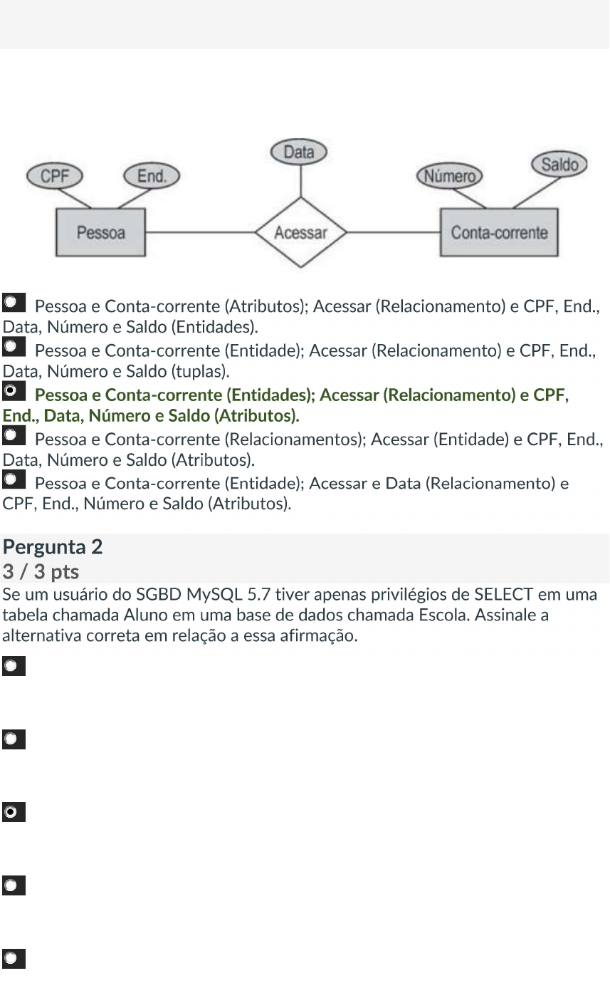 Pergunta 1 3 / 3 pts Com base na figura abaixo. Assinale a alternativa correta sobre as três classes de objetos utilizadas em bancos de dados relacionais: Pessoa e Conta-corrente (Atributos); Acessar (Relacionamento) e CPF, End., Data, Número e Saldo (Entidades). Pessoa e Conta-corrente (Entidade); Acessar (Relacionamento) e CPF, End., Data, Número e Saldo (tuplas). Pessoa e Conta-corrente (Entidades); Acessar (Relacionamento) e CPF, End., Data, Número e Saldo (Atributos). Pessoa e Conta-corrente (Relacionamentos); Acessar (Entidade) e CPF, End., Data, Número e Saldo (Atributos). Pessoa e Conta-corrente (Entidade); Acessar e Data (Relacionamento) e CPF, End., Número e Saldo (Atributos). Pergunta 2 3 / 3 pts Se um usuário do SGBD MySQL 5.7 tiver apenas privilégios de SELECT em uma tabela chamada Aluno em uma base de dados chamada Escola. Assinale a alternativa correta em relação a essa afirmação. Se o usuário executar o comando CREATE TABLE Aluno ele recriará a tabela Aluno. Se o usuário executar o comando SHOW TABLES ele verá todas as tabelas da base de dados Escola. Se o usuário executar o comando SHOW TABLE ele apenas verá a tabela Aluno. Se o usuário executar o comando DROP TABLE ele removerá a tabela Aluno. Se o usuário executar o comando SHOW TABLES ele apenas verá a tabela Aluno. Pergunta 3 3 / 3 pts Utilizando o SGBD MysQL 5.7, assinale a alternativa com o comando que removerá todos os privilégios de um usuário chamado “report” em uma base de dados chamada “Escola”. REVOKE ALL PRIVILEGES ON Escola.* FROM report; REVOKE ALL PRIVILEGES ON Escola.* FROM 'report'@'%'; REVOKE ALL PRIVILEGES IN Escola.* FROM 'report'@'%'; REVOKE ALL PRIVILEGES ON Escola.* TO 'report'@'%'; REVOKE PRIVILEGES ON Escola.* FROM 'report'@'%'; Pergunta 4 3 / 3 pts Quando olhamos elementos ou objetos do nosso mundo que são formados por pequenas partes estamos realizando mentalmente algo chamado de ___________. Um exemplo disso seria a observação de várias partes de uma motocicleta como: motor, rodas, corrente, freio, tanque de combustível, entre outros. agregação da abstração. generalização. observação. decomposição. composição. Pergunta 5 3 / 3 pts Quais comandos SQL estão vinculados a função DCL – Data Control Language, em português: Linguagem de Controle de Dados. GRANT e REVOKE. SELECT. INSERT, UPDATE e DELETE. SELECT, UPDATE e DELETE. CREATE, ALTER e DROP. Pergunta 6 3 / 3 pts O processo chamado de ________ é utilizado por nós para definir o conceito de uma classe de objetos ou coisas do mundo real caracterizadas por propriedades comuns. Fazemos isso espontaneamente e diariamente. dados. informações. relacionamento. abstração. elementos Pergunta 7 3 / 3 pts É o campo que estabelece o relacionamento entre duas tabelas. Assim, uma coluna corresponde à mesma coluna que é a chave primária de outra tabela. Estamos falando sobre um(a): Constraint. Chave estrangeira. Atributo. Chave primária. Restrição. Pergunta 8 3 / 3 pts Com base no SGBD MySQL 5.7 e nas tabelas “Funcionario”. Assinale a alternativa correta para a consulta que trarão as seguintes informações: menor e maior salário dos funcionários. Estas informações deverão aparecer com alias Menor_salario e Maior_salario, respectivamente. SELECT MIN(salario) AS Menor_salario, MAX(salario) AS Maior_salario FROM Funcionario; SELECT MINIMO(salario) AS Menor_salario, MAXIMO(salario) AS Maior_salario FROM Funcionario; SELECT MIN(salario) AS Menor_salario, MAX(salario) AS Maior_salario FROM Departamento; SELECT MIN(salario), MAX(salario) FROM Funcionario; SELECT MIN(salario) AS Menor_salario, AND SELECT MAX(salario) AS Maior_salario FROM Funcionario; Pergunta 9 3 / 3 pts Quais comandos SQL estão vinculados a função DML – Data Manipulation Language, em português: Linguagem de Manipulação de Dados. SELECT, UPDATE e DELETE. SELECT. INSERT, UPDATE e DELETE. CREATE, ALTER e DROP. GRANT e REVOKE. Pergunta 10 3 / 3 pts Sobre a cardinalidade em um banco de dados relacional e segundo as imagens abaixo. Podemos afirmar que: (A) um-para-um; (B) um-para-muitos; (C) muitos-para-um; (D) muitos-para- muitos. (A) um-para-um; (B) um-para-muitos; (C) muitos-para-muitos; (D) um-para- muitos. (A) um-para-muitos; (B) um-para-um; (C) muitos-para-um; (D) muitos-para- muitos. (A) muitos-para-um; (B) um-para-muitos; (C) muitos-para-um; (D) um-para-um. (A) um-para-um; (B) muitos-para-um; (C) um-para-muitos; (D) muitos-para- muitos.