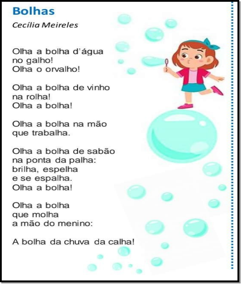 Avaliação de Língua Portuguesa Nível Alfabético 01) Leia o poema abaixo: · Qual o gênero textual do texto que você leu? ( ) Receita ( ) Bilhete ( ) Poema 02) Todas as estrofes possuem têm o mesmo número de versos? __________ 03) Complete: a) O poema está dividido em__________estrofes. b) O poema possui ________ versos. 04) Sobre o que o texto fala? Qual o assunto? _______________________________________________________________ 05) Qual é o título do poema? ______________________________________________________________ 06) Quem é a autora do poema? _______________________________________________________________ 07) Para saber mais... · Poema é um... ____________________________________________________________________________________________________________________________________ 08) Quando o verso diz “Olha a bolha na mão que trabalha”, o que ele quer dizer? 09) Poemas contém rimas. As rimas acontecem quando palavras diferentes possuem a sonoridade parecida, por exemplo, MAMÃO E SABÃO. Leia e depois complete as palavras de acordo com as suas rimas: BOLHA MOLHA GALHO ESPALHA ESPELHA ROLHA OLHA ORVALHO 10) HORA DA PRODUÇÃO: Brincando de Bom Proveito!! Avaliação de Língua Portuguesa Nível Silábico 01) Leia o poema abaixo: · Qual o gênero textual do texto que você leu? ( ) Receita ( ) Bilhete ( ) Poema 02) Todas as estrofes possuem têm o mesmo número de versos? ( ) sim ( ) não 03) Faça o que se pede: a) Enumere os versos do poema. b) Circule as estrofes do poema. 04)Vamos fazer rimas? Complete os espaços escrevendo o nome das figuras que rimam entre si. 05) Pinte o título do poema. 06) Circule, no texto acima, o nome da autora do poema 07) Para saber mais... · Poema é um... ____________________________________________________________________________________________________________________________________ 08) Quando o verso diz “Olha a bolha na mão que trabalha”, o que ele quer dizer? 09) Poemas contém rimas. As rimas acontecem quando palavras diferentes possuem a sonoridade parecida, por exemplo, MAMÃO E SABÃO. Leia e depois ligue as palavras de acordo com as suas rimas: BOLHA MOLHA GALHO ESPALHA ESPELHA ROLHA OLHA ORVALHO 10) HORA DA PRODUÇÃO: Brincando de Bom Proveito!! Avaliação de Língua Portuguesa Nível Silábico-Alfabético 01)Leia o poema abaixo: · Qual o gênero textual do texto que você leu? ( ) Receita ( ) Bilhete ( ) Poema 02) Todas as estrofes possuem têm o mesmo número de versos? __________ 03) Complete: a) O poema está dividido em__________estrofes. b) O poema possui ________ versos. 04) Vamos fazer rimas? Complete os espaços escrevendo o nome das figuras que rimam entre si. 05) Qual é o título do poema? ______________________________________________________________ 06) Circule, no texto acima, o nome da autora do poema? 07) Para saber mais... · Poema é um... ____________________________________________________________________________________________________________________________________ 08) Quando o verso diz “Olha a bolha na mão que trabalha”, o que ele quer dizer? 09) Poemas contém rimas. As rimas acontecem quando palavras diferentes possuem a sonoridade parecida, por exemplo, MAMÃO E SABÃO. Leia e depois ligue as palavras de acordo com as suas rimas: BOLHA MOLHA GALHO ESPALHA ESPELHA ROLHA OLHA ORVALHO 10) HORA DA PRODUÇÃO: Brincando de Bom Proveito!!