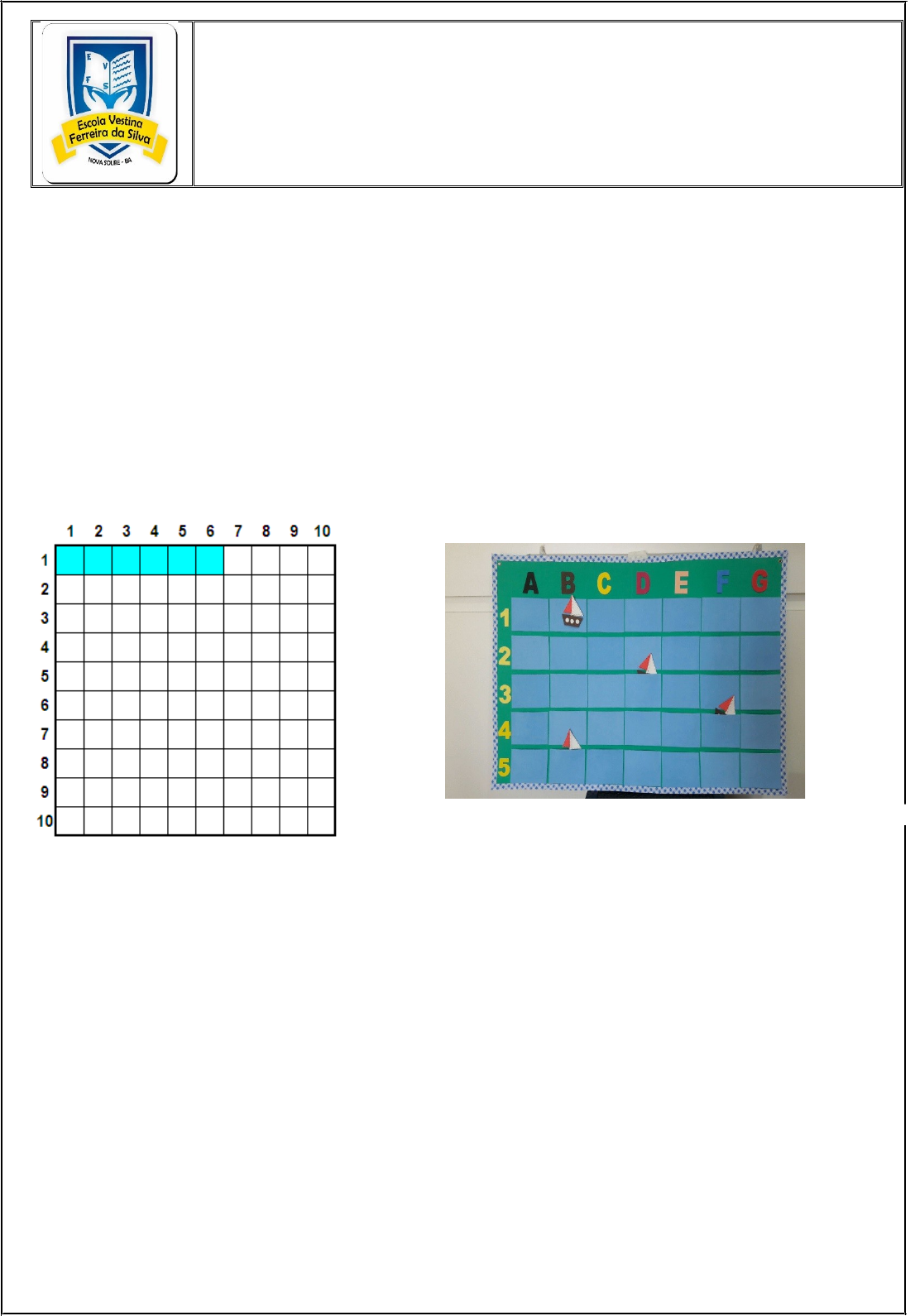 ESCOLA ESTADUAL VESTINA FERREIRA DA SILVA ALUNO (A) _______________________________________________ PROFESSOR (A): Marcos Carvalho Rodrigues COMPONENTE CURRICULAR (DISCIPLINA): Matemática SÉRIE/ANO: 6º TURMA: C DATA ____/____/2021 Plano cartesiano Você sabe o que são coordenadas geográficas? Quando queremos localizar um ponto na superfície da Terra, podemos utilizar as coordenadas geográficas desse ponto: a longitude e a latitude. Para compreender como funciona um sistema de coordenadas, você pode começar com uma malha quadriculada, indicando as linhas com números e as colunas com letras, como a seguir. (OBS: você já deve ter visualizado uma malha quadriculada antes, em um joguinho chamado “Batalha naval” tanto jogando, como assistindo os programas infantis). Exemplos: BATALHA NAVAL MALHA QUADRICULADA Para localizar elementos nas malhas quadriculadas, que pode ser o joguinho de batalha naval por exemplo, primeiro informamos a coluna (indicada pela letra) e, depois, a linha (indicada pelo número). Os barquinhos por exemplo, do jogo “Batalha naval” acima, estão localizados assim: (B,1); (B,4); (D,2) e (F,3). Atividades 1- De acordo com o que foi estudado sobre o sistema de coordenadas, indique a posição dos objetos na malha quadriculada a seguir: (OBS: Lembre que primeiro no sistema de coordenada primeiro vem o valor da coluna(abscissa), depois o valor da linha(ordenada). 2- O professor de Geografia construiu uma malha quadriculada em cima do mapa do Brasil. De acordo com o texto explicativo, qual são as coordenadas que cobrem a maior parte do estado de Santa Catarina? 3- Ainda de acordo com o mapa da questão anterior, quais as coordenadas do estado da Bahia? Relembrando conceitos: Vértice: é o ponto onde se encontram as retas dos sólidos geométricos. Aresta: são as retas que formam os sólidos. Face: são os lados dos sólidos. Confira o exemplo abaixo: 4- De acordo com o que foi explicado acima em “Relembrando conceitos”, descreva quantas vértices, faces e arestas tem o paralelogramo(figura superior a esquerda); o trapézio(figura inferior a esquerda), e o losango(figura à direita). 5- Ainda de acordo com o exercício anterior, dê as coordenadas dos vértices de cada uma figura no plano cartesiano. Paralelogramo: Trapézio: Losango: