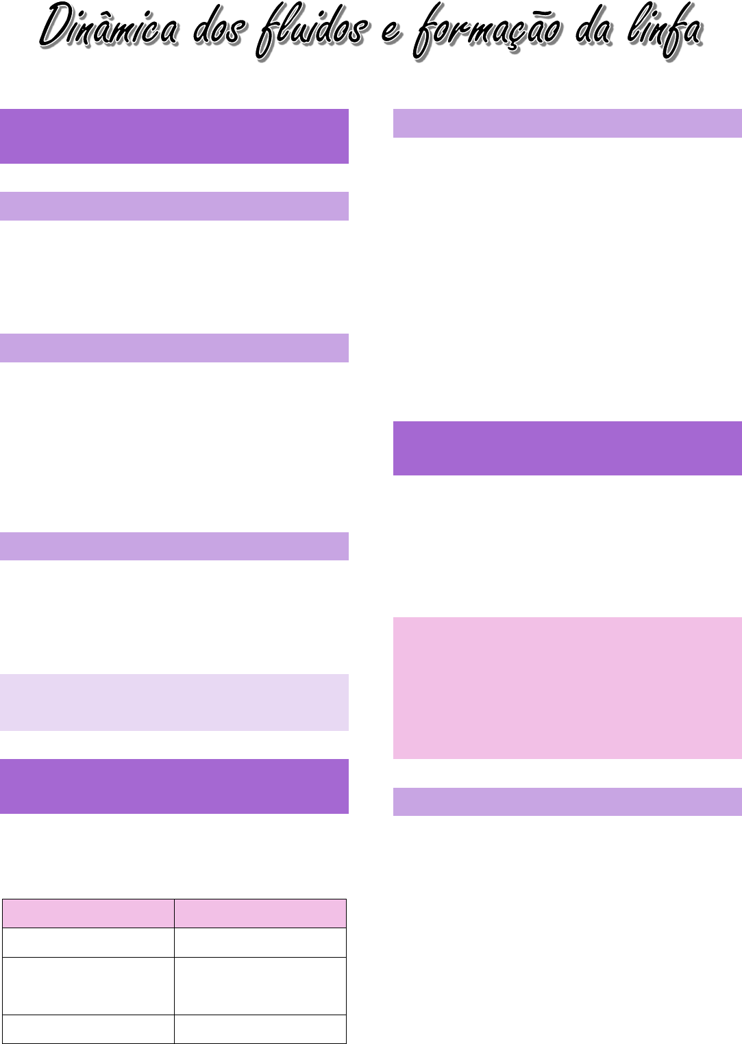 Ações do sistema linfático Drenagem dos excessos de líquidos O sistema linfático drena de volta para o sangue os excessos de líquidos acumulados no espaço intersticial. Drenagem de outras substâncias Além disso, o sistema linfático também é responsável por drenar pequenas células, macromoléculas e proteínas que não conseguem voltar para a circulação sanguínea pelas vias convencionais. Auxílio ao sistema imunológico Por fim, o sistema linfático também é o grande auxiliar do sistema imunológico, já que ele contém células de defesa, como linfócitos e macrófagos: a) Linfócitos: produção de anticorpos; b) Macrófagos: fagocitose de agentes invasores. Localização dos líquidos Nosso corpo é formado em grande parte por água e, dependendo do local onde esse líquido se encontra, ele pode receber diferentes nomenclaturas: Localização Nomenclatura Plasma Plasma sanguíneo Espaço intersticial (espaço entre células) Líquido intersticial Dentro das células Hialoplasma Transporte de substâncias Esses líquidos, quando entram no sistema linfático, recebem o nome de linfa. Eles estão se locomovendo de maneira dinâmica no corpo, porque a água do corpo serve como um veículo de transporte de substâncias. O oxigênio e os nutrientes são transportados pelo sangue até as células através desses fluidos. Toda essa dinâmica de transporte de líquidos é feita através da água. Capilar sanguíneo Os capilares são os vasos sanguíneos extremamente finos, que chegam efetivamente perto das células para deixar o oxigênio e os nutrientes, enquanto recebem o gás carbônico proveniente do metabolismo da célula. a) Capilar arterial: perto das artérias com sangue oxigenado; b) Capilar venoso: conforme esse oxigênio passa para os tecidos, ele chega perto das veias, que recolhem o sangue e levam de volta ao coração. Pressão hidrostática Quando o sangue chega perto das artérias através dos capilares arteriais, ele chega com uma pressão maior. Essa pressão que o sangue exerce dentro do capilar sanguíneo é chamada de pressão hidrostática (pressão exercida pelo líquido). Perto das artérias, a pressão hidrostática é mais alta que a pressão fora do capilar. Por essa diferença de pressão, parte dessa água vai sair para o interstício junto com o oxigênio e junto com os nutrientes. Conforme o sangue vai saindo do capilar sanguíneo e a água vai saindo desse capilar, a pressão hidrostática diminui, pois vai diminuindo a quantidade de líquidos dentro do capilar. Pressão oncótica A pressão oncótica é a pressão exercida pela concentração de proteínas no sangue. Ela atrai a água para onde a concentração de proteínas é maior, para diluir o ambiente muito concentrado. Logo, próximo ao capilar venoso, tem-se uma menor pressão hidrostática pela saída de água e uma maior pressão oncótica, já que as proteínas sanguíneas ficaram muito concentradas. No capilar venoso, pela maior pressão oncótica, esse líquido que está no espaço intersticial retorna ao capilar venoso, para diluir a alta concentração proteica, voltando com gás carbônico e parte de resíduos metabólicos. a) 90% de líquido intersticial retorna ao sangue pelos capilares sanguíneos; b) 10% de líquido é absorvido pelos capilares linfáticos, juntamente com pequenas células, proteínas e macromoléculas que não conseguem retornar pelos vasos sanguíneos, em razão da sua baixa permeabilidade em relação aos linfáticos. Os líquidos absorvidos pelo sistema linfático são posteriormente encaminhados de volta à circulação sanguínea. Relação pressão hidrostática X oncótica a) Capilares sanguíneos arteriais: maior pressão hidrostática (que empurra os fluidos para o meio intersticial, ou seja, para fora do capilar sanguíneo) e menor pressão oncótica; b) Capilares sanguíneos venosos: menos pressão hidrostática e maior pressão oncótica (que puxa 90% desse líquido de volta ao capilar sanguíneo e outros 10% que são absorvidos pelos capilares linfáticos). Quando esse líquido entra nos capilares linfáticos, ele recebe o nome de linfa. Ultrafiltração e absorção venosa A saída dos líquidos para fora dos capilares linfáticos pela maior pressão hidrostática é chamada de ultrafiltração. Por outro lado, a volta de 90% desse líquido aos capilares sanguíneos é a absorção venosa, pela maior pressão oncótica do capilar, enquanto os 10% absorvidos pelo sistema linfático é um processo chamado de absorção linfática.