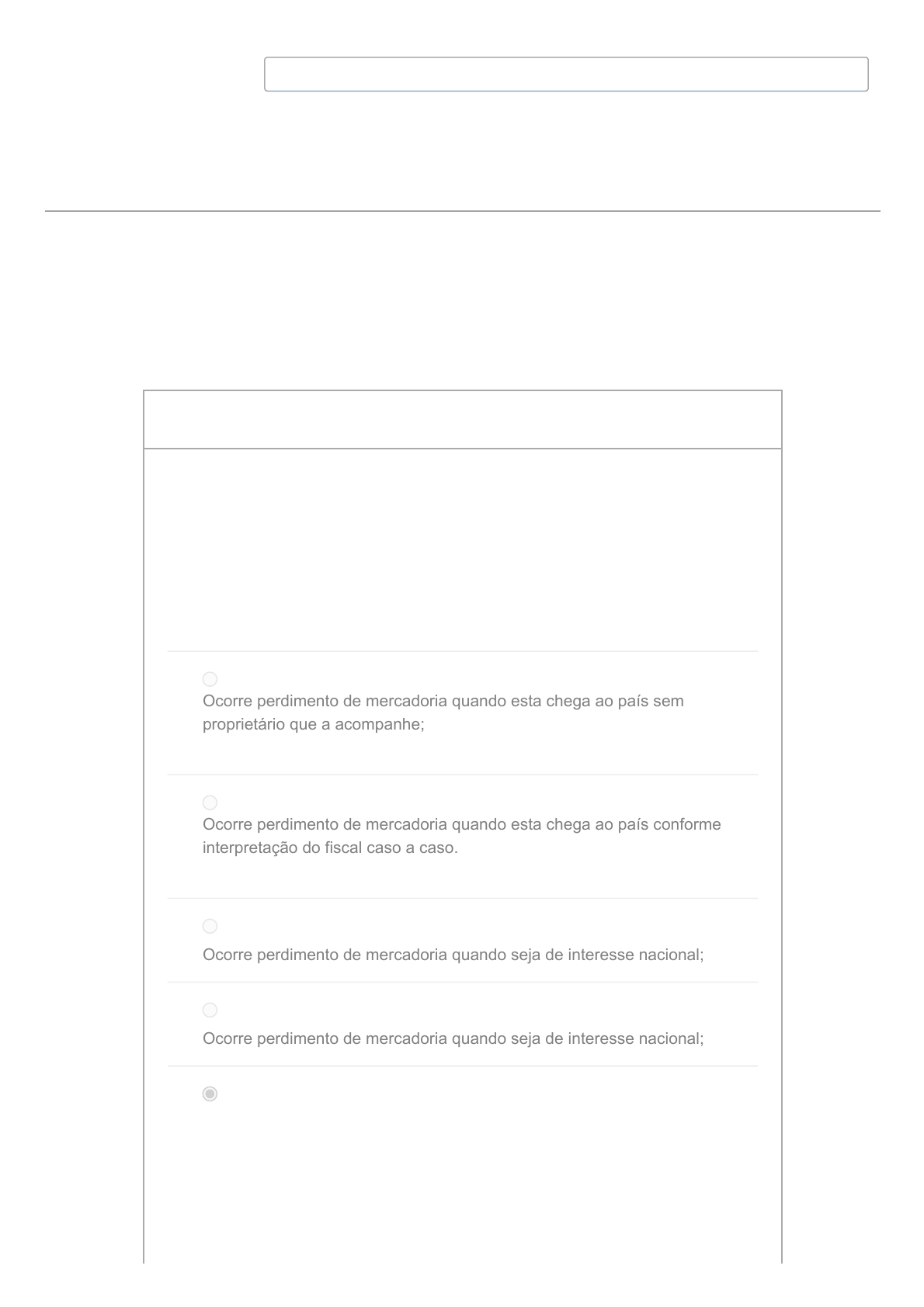 05/10/2021 09:07 ALEXANDRE JOSE MATIAS DA FONSECA, histórico de teste: Prova Eletrônica https://dombosco.instructure.com/courses/7432/quizzes/20593/history?version=2 1/10 Seu Progresso: 100 % Prova Eletrônica Resultados para ALEXANDRE JOSE MATIAS DA FONSECA As respostas corretas estarão disponíveis em 9 out em 0:00. Pontuação desta tentativa: 21 de 30 Enviado 3 out em 14:53 Esta tentativa levou 21 minutos. 3 / 3 ptsPergunta 1 Além das hipóteses previstas em lei para o perdimento de veículo, existe também a hipótese de perdimento de carga ou mercadoria, quando sua importação ou exportação configure dano ao erário público. A respeito do tema, assinale a alternativa correta. Ocorre perdimento de mercadoria quando esta chega ao país sem proprietário que a acompanhe; Ocorre perdimento de mercadoria quando esta chega ao país conforme interpretação do fiscal caso a caso. Ocorre perdimento de mercadoria quando seja de interesse nacional; Ocorre perdimento de mercadoria quando seja de interesse nacional; Ocorre perdimento de mercadoria quando esta chega ao país com falsa declaração de conteúdo; 05/10/2021 09:07 ALEXANDRE JOSE MATIAS DA FONSECA, histórico de teste: Prova Eletrônica https://dombosco.instructure.com/courses/7432/quizzes/20593/history?version=2 2/10 Conforme Art. 689 do regulamento aduaneiro: “ Aplica-se a pena de perdimento da mercadoria nas seguintes hipóteses, por configurarem dano ao Erário XII - estrangeira, chegada ao País com falsa declaração de conteúdo”. 0 / 3 ptsPergunta 2IncorretaIncorreta “A função principal do controle e dos tributos aduaneiros, não é prover aumento da arrecadação, mas servir como instrumento de controle e proteção da economia. Afinal, a aduana fiscaliza a operação de comércio exterior mesmo quando o bem é objeto de imunidade ou benefício fiscal.” (LUZ, Rodrigo. Comércio Internacional e Legislação Aduaneira. Elsevier, São Paulo: 2013, pág. 53). Assim, assinale a alternativa que melhor corresponde às regras e formas de atuação da aduana brasileira. I – Controle aduaneiro de veículos; II – Dos impostos de Importação e de Exportação; III – Do controle aduaneiro de mercadorias; IV – Do controle das condições sanitárias daqueles que entram no país; V – Das infrações e penalidades. I, II, III e V; I, IV e V; III, IV e V; II, IV, e V; III apenas. 05/10/2021 09:07 ALEXANDRE JOSE MATIAS DA FONSECA, histórico de teste: Prova Eletrônica https://dombosco.instructure.com/courses/7432/quizzes/20593/history?version=2 3/10 0 / 3 ptsPergunta 3IncorretaIncorreta Conforme aponta o Regulamento Aduaneiro, o despacho de exportação é o procedimento mediante o qual é verificada a exatidão dos dados declarados pelo exportador em relação à mercadoria, aos documentos apresentados e à legislação específica, com vistas a seu desembaraço aduaneiro e a sua saída para o exterior. A esse respeito, considere as alternativas abaixo: I - O despacho de exportação (e também o de importação) inicia-se no ambiente virtual do Siscomex, com o registro das mercadorias e dados relativos à operação, e continua com a parametrização da operação; II - O despacho de exportação inicia-se no ambiente virtual do Siscomex, com o registro das mercadorias e dados relativos à operação, e só há a parametrização da operação no caso das importações; III - Toda conferência aduaneira ocorre em recinto alfandegado, e só há recinto alfandegado em zonas primárias; IV - O exportador sabe, previamente, para qual canal de parametrização sua carga será destinada; V -A conferência aduaneira tem por finalidade identificar o exportador ou importador, verificar a mercadoria e a correção das informações relativas a sua natureza, a classificação fiscal, e confirmar o cumprimento de todas as obrigações. Assinale a alternativa que corresponde às afirmações corretas: III, V; III, IV, V; I, V. I, III, IV, V; II, III, IV, V; 05/10/2021 09:07 ALEXANDRE JOSE MATIAS DA FONSECA, histórico de teste: Prova Eletrônica https://dombosco.instructure.com/courses/7432/quizzes/20593/history?version=2 4/10 3 / 3 ptsPergunta 4 Existem várias maneiras pelas quais empresas interagem com seus clientes e fornecedores. Da mesma forma, existe uma forma de interação entre as empresas e os órgãos anuentes no comércio exterior brasileiro. Essa interação é feita: Por grupo de WhatsApp. Pelo Siscomex; Por email; Por meio telefônico; Pelo site da Receita Federal; Por meio do Siscomex, a empresa interage com os órgãos anuentes” (LUZ, 2013, p.2). 3 / 3 ptsPergunta 5 Entre as várias modalidades de sanções previstas em lei, está a hipótese de perdimento de veículo. Isso ocorre quando, por exemplo, um determinado automóvel é apreendido pela Receita Federal por configurarem dano ao Erário. A respeito desse tema, marque a alternativa correta. Ocorre quando é descoberta, por exemplo, mercadorias lícitas escondidas em fundo falso; 05/10/2021 09:07 ALEXANDRE JOSE MATIAS DA FONSECA, histórico de teste: Prova Eletrônica https://dombosco.instructure.com/courses/7432/quizzes/20593/history?version=2 5/10 Ocorre quando descobre-se que o veículo brasileiro reentrando em território nacional está com o IPVA em atraso; Ocorre quando o veículo transportador estiver em situação ilegal, quanto às normas que o habilitem a exercer a navegação ou o transporte internacional correspondente à sua espécie; Ocorre quando descobre-se, no veículo, pessoa portando documento falso; Ocorre quando o veículo transportador esteja entrando no país com mais pessoas do que sua capacidade original. Conforme artigo 688 inciso I do Regulamento Aduaneiro: “Art. 688. Aplica-se a pena de perdimento do veículo nas seguintes hipóteses, por configurarem dano ao Erário I - quando o veículo transportador estiver em situação ilegal, quanto às normas que o habilitem a exercer a navegação ou o transporte internacional
