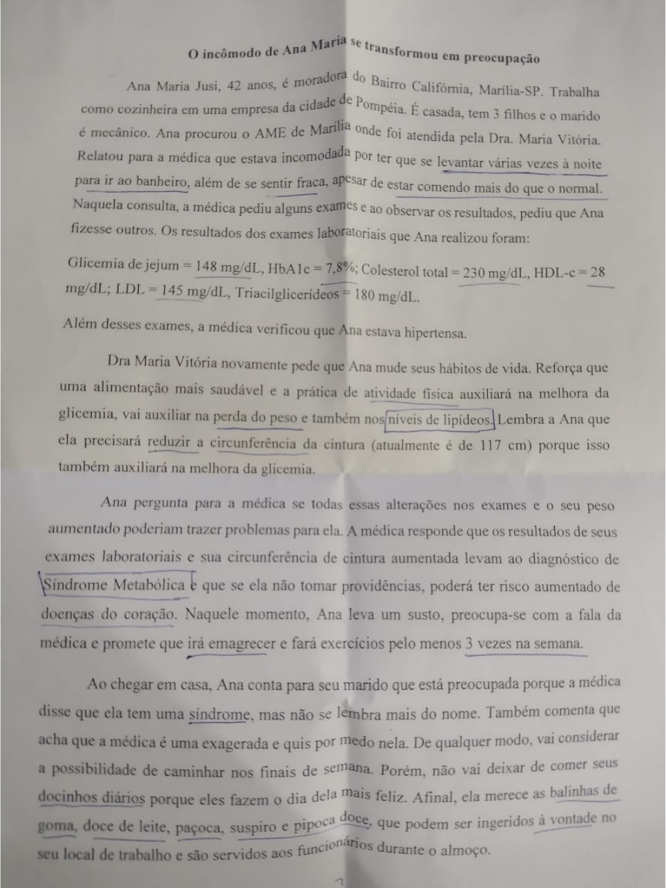 ABERTURA CASO – SÍNDROME METABÓLICA 1. O que é uma síndrome metabólica? Como se dá seu diagnóstico? SÍNDROME METABÓLICA -É a combinação de condições que relacionam o excesso de peso (ou alta concentração de gordura visceral), propensão a desenvolver diabetes tipo 2 e problemas cardíacos (HAS, aterosclerose). a esta combinação de condições foi dado o nome de Síndrome Metabólica. Essa síndrome contribui diretamente para o desenvolvimento de doenças cardiovasculares, aparecimento de DM2, aumenta o risco de morte prematura, doença renal, doença mental e de câncer. -O diagnóstico é dado a partir da apresentação de pelo menos 3 ou mais, dos seguintes critérios: • Obesidade (visceral) central aumento da circunferência abdominal, sendo os→ parâmetros utilizados: Homem: >102 cm Mulher: >88 cm • Pressão arterial alta: acima de 130/85, ou se está utilizando algum medicamento para reduzir a pressão. A alteração da pressão pode estar relacionada com a hiperinsulinemia, a qual aumenta a retenção de sódio nos túbulos renais (cotransportador SGLT1 de glicose e sodio), fazendo com que aumentasse a pressão. • Glicose elevada: igual ou acima de 110 mg/dl em decorrência da resistência → a ação da insulina, ou da sua não produção. • Triglicerídeos elevados (igual ou acima de 150 mg/dl). • Baixo HDL, sendo risco em homens estar menor que 40 mg/dl e em mulher estar menor ou igual a 50 mg/dl. -Na síndrome metabólica, a glicose sanguínea encontra-se levemente elevada, devido à capacidade reduzida de remover a glicose sanguínea (resistência a insulina). Isso ocorre devido a diminuição da expressão do receptor tirosina cinase, provavelmente, por uma down regulation, (alta estimulação do receptor de insulina, leva a uma sinalização que diminui a transcrição de genes e ação de enzimas, relacionadas com a expressão do receptor). Com isso, o receptor tem a diminuição da sinalização para promover a translocação dos GLUT4, levando a não interiorização da glicose, a qual permanece alta na circulação. -Além disso, pessoas com essa síndrome, apresentam com frequência, alterações nas proteínas sanguíneas, associadas com a coagulação anormal (alta concentração de fibrinogênio) ou inflamação (alta concentração de peptídeo C reativo) 2. Quais são os fatores de risco para a síndrome metabólica? Qual a relação da diabetes com a síndrome metabólica? FATORES DE RISCO -A síndrome ocorre com mais frequência entre os africanos, hispânicos (antecedência espanhola), asiáticos e americanos nativos. -As chances de um indivíduo desenvolver a síndrome aumenta com o envelhecimento -Aumento do peso, principalmente na região abdominal (circunferência da cintura) -Histórico de diabetes na família -Níveis elevados de gordura no sangue (triglicerídeos elevados) -Baixo HDL -Pressão sanguínea alta -Glicose elevada -Mulheres com corpo em forma de maçã (cintura larga) são mais propensas a desenvolver a síndrome do que aquelas com corpo em formato de pera; SÍNDROME METABÓLICA E DIABETES -A síndrome metabólica precede/ aparece antes que a diabetes no indivíduo. –A diabetes tipo 2, provém da incompatibilidade entre a produção e a necessidade de insulina. Os pacientes com diabetes são, normalmente, adultos, com algum grau de obesidade. No início da doença a maioria não precisa de insulina para sobreviver, mas as células betas se deterioram com o tempo e acabam precisando de insulina para atingir um controle adequado da glicose. -A predisposição do indivíduo com a síndrome metabólica desenvolver diabetes está relacionada com a hipótese da “toxicidade lipídica” • Os adipócitos são sensíveis à insulina e produzem leptina levando a → deposição intracelular contínua de TAG. • O excesso de ingestão calórica em obesos, faz os adipócitos ficarem repletos de TAG (adipócito hipertrofiado). A alta ingestão de glicose, leva a liberação da insulina que age no tecido adiposo, o qual possui GLUT4 e interioriza a glicose, armazenando-a na forma de TAG como forma de energia. • O tecido adiposo, é um tecido endócrino, o qual produz adipocinas (substâncias proteicas) que são liberadas no sangue. Quando o adipócito hipertrofia, ele libera no sangue alta quantidade de duas adipocinas (TNFalfa e resistina). • Essas adipocinas vão para o sangue e agirão no músculo esquelético, inibindo a sinalização da insulina. • O músculo passa a captar a glicose de forma mais lenta, com isso, a glicose se mantém alta no sangue e estimula o pâncreas a liberar mais insulina. • Nesse estado o indivíduo encontra-se com hiperglicemia e hiperinsulinemia • Com isso, os adipócitos armazenam ainda mais essa energia em forma de triglicerídeo hipertrofia ainda mais o tecido adiposo aumenta a liberação → → de adipocinas aumenta a resistência a insulina no músculo, devido inibição → das adipocinas aumenta a concentração de glicose no sangue, pois ela não → está sendo captada aumenta a liberação de insulina estimula o tecido → → adiposo a captar mais glicose o ciclo continua…→ • As adipocinas vão agir também no fígado, fazendo com que ele libere mais glicose na corrente sanguínea, estimulando mais ainda a liberação de insulina e continuação deste ciclo. • Com isso, o tecido adiposo libera fatores proteicos (MCP-1 – Proteina-1 de quimiotaxia de monócitos) que atraem macrófagos, os quais se infiltram nos tecidos e desencadeiam uma resposta inflamatória que prejudica a deposição dos ácidos graxos e favorece sua liberação para o sangue, devido a produção de TNF-alfa (fator alfa de necrose tumoral). • O excesso de ácidos graxos na circulação entra nas células hepáticas e musculares, aonde é convertido em TAG e se acumulam em gotículas lipídicas. • Essa deposição ectópica de TAG, leva a insensibilidade à insulina no fígado e no 