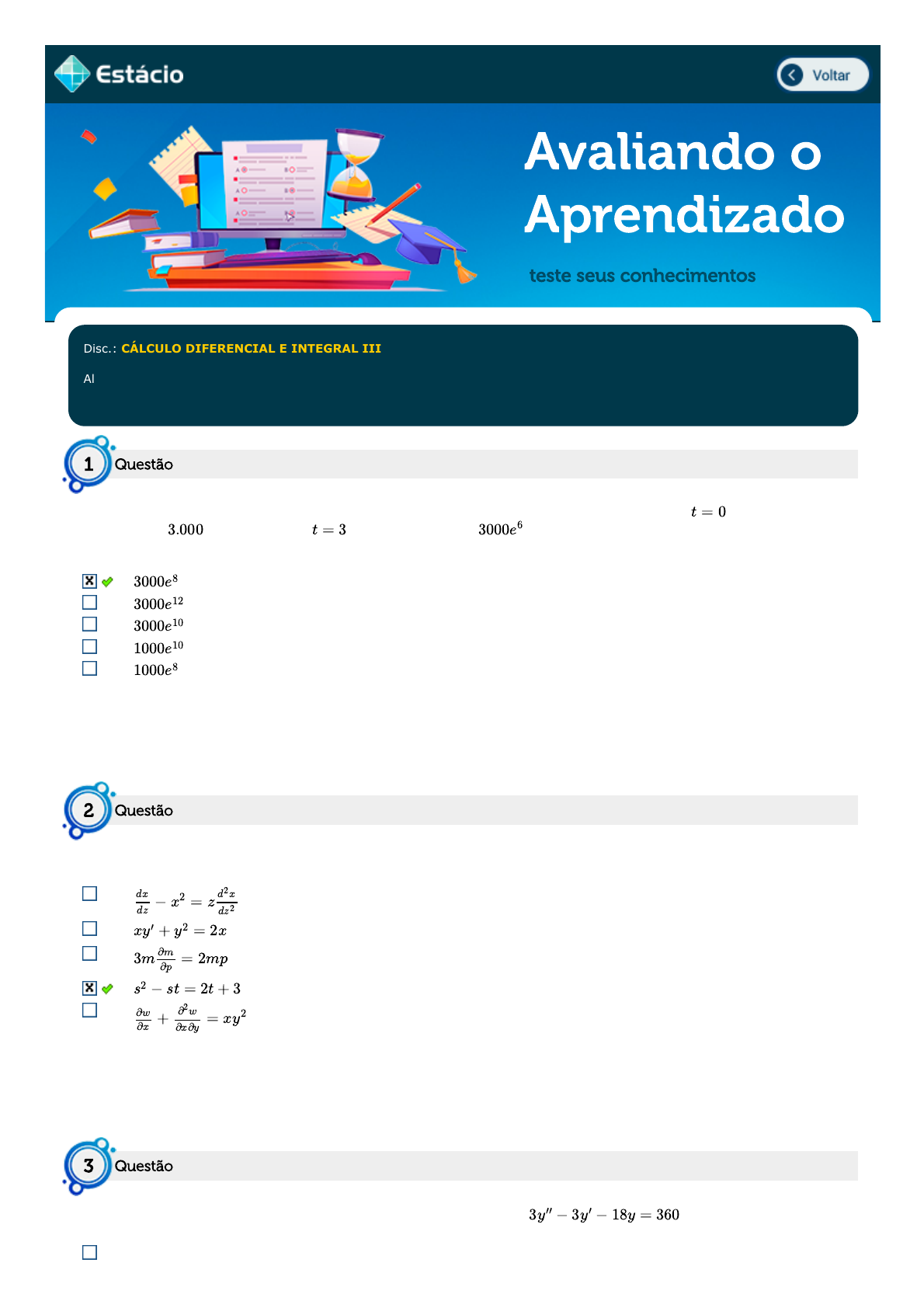 05/10/2021 11:50 Estácio: Alunos https://simulado.estacio.br/bdq_simulados_linear_view.asp 1/4 Avaliando o Aprendizado teste seus conhecimentos Disc.: CÁLCULO DIFERENCIAL E INTEGRAL III Aluno(a): DOUGLAS DOS SANTOS LACERDA Matríc.: 202008017564 Acertos: 6 de 10 05/10/2021 (Finaliz.) Acerto: 1,0 / 1,0 Um crescimento populacional é modelado por um crescimento exponencial. Sabe-se que para a população se encontra em espécies e para anos se encontram espécies. Determine a população para um instante de tempo de 4 anos: Respondido em 05/10/2021 11:12:24 Compare com a sua resposta: Acerto: 1,0 / 1,0 Marque a alternativa que NÃO apresenta uma equação diferencial: Respondido em 05/10/2021 11:13:44 Compare com a sua resposta: Acerto: 1,0 / 1,0 Determine a solução geral da equação diferencial de segunda ordem . t = 0 3.000 t = 3 3000e6 3000e8 3000e12 3000e10 1000e10 1000e8 − x2 = z dx dz d2x dz2 xy ′ + y2 = 2x 3m = 2mp ∂m ∂p s2 − st = 2t + 3 + = xy2∂w ∂x ∂2w ∂x∂y 3y ′′ − 3y ′ − 18y = 360 Questão1 Questão2 Questão3 https://simulado.estacio.br/alunos/inicio.asp javascript:voltar(); 05/10/2021 11:50 Estácio: Alunos https://simulado.estacio.br/bdq_simulados_linear_view.asp 2/4 Respondido em 05/10/2021 11:14:38 Compare com a sua resposta: Acerto: 0,0 / 1,0 Seja a equação diferencial . Sabe-se que as funções e são soluções da equação dada. Determine uma solução que atenda à condição de contorno e . Respondido em 05/10/2021 11:45:28 Compare com a sua resposta: Acerto: 0,0 / 1,0 Marque a alternativa correta relacionada à série É divergente É convergente com soma É convergente com soma É convergente com soma É convergente com soma Respondido em 05/10/2021 11:45:34 Compare com a sua resposta: Acerto: 1,0 / 1,0 Determine o valor da soma da série 6 48 12 96 24 Respondido em 05/10/2021 11:45:36 Compare com a sua resposta: y = axe−2x + bxe3x − 20, a e b reais. y = ae2x + be−3x + 20, a e b reais. y = axe−2x + be3x − 10, a e b reais. y = ae−2x + bxe3x − 10, a e b reais. y = ae−2x + be3x − 20, a e b reais. y ′′ + 2y ′ − 3 = 0 y = exp(x) y = exp(−3x) y(0) = 2 y ′(1) = e − 3e−3 2e2x + e−4x 2ex + 3e−x ex + e−3x ex + 2e−3x 2ex − 2e−3x Σn1 2 (k+3)(k+5) 9 10 9 20 1 4 8 5 Σn1 2 n+231−n Questão4 Questão5 Questão6 05/10/2021 11:50 Estácio: Alunos https://simulado.estacio.br/bdq_simulados_linear_view.asp 3/4 Acerto: 0,0 / 1,0 Determine a equação algébrica na variável de Laplace que auxiliará no cálculo da equação diferencial 2y'' + 3y' + y = 0 sabendo que y(0) = 1 e y'(0) = 1. Respondido em 05/10/2021 11:45:43 Compare com a sua resposta: Acerto: 0,0 / 1,0 Marque a alternativa que apresenta a transformada de Laplace para função f(t) = 3t. Respondido em 05/10/2021 11:45:47 Compare com a sua resposta: Acerto: 1,0 / 1,0 Seja um circuito RL em série com resistência de 20 Ω e indutor x, medido em H. A tensão é fornecida através de uma fonte contínua de 200V ligada em t = 0s. Determine ao valor de x sabendo que a tensão no indutor após 10 segundos é de 100 e ¿ 200. 1 2 5 4 3 Respondido em 05/10/2021 11:46:05 Compare com a sua resposta: Acerto: 1,0 / 1,0 Seja um recipiente que contém, inicialmente, 2000 l de água e 100 kg de sal. É Inserida no recipiente uma solução (água salgada) com uma concentração de 5 kg de sal por litro de água, a uma taxa fixa de 25 L/min. Esta solução é 2s+2 (2s2+3s+1) 2s−1 (2s2−3s+1) 2s+2 (2s2−3s+1) 2s (2s2+3s+1) 2s−1 (2s2+3s+1) 3 s+9 1 s+3 3 s2 s s2+9 s s2−9 Questão7 Questão8 Questão9 Questão10 05/10/2021 11:50 Estácio: Alunos https://simulado.estacio.br/bdq_simulados_linear_view.asp 4/4 misturada completamente e tem uma saída do tanque com uma taxa de 25 L/min. Determine a quantidade de sal que permanece no recipiente após 4800s do início do processo. Entre 5000 e 6000 kg Entre 8001 e 9000 kg Entre 7001 e 8000 kg Entre 6001 e 7000 kg Entre 9001 e 10.000 kg Respondido em 05/10/2021 11:49:11 Compare com a sua resposta: javascript:abre_colabore('35207','268382674','4860717815');