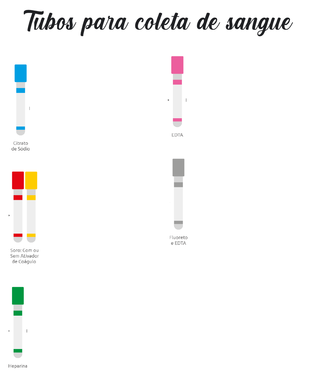 Tampa azul ° Tubo com citrato de sódio ° O sangue que precisa passar por uma análise de coagulação, que deve conter amostra de plasma, deve ser colhido em um tubo com citrato de sódio. Tampa vermelha e amarela ° tubo sem anticoagulante ° são para análises bioquímicas e sorológicas, pois contêm ativador de coágulo. A diferença entre as duas é que a vermelha possui gel e a amarela não. Tampa verde ° tubo com heparina ° Para análises bioquímicas, gasometria ou outros exames, a amostra de plasma deve ser colhida em um tubo com heparina. Tampa roxa ° tubo com EDTA ° investigar possíveis distúrbios sanguíneos, é necessário realizar uma análise hematológica. Para isso, o tubo com tampa roxa é ideal, pois ele possui anticoagulante e EDTA, que viabilizam um estudo completo da amostra. Tampa cinza ° tubo com fluoreto de sódio ° A amostra do plasma deve ser colhida em um tubo com fluoreto de sódio, ou seja, de tampa cinza, quando será realizada uma análise de glicemia.