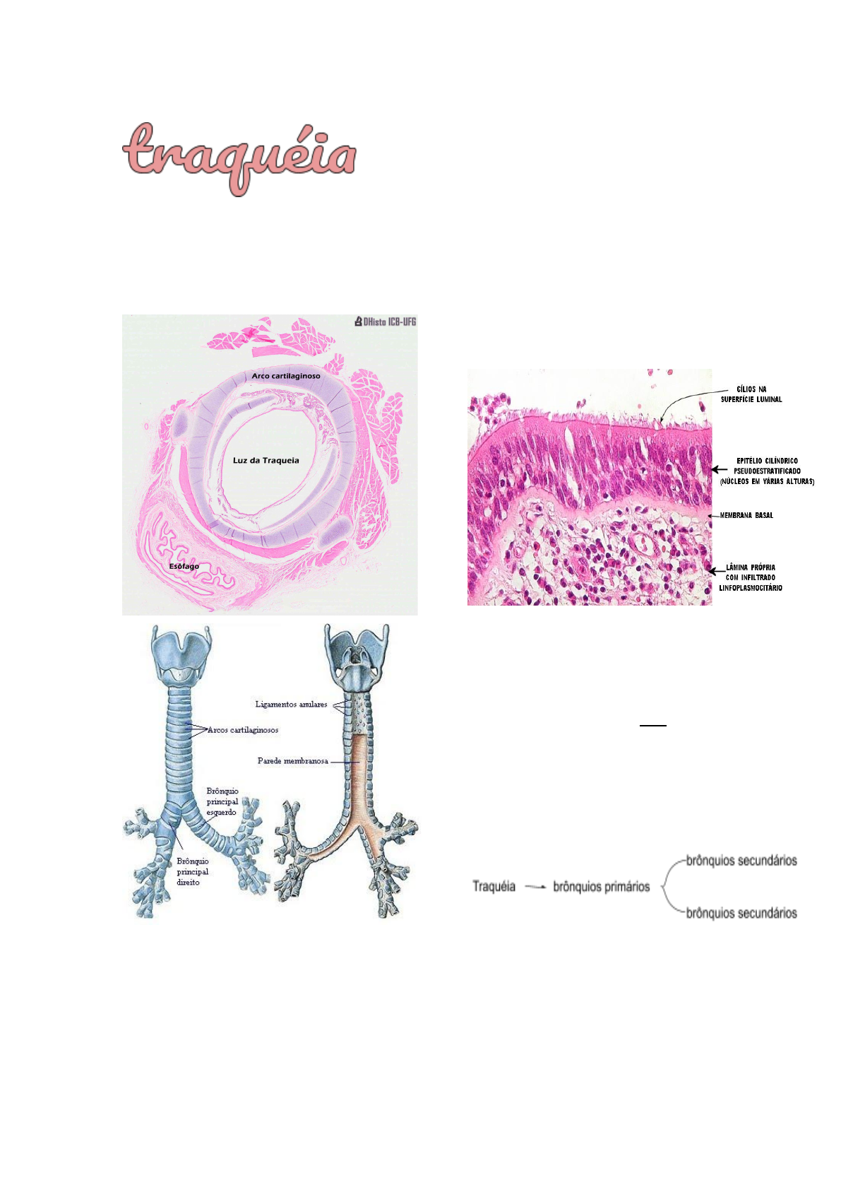 UNIT/AL GABRIELA ALMEIDA NASCIMENTO UC2/HISTOLOGIA ● É um tubo que se continua com a laringe e termina ramificando-se nos dois brônquios extrapulmonares. ● Secreção: forma uma lâmina viscosa sobre o epitélio, que é levada em direção à faringe pelos batimentos ciliares e, dessa maneira, remove partículas de pó e microorganismos que entraram com o ar inspirado e aderiram ao muco. ● Apresenta cartilagem hialina, em forma da letra C. ● Ligamentos fibroelásticos - impedem a excessiva distensão do lúmen. ● Feixes musculares - regulação do lúmen. ● Estreitamento do lúmen (CM) - aumenta a velocidade do ar expirado; torna mais fácil expulsar, pela tosse, a secreção acumulada. ➔ Árvore brônquica ● Traqueia -> brônquios primários. ● Brônquios primários - entram no pulmão através do hilo, pelo o qual também entram A. Pulmonares e A. brônquicas e saem V. Linfáticos e veias; envolvidos por TC = raiz do pulmão. ★ Cada brônquio secundário supre um lobo pulmonar. ➢ Brônquios ● Ramos maiores - epitélio respiratório. UNIT/AL GABRIELA ALMEIDA NASCIMENTO UC2/HISTOLOGIA ● Ramos menores - epitélio cilíndrico simples ciliado. ● Parte externa - músculo liso disposto em espiral (helicoidal). ● Glândulas seromucosas - revestem a camada de músculo.