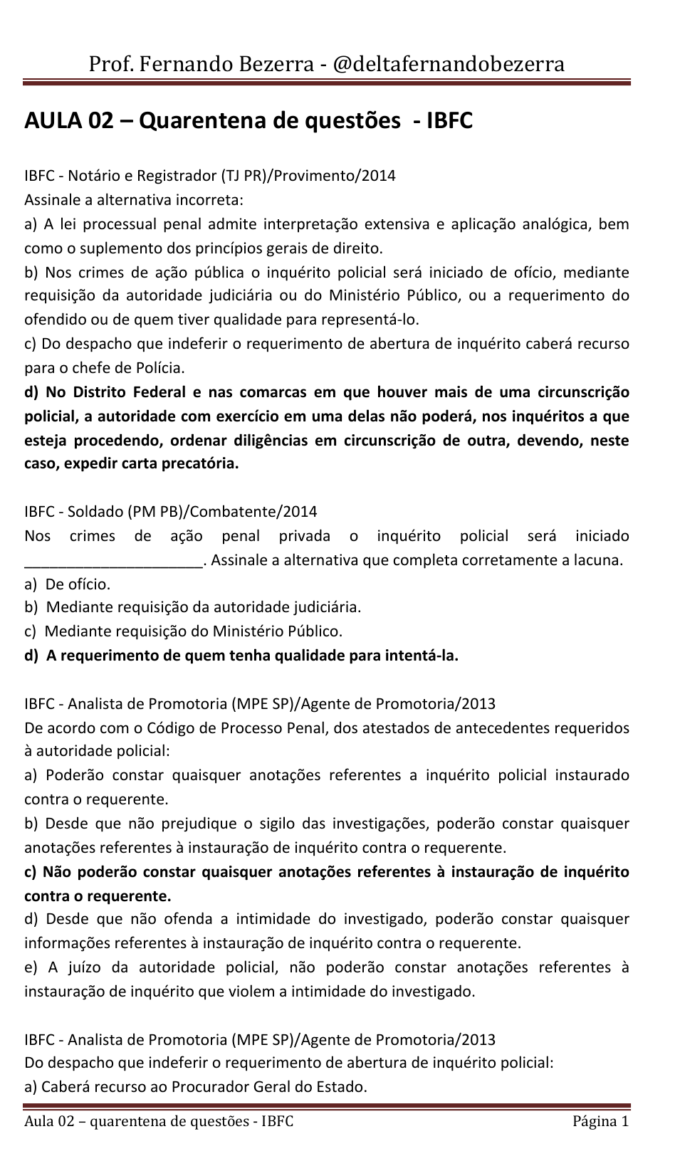 Prof. Fernando Bezerra - @deltafernandobezerra Aula 02 – quarentena de questões - IBFC Página 1 AULA 02 – Quarentena de questões - IBFC IBFC - Notário e Registrador (TJ PR)/Provimento/2014 Assinale a alternativa incorreta: a) A lei processual penal admite interpretação extensiva e aplicação analógica, bem como o suplemento dos princípios gerais de direito. b) Nos crimes de ação pública o inquérito policial será iniciado de ofício, mediante requisição da autoridade judiciária ou do Ministério Público, ou a requerimento do ofendido ou de quem tiver qualidade para representá-lo. c) Do despacho que indeferir o requerimento de abertura de inquérito caberá recurso para o chefe de Polícia. d) No Distrito Federal e nas comarcas em que houver mais de uma circunscrição policial, a autoridade com exercício em uma delas não poderá, nos inquéritos a que esteja procedendo, ordenar diligências em circunscrição de outra, devendo, neste caso, expedir carta precatória. IBFC - Soldado (PM PB)/Combatente/2014 Nos crimes de ação penal privada o inquérito policial será iniciado _____________________. Assinale a alternativa que completa corretamente a lacuna. a) De ofício. b) Mediante requisição da autoridade judiciária. c) Mediante requisição do Ministério Público. d) A requerimento de quem tenha qualidade para intentá-la. IBFC - Analista de Promotoria (MPE SP)/Agente de Promotoria/2013 De acordo com o Código de Processo Penal, dos atestados de antecedentes requeridos à autoridade policial: a) Poderão constar quaisquer anotações referentes a inquérito policial instaurado contra o requerente. b) Desde que não prejudique o sigilo das investigações, poderão constar quaisquer anotações referentes à instauração de inquérito contra o requerente. c) Não poderão constar quaisquer anotações referentes à instauração de inquérito contra o requerente. d) Desde que não ofenda a intimidade do investigado, poderão constar quaisquer informações referentes à instauração de inquérito contra o requerente. e) A juízo da autoridade policial, não poderão constar anotações referentes à instauração de inquérito que violem a intimidade do investigado. IBFC - Analista de Promotoria (MPE SP)/Agente de Promotoria/2013 Do despacho que indeferir o requerimento de abertura de inquérito policial: a) Caberá recurso ao Procurador Geral do Estado. Prof. Fernando Bezerra - @deltafernandobezerra Aula 02 – quarentena de questões - IBFC Página 2 b) Caberá recurso ao Promotor de Justiça. c) Caberá recurso ao Juiz de Direito. d) Caberá recurso ao Chefe de Polícia. e) Não caberá recurso. IBFC - Oficial de Cartório (PC RJ)/2013 No sistema jurídico brasileiro, à Polícia Judiciária é atribuído o poder estatal de investigação criminal, conforme dispõe o artigo 144 da Constituição Federal. As exceções a esta regra encontra-se elencadas no próprio texto constitucional e em leis complementares que tratam de casos específicos e pontuais. Com fundamento neste quadro jurídico delineado pela Constituição brasileira em relação à atividade estatal de investigação criminal, podemos afirmar corretamente que: a) Caracteriza-se como constitucional e encontra amparo expresso na legislação processual penal o procedimento investigatório instaurado por promotor de justiça para apurar infrações penais, mesmo que o suspeito da prática delitiva não seja membro do Ministério Público. b) Os delegados de polícia de carreira, como regra geral, são os detentores da competência administrativa exclusiva para a presidência da investigação criminal e para a prática dos demais atos de polícia judiciária. c) As polícias militares estaduais possuem atribuição constitucional para a realização de atividade investigativa em matéria penal, podendo os seus oficiais instaurar inquérito policial militar para apurar infrações penais de natureza comum ou militar. d) Os juízes federais possuem atribuição para presidir apuração de infrações penais de competência da Justiça Comum Federal, podendo contar com auxílio da polícia rodoviária federal para realizar atos de investigação e instrumentalizá-los. e) Adotando a Constituição Federal brasileira o sistema acusatório puro, que autoriza, implicitamente, a realização de investigação criminal por qualquer órgão que atue na jurisdição penal, subentende-se que a defesa técnica pode realizar diretamente atos formais de investigação, valendo-se do aparato do Estado para tanto. IBFC - Oficial de Cartório (PC RJ)/2013 No atual Estado Democrático de Direito o investigado não é mais visto como objeto de investigação, mas sim como sujeito de direitos, devendo assim ser tratado em todas as fases da persecução penal. Sob a luz desta moderna perspectiva processual e visando efetivar direitos e garantias fundamentais consagrados constitucionalmente, foi editada a Lei n.º 12.839/2013, que trata da investigação criminal conduzida pelo delegado de polícia. Considerando a sistemática constitucional de garantias processuais e o que dispõe a referida Lei Federal sobre o ato de indiciamento, podemos afirmar corretamente que: a) Quando o inquérito policial for concluído sem o formal indiciamento do suspeito, devido à convicção do delegado de polícia de que sobre este não recaem indícios Prof. Fernando Bezerra - @deltafernandobezerra Aula 02 – quarentena de questões - IBFC Página 3 suficientes de autoria delitiva, poderá o juiz determinar que se realize o referido ato, caso tenha recebido a denúncia oferecida pelo Ministério Público contra o investigado. b) O ato de indiciamento poderá ser requisitado ao delegado de polícia pelo membro do Ministério Público que realizou diretamente a apuração de infração penal e denunciou o seu autor, a fim de que conste nos registros policiais a investigação realizada pelo órgão acusador. c) O indiciamento é ato
