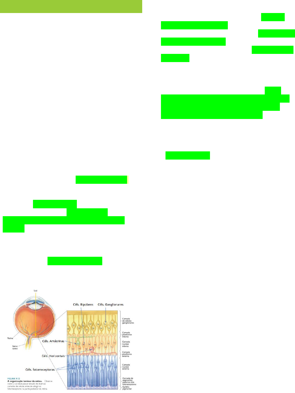 FOTOTRANSDUÇÃO É nada mais do que transformar uma resposta que é luz, em resposta elétrica. A imagem é uma construção e a forma como ela é construída ainda não é totalmente conhecida e a luz entra através da abertura chamada de pupila, e além disso, existe a retina nasal e a retina temporal, pois dependendo de onde está o seu objeto, a luz bate mais em determinada retina. O olho humano é capaz de captar é uma determinada faixa de fótons de luz, sendo acima do espectro o infra-vermelho e abaixo o UV. Existe um estudo que demonstra que a mulher tem uma maior percepção de detalhes, como por exemplo, diferenças simples entre as cores. Se pegarmos a retina e dermos um zoom nela, é perceptível que ela é formada por mais de uma camada, sendo a mais externa em relação ao globo ocular, é o chamado epitélio pigmentar que tem grande quantidade de melanina e é responsável por absorver a luz. Depois dela existem os fotorreceptores, existindo dois tipos, um com a extremidade mais comprida (bastonetes) e outra com terminação cônica (cones), sendo que essa camada apresenta uma porção da camada de segmentos externos dos fotorreceptores e camada nuclear externa (onde estão os núcleos dos fotorreceptores). Logo após, existe a camada plexiforme externa, onde ocorre a comunicação entre o fotorreceptor e células bipolares. A luz tem que atravessar todas as camadas da retina, chegando aos fotorreceptores que vão realizar a fototransdução e vão fazer sinapses com as células bipolares (camada plexiforme interna), que por sua vez, irão fazer sinapses com as células ganglionares, cujo potencial de ação vai percorrer por seus axônios e irão formar o nervo óptico (II). Essas sinapses que foram mencionadas, irão ser moduladas pelas células que ficam em posições horizontais. Os fotorreceptores podem ser do tipo cones (cores e são importantes para acuidade visual) ou bastonetes (especialização em enxergar melhor movimento e visão noturna). As cores primárias serão azul, verde e vermelho e todo o resto de cores que enxergamos, são a misturas que esses três cones enxergam. Na retina existe uma região onde se concentra mais os cones, a região da fóvea, sendo a região de maior acuidade visual, onde melhor enxergamos e todo o resto a retina, é mais preenchido por bastonetes. Na região da fóvea, um fotorreceptor irá fazer sinapse com uma célula bipolar que fazem sinapse com uma única célula ganglionar, o que é diferente de outras regiões periféricas da retina, onde acontece uma convergência de sinais, onde vários fotorreceptores, fazem sinapse com várias células bipolares que faz sinapse com uma única célula ganglionar, que irá diminuir a acuidade visual, perdendo discernimento. O fotorreceptor (bastonetes que possuem rodopsina, fotopigmento), sendo a rodopsina formada por opsina + retinal (produto da quebra da vitamina A). Na ausência de luz, a proteína G específica dessa região está inativa, com grande quantidade de GMPc, fazendo com que um canal de sódio fique sempre aberto, e isso deixará a célula mais despolarizada pela entrada de carga positiva, ou seja, a luz não despolariza. Quando se tem luz e sua detecção, ocorrerá a ativação da proteína G que irá ativar uma enzima fosfodiesterase que faz com que o GMPc passe a GMP e aquele canal de sódio sensível a GMPc se fecha, ocorrendo uma hiperpolarização, a sinapse ficará inibida na presença de luz. No escuro, os canais abertos irão fazer a despolarização com a entrada de sódio e cálcio e quando ocorre a despolarização, irá ocorrer a exocitose do neutransmissor que é recebido pela camada de células bipolares, sendo o neurotransmissor em questão, o glutamato. Na luz, com a célula hiperpolarizada irá causar uma menor liberação do glutamato. Cegueira Noturna: A importância da vitamina A para formação de retinal do pigmento da rodpsina e é a remoção dela que vai acontecer quando a luz incidir e o prejuízo no funcionamento dos bastonetes irá causar perda da visão noturna pois ele é o responsável pela visão noturna. Existem dois tipos de células bipolares, a primeira que é ativa na luz é a ON e no escuro é ativada a célula OFF, e com base nisso, o glutamato em excesso na célula OFF irá estimular ela, tornando- a OFF e ainda no escuro, esse monte de glutamato irá inibir as células ON. O contrário também é válido. As células bipolares também apresentam seus campos receptivos, sendo que eles fazem uma organização centro-periferia, sendo que quando ela é ON, com a luz incidindo bem no centro do campo receptivo, deixa a célula bem ativada e quando a luz incide no centro, o sistema garante sombra na periferia que deixa a célula mais ativada ainda e quem garante isso, são as células horizontais. Se a luz incide na periferia, ocorre pouca formação de potencial de ação mas quando a luz incide no centro, se tem uma maior salva de potencial de ação e se ocorre uma iluminação igualitária, não se tem um grande potencial de ação para sinalizar para o neurônio seguinte. Campo visual binocular: Parte comum aos dois olhos, que os dois enxergam. Hernicampo viual esquerdo: parte lateral que se enxerga só com o olho esquerdo. Hernicampo visual direito: parte lateral que se enxerga só com o olho direito. As fibras da retina nasal (lateral) cruzam, tanto direita quanto esquerda, já a retina temporal (central) não cruza, tanto a direita quanto esquerda. Ou seja, se acontecer uma lesão no nervo óptico esquerdo ocorre a perda da visão total do olho esquerdo mas não perde a visão mais central por conta do olho direito também enxergar. Já quando a lesão for no quiasma óptico se perde a visão periférica por conta do quiasma ser o cruzamento da retina nasal que são fibras que cruzam. Agora se for lesionado o trato esquerdo, ocorrerá a perda de visão central e periférica direita.