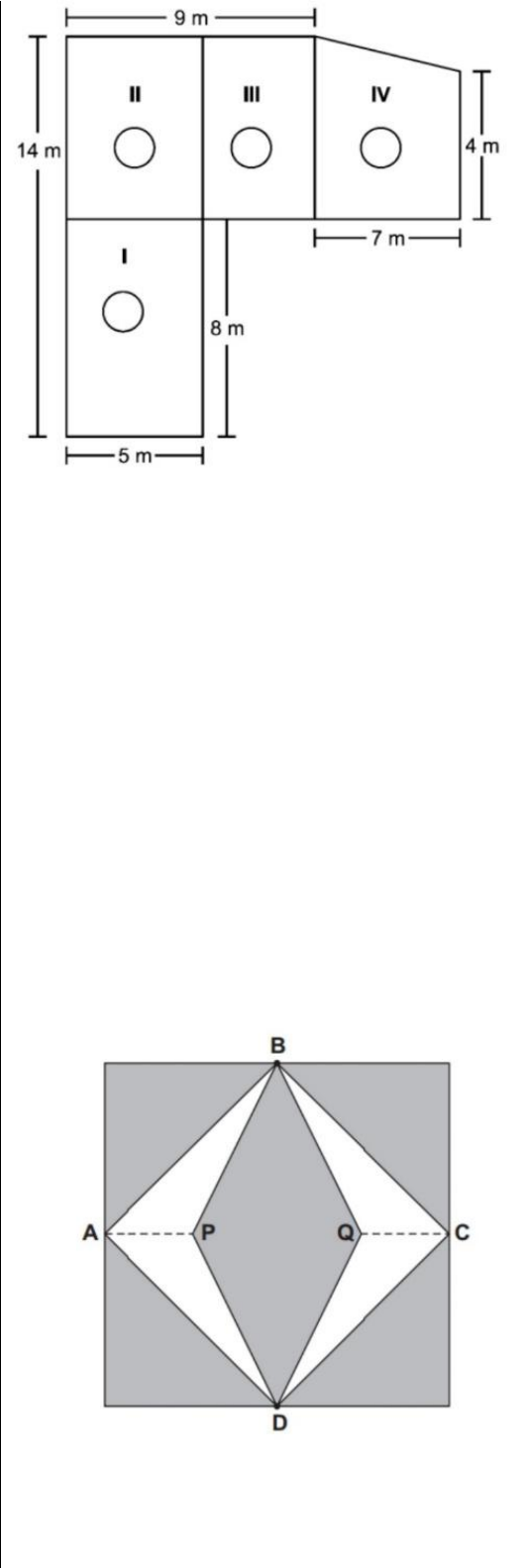 01. A loja Telas & Molduras cobra 20 reais por metro quadrado de tela, 15 reais por metro linear de moldura, mais uma taxa fixa de entrega de 10 reais. Uma artista plástica precisa encomendar telas e molduras a essa loja, suficientes para 8 quadros retangulares (25 cm × 50 cm). Em seguida, fez uma segunda encomenda, mas agora para 8 quadros retangulares (50 cm × 100 cm). O valor da segunda encomenda será (A) o dobro do valor da primeira encomenda, porque a altura e a largura dos quadros dobraram. (B) maior do que o valor da primeira encomenda, mas não o dobro. (C) a metade do valor da primeira encomenda, porque a altura e a largura dos quadros dobraram. (D) menor do que o valor da primeira encomenda, mas não a metade. (E) igual ao valor da primeira encomenda, porque o custo de entrega será o mesmo. 02. Jorge quer instalar aquecedores no seu salão de beleza para melhorar o conforto dos seus clientes no inverno. Ele estuda a compra de unidades de dois tipos de aquecedores: modelo A, que consome 600 g/h (gramas por hora) de gás propano e cobre 35 m2 de área, ou modelo B, que consome 750 g/h de gás propano e cobre 45 m2 de área. O fabricante indica que o aquecedor deve ser instalado em um ambiente com área menor do que a da sua cobertura. Jorge vai instalar uma unidade por ambiente e quer gastar o mínimo possível com gás. A área do salão que deve ser climatizada encontra-se na planta seguinte (ambientes representados por três retângulos e um trapézio). Avaliando-se todas as informações, serão necessários (A) quatro unidades do tipo A e nenhuma unidade do tipo B. (B) três unidades do tipo A e uma unidade do tipo B. (C) duas unidades do tipo A e duas unidades do tipo B. (D) uma unidade do tipo A e três unidades do tipo B. (E) nenhuma unidade do tipo A e quatro unidades do tipo B. 03. Para decorar a fachada de um edifício, um arquiteto projetou a colocação de vitrais compostos de quadrados de lado medindo 1 m, conforme a figura a seguir. Nesta figura, os pontos A, B, C e D são pontos médios dos lados do quadrado e os segmentos AP e QC medem 1/4 da medida do lado do quadrado. Para confeccionar um vitral, são usados dois tipos de materiais: um para a parte sombreada da figura, que custa R$ 30,00 o m², e outro para a parte mais clara (regiões ABPDA e BCDQB), que custa R$ 50,00 o m². De acordo com esses dados, qual é o custo dos materiais usados na fabricação de um vitral? (A) R$ 22,50 (B) R$ 35,00 (C) R$ 40,00 (D) R$ 42,50 (E) R$ 45,00 04. Membros de uma família estão decidindo como irão dispor duas camas em um dos quartos da casa. As camas têm 0,80 m de largura por 2 m de comprimento cada. As figuras abaixo ex-põem os esboços das ideias sugeridas por José, Rodrigo e Juliana, respectivamente. Em todos os esboços, as camas ficam afastadas 0,20 m das paredes e permitem que a porta seja aberta em pelo menos 90°. José, Rodrigo e Juliana concordaram que a parte listrada em cada caso será de difícil circulação, e a área branca é de livre circulação. Entre essas propostas, a(s) que deixa(m) maior área livre para circulação é(são): (A) as propostas de Rodrigo e Juliana. (B) a proposta de Rodrigo. (C) as propostas de José, Rodrigo e Juliana. (D) a proposta de Juliana. (E) as propostas de José e Rodrigo. 05. Uma escola tem um terreno vazio no formato retangular cujo perímetro é 40 m, onde se pretende realizar uma única construção que aproveite o máximo de área possível. Após a análise realizada por um engenheiro, este concluiu que para atingir o máximo de área do terreno com uma única construção, a obra ideal seria (A) um banheiro com 8 m². (B) uma sala de aula com 16 m². (C) um auditório com 36 m². (D) um pátio com 100 m². (E) uma quadra com 160 m². 06. Em uma cidade, a cada inauguração de prédios, a orientação da prefeitura, por meio de uma lei de incentivo à cultura, é a construção de uma obra de arte na entrada ou no hall desse prédio. Em contrapartida, a prefeitura oferece abatimento em impostos. No edifício das Acácias, o artista contratado resolveu fazer um quadro composto de 12 mosaicos, de dimensões de 12 cm por 6 cm cada um, conforme a figura. A área da figura sombreada do quadro é de (A) 36 cm². (B) 72 cm². (C) 144 cm². (D) 288 cm². (E) 432 cm². 07. Vítor deseja revestir uma sala retangular de dimensões 3 m x 4 m, usando um tipo de peça de cerâmica. Em uma pesquisa inicial, ele selecionou cinco tipos de peças disponíveis, nos seguintes formatos e dimensões: • Tipo I: quadrados, com 0,5 m de lado. • Tipo II: triângulos equiláteros, com 0,5 m de lado. • Tipo III: retângulos, com dimensões 0,5 m x 0,6 m. • Tipo IV: triângulos retângulos isósceles, cujos catetos medem 0,5 m. • Tipo V: quadrados, com 0,6 m de lado. Analisando a pesquisa, o mestre de obras recomendou que Vítor escolhesse um tipo de piso que possibilitasse a utilização do menor número de peças e não acarretasse sobreposições ou cortes nas cerâmicas. Qual o tipo de piso o mestre de obras recomendou que fosse comprado? (A) Tipo I. (B) Tipo II. (C) Tipo III. (D) Tipo IV. (E) Tipo V. 08. Uma empresa que organiza eventos de formatura confecciona canudos de diplomas a partir de folhas de papel quadradas. Para que todos os canudos fiquem idênticos, cada folha é enrolada em torno de um cilindro de madeira de diâmetro d em centímetros, sem folga, dando-se 5 voltas completas em torno de tal cilindro. Ao final, amarra-se um cordão no meio do diploma, bem ajustado, para que não ocorra o desenrolamento, como ilustrado na figura: Em seguida, retira-se o cilindro de madeira do meio do papel enrolado, finalizando a confecção do diploma. Considere que a espessura da folha de papel original seja desprezível. Qual é a medida, em centímetros, do lado da folha de papel usado na confecção do diploma? (A) π d (B) 2π d (C) 4π d (D) 5π d (E) 10π d 09. O proprietário de um parque aquático deseja construir 