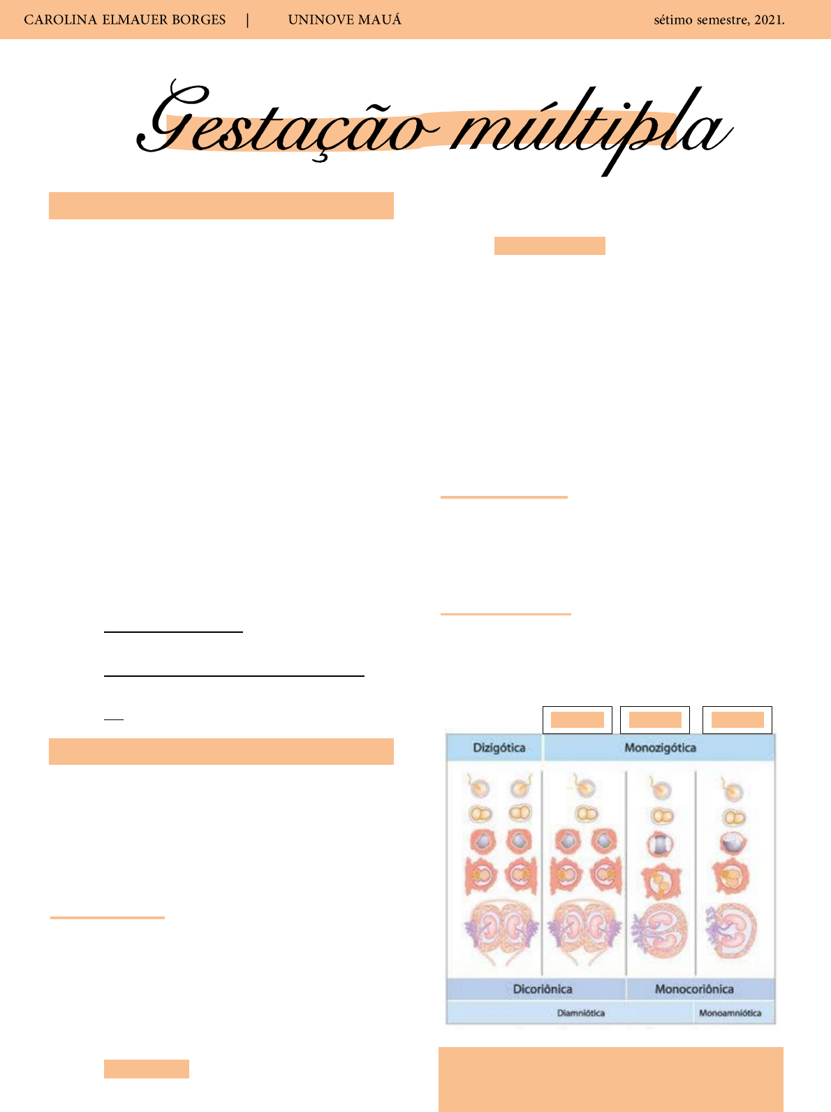 INTRODUÇÃO As gestações gemelares podem ocorrer pelos seguintes fatores: A mulher teve mais de uma ovulação no mesmo ciclo, gerando mais de um zigoto. Divisão de um mesmo zigoto. TODAS as gestações gemelares são de alto risco e devem ser acompanhadas pelo obstetra em centro especializado. O risco de paralisia cerebral, abortamento, prematuridade, pré-eclâmpsia, hiperêmese gravídica, hemorragia pós-parto e demais complicações está aumentado. A prevalência de gêmeos dizigóticos (em que ela ovula mais de 1 vez naquele ciclo) é influenciada por fatores como história familiar materna, gestações tardias, raça negra e aumento de paridade. Indutores de ovulação: > chances de gestação dizigótica. Transferência de múltiplos embriões: > chances de gestação dizigótica. FIV: > chance de gestação monozigótica. CLASSIFICAÇÃO Podem ser classificada quanto à quantidade de fetos (gemelar, trigemelar, etc), quantidade de ovos fertilizados (zigoticidade), número de placentas (corionicidade) e número de cavidades amnióticas (amnionicidade). ZIGOTICIDADE Dizigótica (bivitelinos): Espermatozóides e óvulos distintos, ou seja, várias gestações ocorrendo ao mesmo tempo. A placentação é obrigatoriamente dicoriônica e a cavidade é diamniótica. Os gêmeos não são idênticos, podendo ter sexos diferentes. Superfetação: Ocorre quando já existe uma gestação inicial em andamento e a mulher ovula novamente, engravidando. É um evento raríssimo Superfecundação: É a fecundação de dois óvulos distintos no mesmo ciclo menstrual, e não necessariamente no mesmo ato sexual. Assim, uma mulher pode engravidar de homens diferentes no mesmo ciclo menstrual. Monozigótica (univitelinos): Apresentam o mesmo genótipo, portanto, apresentam o mesmo sexo, com a mesma aparência física e mesmas tendências para patologias. CORIONICIDADE Monocoriônica (1 placenta): Apresenta elevada morbimortalidade fetal. Dicoriônica (2 placentas). AMNIONICIDADE Monoamniótica; Diamniótica; *O período em que o zigoto se divide tem relação com o tipo de gestação. Se dividir após o 13º dia, são gêmeos unidos. Até 72h 4-8 dias 9-10 dias DIAGNÓSTICO A gestação dicoriônica pode ser definida a partir da 5ª semana pela visualização de mais de um saco gestacional e a presença de septo espesso entre eles. Sinal do Lambda presente a partir da 9ª semana de gestação. Já nas gestações monocoriônicas, a partir da 7ª semana há identificação de mais de um embrião com vitalidade fetal no interior de um mesmo saco gestacional. Sinal do T: Septo fino entre as duas cavidades amnióticas, presente no final do 1º trimestre. Caracteriza uma gestação monocoriônica diamniótica Achados clínicos que auxiliam no diagnóstico de gestação gemelar: palpação de 2 polos cefálicos, ausculta de ritmos cardíacos diferentes entre si (excluindo o materno) e a altura do fundo uterino 5 cm maior do que o esperado em gestações únicas de 20 a 30 semanas. MODIFICAÇÃO DO ORGANISMO MATERNO A expansão volêmica é ainda mais elevada, causando aumento de pré-carga e maior débito cardíaco. Assim, tem mais dispneia, maior chance de uropatia obstrutiva, por compressão extrínseca pelo aumento do volume uterino. COMPLICAÇÕES Maternas: Hiperêmese gravídica; Complicações hemorrágicas da gestação; Pré-eclâmpsia; Edema MMII; Infecção puerperal; Hemorragia pós-parto; Anemia; Rotura prematura de membranas ovulares; Edema pulmonar; Óbito; Fetais: Entrelaçamento de cordões (exclusivo de gestações monoamnióticas); Síndrome de transfusão feto-fetal (desequilíbrio hemodinâmico causado por anastomoses vasculares arteriovenosas placentárias – exclusiva de gestações monocoriônicas); Doador: Doa peso, líquido amniótico, urina e sangue. Ocasiona restrição de crescimento fetal (RCF) grave, oligodrâmnio, oligúria e anemia. Receptor: Recebe tudo do doador. Ocasiona hidropsia, polidrâmnia, bexiga distendida e policitemia. Estágio: 1: Diferença de líquido amniótico. 2: Feto doador já tem Anúria – bexiga não é visualizada no USG. 3: Doppler – alteração de 1 ou ambos. TRATAR A PARTIR DAQUI. 4: Feto doador hidrópico. 5: Óbito de um dos fetos. Tratamento: Amniodrenagem seriada para feto receptor, cirurgia endoscópica intrauterina com laser para coagulação das anastomoses arteriovenosas, septostomia e até mesmo feticídio seletivo para o gemelar na iminência da morte. Oligodrâmnio Maior bolsão vertical < 2 cm ou ILA < 5cm Polidrâmnio Maior bolsão vertical ≥ 8 cm ou ILA ≥ 24 cm Gêmeo Acárdico: Situação rara e dramática que ocorre em gestações monocoriônicas. Representa grau extremo de anormalidade vascular por anastomose arterioarterial. O gêmeo normal, doador, atua como bomba de perfusão para o feto anormal e, na maioria dos casos, morre em decorrência de ICC ou prematuridade acarretada pela polidrâmnia severa. O gêmeo acárdico apresenta: acardia ou coração rudimentar, ausência de polo cefálico, alterações dos membros superiores, tronco hidrópico ou massa amorfa. Tratamento: Ocluir o fluxo sanguíneo para o gêmeo acárdico, podendo ser realizado por meio de ligadura endoscópica, coagulação a laser do cordão umbilical ou embolização dos vasos umbilicais do feto acárdico. Sequência Anemia-Policitemia do Gemelar: Ocorre devido pequenas anastomoses vasculares (< 1 mm) que permitem o fluxo lento entre doador e receptor. Tem fisiopatologia semelhante à STFF, porém de apresentação mais branda e sem discordância do volume de líquido amniótico. É caracterizado pela diferença significativa de hemoglobina entre os fetos e pode ser diagnosticado no pré-natal a partir do Doppler de artéria cerebral média. Ocorre a seguinte discordância: Velocidade sistólica máxima > 1,5 MoM no gêmeo anêmico. Velocidade máxima <1,0 MoM no gêmeo policitêmico. Em gestações >30 semanas, opta-se pela interrupção. Antes 