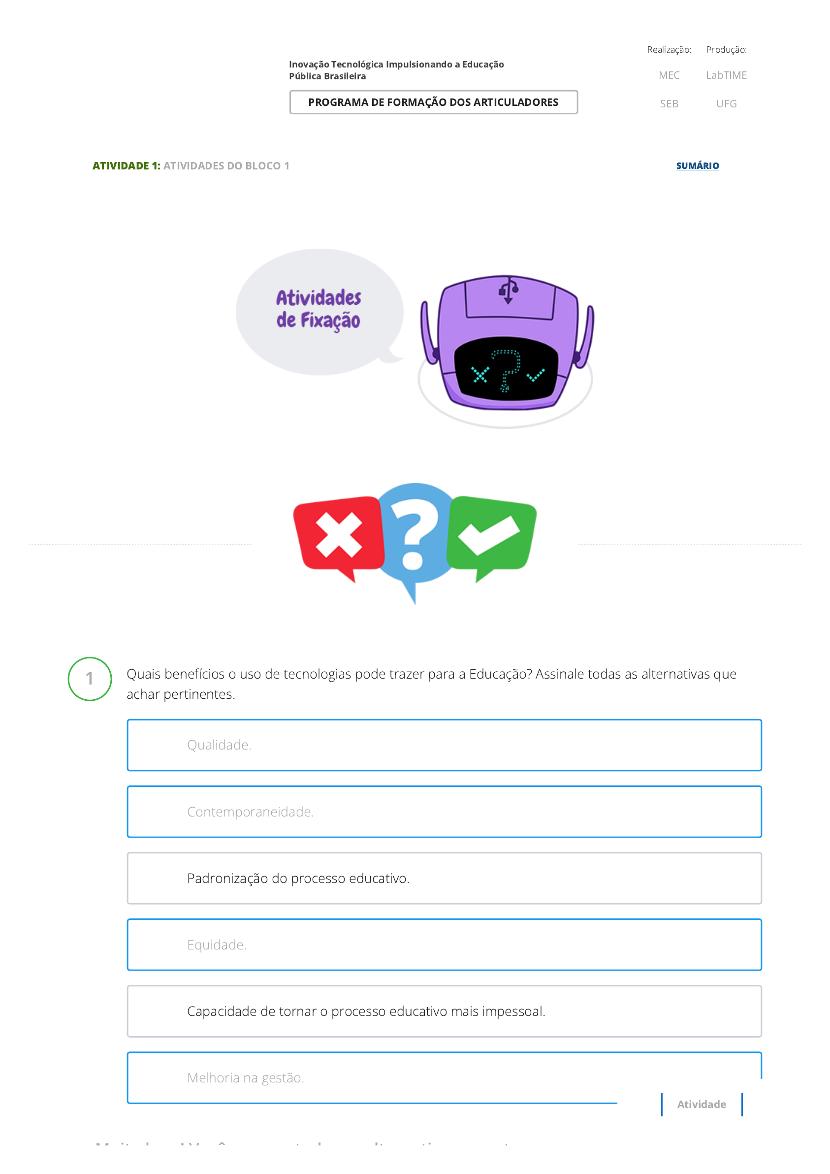 07/10/2021 00:13 Educação Conectada - Programa de Formação dos Articuladores https://avamec.mec.gov.br/#/instituicao/seb/curso/961/unidade/384/acessar 1/7 Inovação Tecnológica Impulsionando a Educação Pública Brasileira PROGRAMA DE FORMAÇÃO DOS ARTICULADORES Realização: MEC SEB Produção: LabTIME UFG ATIVIDADE 1: ATIVIDADES DO BLOCO 1 SUMÁRIO 1 Quais benefícios o uso de tecnologias pode trazer para a Educação? Assinale todas as alternativas que achar pertinentes. M it b ! V ê t d lt ti t Qualidade. Contemporaneidade. Padronização do processo educativo. Equidade. Capacidade de tornar o processo educativo mais impessoal. Melhoria na gestão. Atividade https://avamec.mec.gov.br/ava-mec-ws/instituicao/seb/conteudo/modulo/301/index.html https://www.mec.gov.br/ http://portal.mec.gov.br/secretaria-de-educacao-basica http://www.labtime.ufg.br/ http://ufg.br/ https://avamec.mec.gov.br/ava-mec-ws/instituicao/seb/conteudo/modulo/301/index.html https://avamec.mec.gov.br/ava-mec-ws/instituicao/seb/conteudo/modulo/301/mod3_sl10.html https://avamec.mec.gov.br/ava-mec-ws/instituicao/seb/conteudo/modulo/301/ativ1_sl2.html 07/10/2021 00:13 Educação Conectada - Programa de Formação dos Articuladores https://avamec.mec.gov.br/#/instituicao/seb/curso/961/unidade/384/acessar 2/7 2 3 Muito bem! Você marcou todas as alternativas corretas. Como o uso de tecnologias pode mudar o papel do professor e do aluno? Assinale todas as alternativas que achar pertinentes. Muito bem! Você acertou. Assinale as características que correspondem ao ensino híbrido. O aluno torna-se ativo e engajado na construção do conhecimento. Os computadores substituem professores, e os alunos trabalham sozinhos. O aluno pode ensinar ao professor funcionalidades tecnológicas e práticas de compartilhamento típicas da cultura digital. O professor passa a ser um motivador e um facilitador do aprendizado. As relações interpessoais �cam mais hierarquizadas. O professor tem papel de realizar a busca e a curadoria de conteúdos digitais. Deve ser realizado exclusivamente a distância. Uso de conteúdos e recursos tecnológicos de aprendizagem. Centrado em aulas expositivas do professor. Momentos presenciais para debate e re�exão de conteúdos. Desenvolvimento da autonomia de estudo do aluno. Atividade https://avamec.mec.gov.br/ava-mec-ws/instituicao/seb/conteudo/modulo/301/mod3_sl10.html https://avamec.mec.gov.br/ava-mec-ws/instituicao/seb/conteudo/modulo/301/ativ1_sl2.html 07/10/2021 00:13 Educação Conectada - Programa de Formação dos Articuladores https://avamec.mec.gov.br/#/instituicao/seb/curso/961/unidade/384/acessar 3/7 4 5 Muito bem! Você acertou. O que signi�ca personalização do ensino? Muito bem! Você acertou. Quais são as principais propostas do Programa de Inovação Educação Conectada? Assinale todas as alternativas que achar pertinente. Criação de formas de estudo diferenciadas que atendem variados tipos de alunos. Possibilidade de que o aluno escolha seu próprio percurso educacional. Trata-se de uma ferramenta tecnológica. Processo em que o aluno estuda de forma independente do currículo e da instituição escolar. O aluno busca atingir os objetivos de aprendizagem que ele próprio de�ne. Ação que estimula o aluno a ser consciente de seus processos de aprendizagem. Conectar escolas à internet. Disponibilizar recursos educacionais digitais pela plataforma MEC RED. Disponibilizar aulas padronizadas por via digital. Formar articuladores para apoiar o Programa. Levar equipamentos para as escolas. Atividade https://avamec.mec.gov.br/ava-mec-ws/instituicao/seb/conteudo/modulo/301/mod3_sl10.html https://avamec.mec.gov.br/ava-mec-ws/instituicao/seb/conteudo/modulo/301/ativ1_sl2.html 07/10/2021 00:13 Educação Conectada - Programa de Formação dos Articuladores https://avamec.mec.gov.br/#/instituicao/seb/curso/961/unidade/384/acessar 4/7 6 7 Muito bem! Você acertou. O que é a Plataforma Integrada de Recursos Educacionais do MEC? Muito bem! Você acertou. Por que a conexão à internet é importante para as escolas? Padronizar o sistema de avaliação nas escolas. Estimular a elaboração de Planos Locais de Inovação e Tecnologia. Um repositório e um referatório de recursos educacionais digitais. Um ambiente que proporciona uma rede colaborativa entre atores da comunidade educacional. Uma plataforma de jogos Um sistema de monitoramento de Planos Locais de Inovação e Tecnologia. Porque fomenta o uso pedagógico de tecnologias digitais na educação básica. Porque permite acesso a recursos educacionais que podem tornar as aulas mais interativas. Porque permite que alunos e professores acessem redes sociais. Porque permite acesso a conteúdos e ferramentas em regiões isoladas. Porque favorece o desenvolvimento de competências no meio digital de alunos e de d t Atividade https://avamec.mec.gov.br/ava-mec-ws/instituicao/seb/conteudo/modulo/301/mod3_sl10.html https://avamec.mec.gov.br/ava-mec-ws/instituicao/seb/conteudo/modulo/301/ativ1_sl2.html 07/10/2021 00:13 Educação Conectada - Programa de Formação dos Articuladores https://avamec.mec.gov.br/#/instituicao/seb/curso/961/unidade/384/acessar 5/7 8 9 Muito bem! Você acertou. Por que é importante construir uma visão compartilhada sobre o uso pedagógico da tecnologia nas redes de ensino? Muito bem! Você marcou TODAS as alternativas corretas. Por que é importante planejar o uso pedagógico da tecnologia em 4 dimensões (visão, formação, recursos educacionais digitais e infraestrutura)? docentes. Porque gera oportunidades de lazer nas escolas. Porque, como elemento que articula todas as dimensões da inovação educacional, a visão deve ser bem conhecida por todos. Porque a construção compartilhada é mais amigável para as redes de ensino. Porque, quando elaborada a partir de pontos de vista variados, a visão tem maior chance de partir de um entendimento profundo da realidade que quer modi�car. Porque, se co