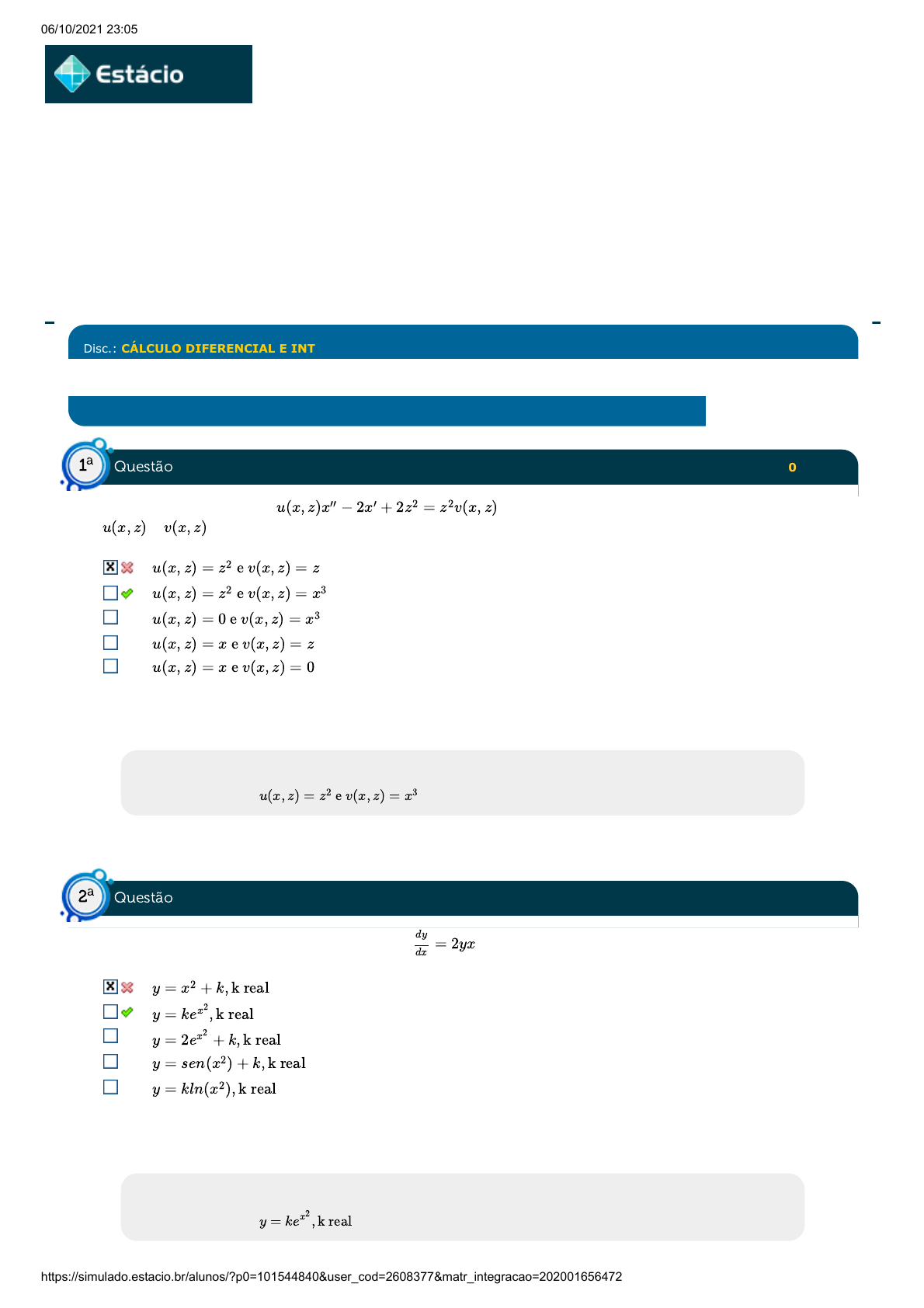 06/10/2021 23:05 Estácio: Alunos https://simulado.estacio.br/alunos/?p0=101544840&user_cod=2608377&matr_integracao=202001656472 Teste seu conhecimento acumulado Disc.: CÁLCULO DIFERENCIAL E INTEGRAL III Acertos: 5,0 de 10,0 Acerto: 0,0 / 1,0 Seja a equação diferencial . Marque a alternativa que apresenta valores para e de forma que a equação diferencial seja de segunda ordem, linear e homogênea: Explicação: A resposta correta é: Acerto: 0,0 / 1,0 Obtenha a solução geral da equação diferencial : Explicação: A resposta correta é: u(x, z)x′′ − 2x′ + 2z2 = z2v(x, z) u(x, z) v(x, z) u(x, z) = z2 e v(x, z) = z u(x, z) = z2 e v(x, z) = x3 u(x, z) = 0 e v(x, z) = x3 u(x, z) = x e v(x, z) = z u(x, z) = x e v(x, z) = 0 u(x, z) = z2 e v(x, z) = x3 = 2yx dy dx y = x2 + k, k real y = kex 2 , k real y = 2ex 2 + k, k real y = sen(x2) + k, k real y = kln(x2), k real y = kex 2 , k real Questão1 a Questão2 a https://simulado.estacio.br/alunos/inicio.asp 06/10/2021 23:05 Estácio: Alunos https://simulado.estacio.br/alunos/?p0=101544840&user_cod=2608377&matr_integracao=202001656472 Acerto: 0,0 / 1,0 Determine a solução geral da equação diferencial . Explicação: A resposta correta é: Acerto: 0,0 / 1,0 Resolva a equação diferencial . Explicação: A resposta correta é: Acerto: 1,0 / 1,0 Marque a alternativa correta em relação às séries . É divergente. É condicionalmente convergente. É absolutamente convergente. Nada se pode concluir quanto à sua convergência. É convergente porém não é absolutamente convergente. Explicação: A resposta correta é: É absolutamente convergente. y ′′ + 4y = 10ex y = acos(2x) + bxsen(2x) + 2x y = aexcos(2x) + bexsen(2x) + 2ex y = aex + bxe2x + 2cos(2x) y = acos(2x) + bsen(2x) + x2 y = acos(2x) + bsen(2x) + 2ex y = acos(2x) + bsen(2x) + 2ex y ′′ + 4y ′ + 13y = 0 ae−2x + bxe−2x, a e b reais. ae−2xcos(3x) + be−2xsen(3x), a e b reais. ae−3x + be−2x, a e b reais. acos(3x) + bsen(3x), a e b reais. acos(2x) + bsen(2x), a e b reais. ae−2xcos(3x) + be−2xsen(3x), a e b reais. Σ∞ 1 ( ) n 8n2+5 1+16n2 Questão3 a Questão4 a Questão5 a 06/10/2021 23:05 Estácio: Alunos https://simulado.estacio.br/alunos/?p0=101544840&user_cod=2608377&matr_integracao=202001656472 Acerto: 0,0 / 1,0 Determine o raio e o intervalo de convergência, respectivamente, da série de potência Explicação: A resposta correta é: Acerto: 1,0 / 1,0 Sabendo que a transformada de Laplace da função f(t) vale sendo n um número inteiro, obtenha a transformada de Laplace de e3t f(t). Explicação: A resposta certa é: Acerto: 1,0 / 1,0 Obtenha a transformada de Laplace da função g(t)= Σ∞1 (x+4)k (k+1)! e ( − 1, ]1 2 1 2 0 e [ ]1 2 ∞ e (−∞, ∞) 1 e ( − , ]1 2 1 2 e ( − , ]1 2 1 2 1 2 ∞ e (−∞, ∞) 1 (s2+4)(n+1) s−4 (s2−6s+26)(n+1) s−4 (s2−6s+13)(n+4) s (s2−6s+13)(n+1) 4 (s2+6s+26)(n+1) 1 (s2−6s+13)(n+1) 1 (s2−6s+13)(n+1) sen(2t) t Questão6 a Questão7 a Questão8 a 06/10/2021 23:05 Estácio: Alunos https://simulado.estacio.br/alunos/?p0=101544840&user_cod=2608377&matr_integracao=202001656472 ln(2s) - arctg arctg(s) arctg + Explicação: A resposta certa é: - arctg Acerto: 1,0 / 1,0 Um objeto com massa de 2 kg está em queda livre em um ambiente cuja constante de proporcionalidade da resistência do ar é de k Ns2/m. O objeto sai do repouso. Determine o valor de k sabendo que ele atinge uma velocidade máxima de 80 m/s. 0,35 0,25 1.00 0,50 0,15 Explicação: A resposta certa é:0,25 Acerto: 1,0 / 1,0 Seja um circuito RC em série com resistência de 100Ω e capacitor de 1F. A tensão é fornecida por meio de uma fonte contínua de 50V ligada em t = 0s. Determine a corrente no capacitor após 2 s. 0,25 e - 0,25 e- 0,5 e - 0,25 e -1 0,5 e - Explicação: A resposta certa é:0,25 e - π 2 ( )s2 ( )22 π 2 π 4 π 2 ( )s 2 1 50 1 100 1 50 1 100 1 50 Questão9 a Questão10 a