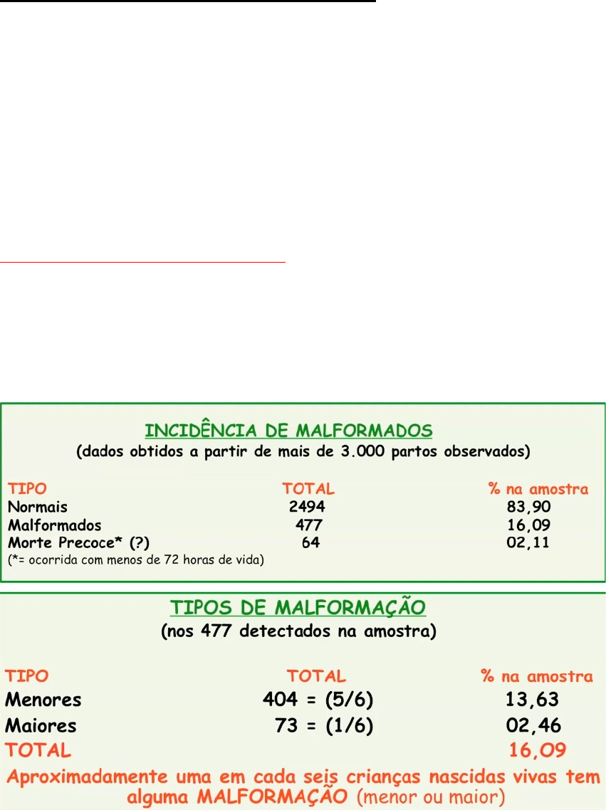 MALFORMAÇÕES CONGÊNITAS - Alteram a “boa” forma esperada do feto - São defeitos estruturais presentes no nascimento. MALFORMAÇÕES MAIORES: - Apresenta um efeito prejudicial ao portador, seja por uma função ou uma não aceitação social. De modo que há necessidade de intervenção da Medicina MALFORMAÇÕES MENORES: - Aquelas onde o efeito sobre a função e aceitação social é aceitável, é um ponto discreto, que se pode dispensar a intervenção da medicina MALFORMAÇÕES CONGÊNITAS PRIMÁRIAS: - Defeitos estruturais presentes ao nascimento, isolados, localizados em um determinado tecido. Podendo resultar no desenvolvimento de uma cadeira de alterações consecutivas OU - Defeitos de parte de órgão, ou de toda uma região anatômica, que resultam em anormalidade em um único campo embrionário, seja pela presença de genes deletérios ou a alguma alteração cromossômica. resulta, pois, de FATORES INTRÍNSECOS. MALFORMAÇÕES SECUNDÁRIAS (DISRUPÇÕES: - Anomalias congênitas observadas na morfogênese de um órgão ou de toda uma região anatômica, consequentemente ao desarranjo de um processo de desenvolvimento originalmente normal, em decorrência de FATORES EXTRÍNSICOS! - Fatores físicos químicos ou biológicos Físicos: Raio-x, radiação gama, beta, natural, ultravioleta Químicos: Fármacos, produtos industriais, álcool, medicamentos, tóxicos de chaminés Biológicos: Vetores virais (rubéola, herpes simples e zoster) bactérias (treponema) etc. - Não são hereditárias DEFORMIDADES E RUPTURAS Deformidades: - São malformações onde a forma ou a posição anormal de uma parte do corpo foram causadas por forças mecânicas. Essas forças podem ser extrínsecas, como por exemplo o aumento da pressão intrauterina (decorrente da falta de espaço) - Ou podem ser intrínsecas, como o hipodesenvolvimento devido à hipomobolidade decorrente de ação do sistema nervoso Rupturas: - São defeitos morfológicos resultantes da interrupção de um processo cujo desenvolvimento era originalmente normal. Ex: ausência de extremidades (amputada por enrolamento do cordão umbilical) SEQUÊNCIAS - São malformações sempre múltiplas, que começam por um único erro na embriogênese e que vão provocando outros erros. - Pode ser decorrente de fatores extrínsecos ou intrínsecos. SÍNDROMES - Conjunto de anomalias decorrentes de um único erro na embriogênese - Indivíduo nasce com um cromossomo a mais ou a menos. - Desenvolve: microcefalia, microtia unilateral, mao fletida, flexão do hálux bilateral, sindactilia, duplicação ureteral unilateral, cistos renais bilaterais, hidronefrose hipoplasia cerebelar ASSOCIAÇÕES: - São malformações que ocorrem conjuntamente, com frequência maior do que a esperada, no entanto, não podem ser encaixadas em sequencias ou sindromes Outra associação: C H A R G E: