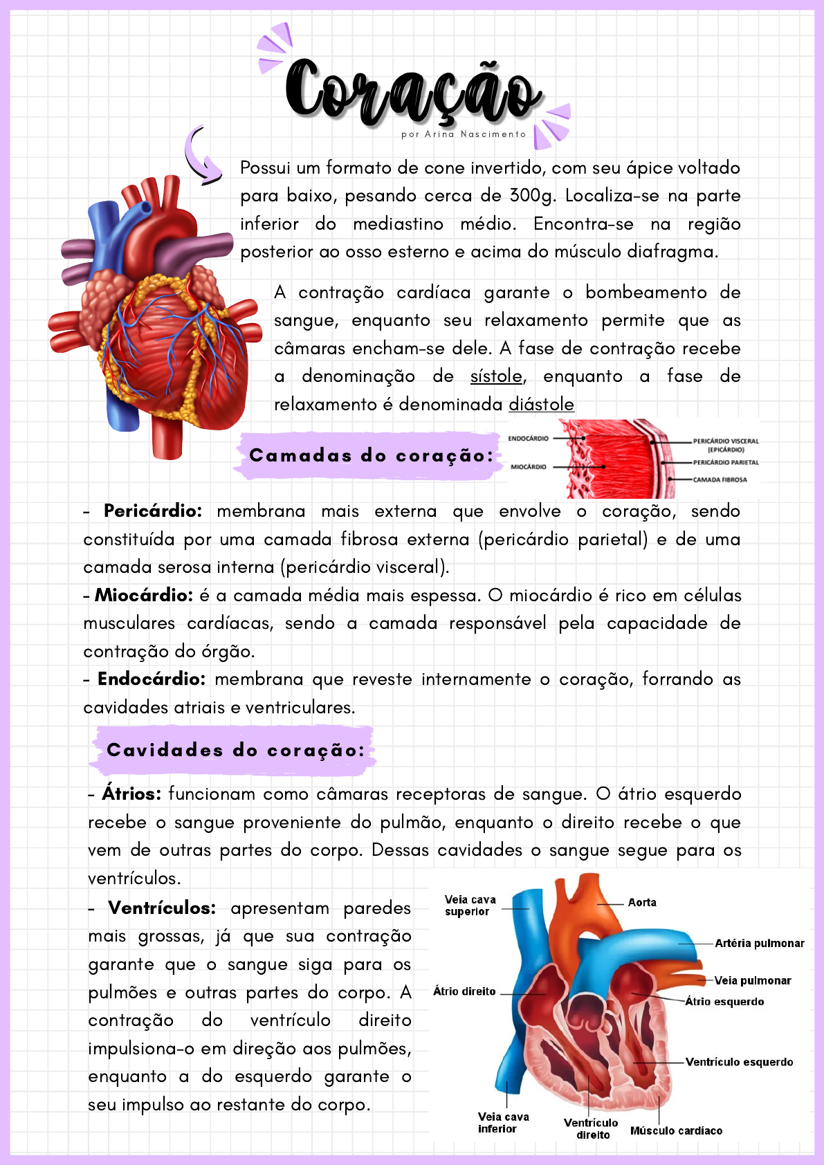 Camadas do coração: Cavidades do coração: - Pericárdio: membrana mais externa que envolve o coração, sendo constituída por uma camada fibrosa externa (pericárdio parietal) e de uma camada serosa interna (pericárdio visceral). - Miocárdio: é a camada média mais espessa. O miocárdio é rico em células musculares cardíacas, sendo a camada responsável pela capacidade de contração do órgão. - Endocárdio: membrana que reveste internamente o coração, forrando as cavidades atriais e ventriculares. p o r A r i n a N a s c i m e n t o Possui um formato de cone invertido, com seu ápice voltado para baixo, pesando cerca de 300g. Localiza-se na parte inferior do mediastino médio. Encontra-se na região posterior ao osso esterno e acima do músculo diafragma. A contração cardíaca garante o bombeamento de sangue, enquanto seu relaxamento permite que as câmaras encham-se dele. A fase de contração recebe a denominação de sístole, enquanto a fase de relaxamento é denominada diástole - Átrios: funcionam como câmaras receptoras de sangue. O átrio esquerdo recebe o sangue proveniente do pulmão, enquanto o direito recebe o que vem de outras partes do corpo. Dessas cavidades o sangue segue para os ventrículos. - Ventrículos: apresentam paredes mais grossas, já que sua contração garante que o sangue siga para os pulmões e outras partes do corpo. A contração do ventrículo direito impulsiona-o em direção aos pulmões, enquanto a do esquerdo garante o seu impulso ao restante do corpo.