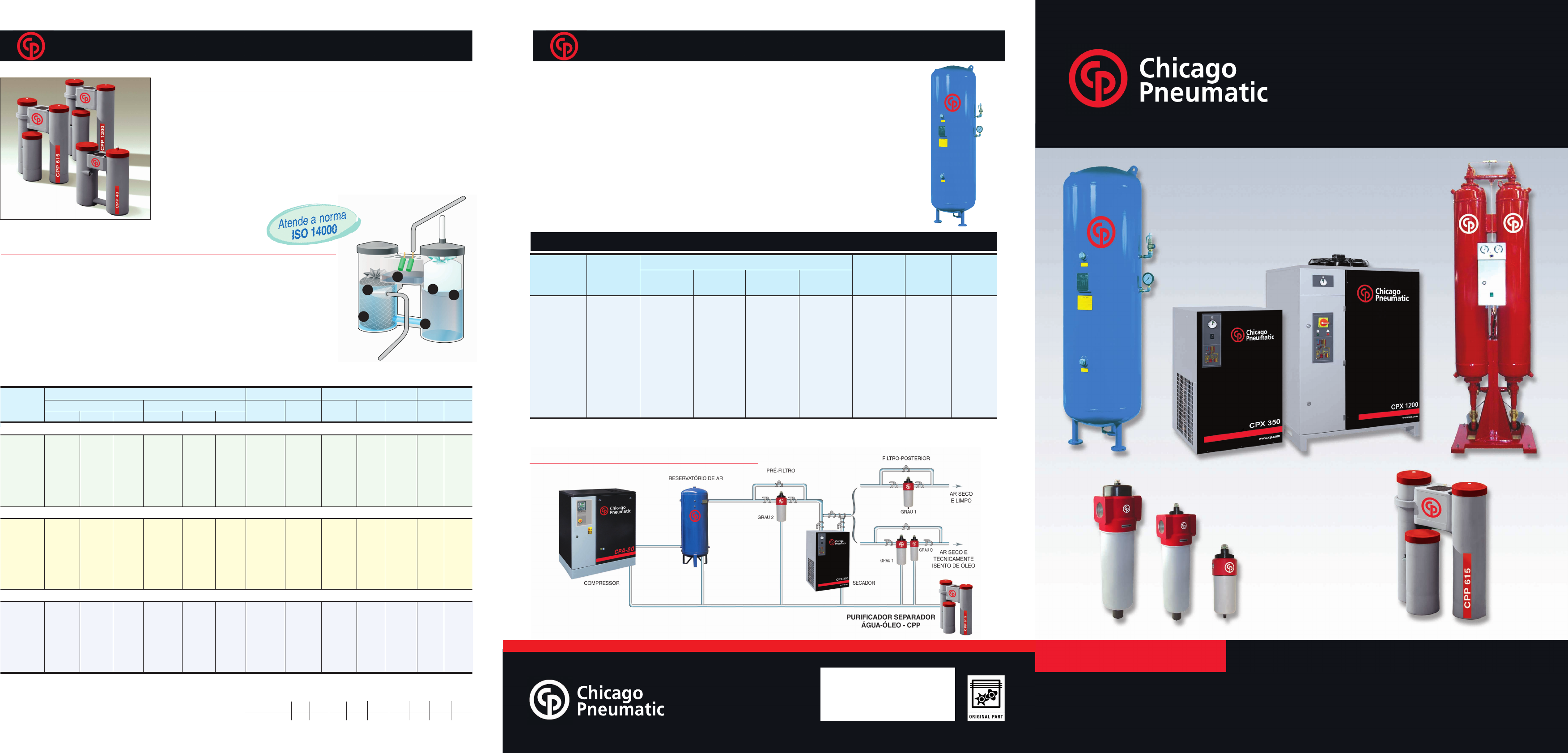 Instalação Típica do Ar Comprimido Reservatórios de arPurificador Separador de água-óleo ag os to 2 00 8/ 2ª ed içã o/ Tr at am en to d e ar VAZÃO Ø Ø CONEXÕES DIMENSÕES (mm) PESO (kg) MODELO COM SECADOR SEM SECADOR l/min m3/h pcm l/min m3/h pcm ENTRADA SAÍDA COMPR. LARG. ALTURA VAZIO CARGA Clima Frio: Temperatura ambiente = 15ºC ; Umidade Relativa 60% ; Residual de Óleo = 10 mg/l CPP 40 3.908 234 138 6.315 379 223 1 x 1/2" 1 x 1/2" 470 165 600 4 16 CPP 100 10.817 649 382 16.820 1.009 594 2 x 1/2" 1 x 1/2" 680 255 750 13 51 CPP 150 16.197 972 572 24.919 1.495 880 2 x 1/2" 1 x 1/2" 680 255 750 15 53 CPP 360 39.927 2.396 1.410 62.127 3.728 2.194 2 x 3/4" 1 x 3/4" 750 546 900 25 80 CPP 615 69.036 4.142 2.438 108.057 6.483 3.816 2 x 3/4" 1 x 3/4" 750 546 1.030 26 103 CPP 850 93.049 5.583 3.286 144.699 8.682 5.110 2 x 3/4" 1 x 3/4" 945 650 1.100 28 151 CPP 1200 133.259 7.995 4.706 207.138 12.428 7.315 2 x 3/4" 1 x 3/4" 945 695 1.100 30 164 CPP 2430 266.546 15.993 9.413 413.992 24.839 14.620 2 x 1” 1 x 1" 945 1185 1.100 60 324 Clima Temperado: Temperatura ambiente = 25ºC ; Umidade Relativa 60% ; Residual de Óleo = 10 mg/l CPP 40 2.124 127 75 2.690 161 95 1 x 1/2" 1 x 1/2" 470 165 600 4 16 CPP 100 5.692 341 201 7.079 425 250 2 x 1/2" 1 x 1/2" 680 255 750 13 51 CPP 150 8.693 522 307 10.506 630 371 2 x 1/2" 1 x 1/2" 680 255 750 15 53 CPP 360 21.323 1.279 753 26.108 1.566 922 2 x 3/4" 1 x 3/4" 750 546 900 25 80 CPP 615 36.331 2.180 1.283 45.618 2.737 1.611 2 x 3/4" 1 x 3/4" 750 546 1.030 26 103 CPP 850 49.526 2.972 1.749 61.221 3.673 2.162 2 x 3/4" 1 x 3/4" 945 650 1.100 28 151 CPP 1200 70.849 4.251 2.502 87.357 5.241 3.085 2 x 3/4" 1 x 3/4" 945 695 1.100 30 164 CPP 2430 141.669 8.500 5.003 174.715 10.483 6.170 2 x 1” 1 x 1" 945 1185 1.100 60 324 Clima Quente: Temperatura ambiente = 35ºC ; Umidade Relativa 60% ; Residual de Óleo = 10 mg/l CPP 40 1.019 61 36 1.189 71 42 1 x 1/2" 1 x 1/2" 470 165 600 4 16 CPP 100 2.690 161 95 2.973 178 105 2 x 1/2" 1 x 1/2" 680 255 750 13 51 CPP 150 4.191 251 148 4.531 272 160 2 x 1/2" 1 x 1/2" 680 255 750 15 53 CPP 360 10.194 612 360 11.412 685 403 2 x 3/4" 1 x 3/4" 750 546 900 25 80 CPP 615 17.415 1.045 615 19.822 1.189 700 2 x 3/4" 1 x 3/4" 750 546 1.030 26 103 CPP 850 24.013 1.441 848 26.420 1.585 933 2 x 3/4" 1 x 3/4" 945 650 1.100 28 151 CPP 1200 34.207 2.052 1.028 37.831 2.270 1.336 2 x 3/4" 1 x 3/4" 945 695 1.100 30 164 CPP 2430 68.725 4.123 2.427 75.634 4.538 2.671 2 x 1” 1 x 1" 945 1185 1.100 60 324 Nota: - Concentração de residual de óleo de 10 mg/l - Ciclo de trabalho a 7 bar por 12 hs/dia Para condições diferentes: multiplicar a capacidade pelo respectivo coeficiente: Horas de Trabalho: horas/dia 8 10 12 14 16 18 20 22 24 coeficiente 1.5 1.2 1 0.86 0.75 0.67 0.6 0.55 0.5 1- O condensado (água/óleo) entra pelos silenciadores e despressurizam na câmara de expansão. 2- A mistura emulsificada entra na torre A e passa pelo filtro Oleophilic, que absorve o óleo mas não a água. 3- O filtro oleophilic flutua na água e absorve qualquer óleo restante da superfície. O peso do óleo faz o filtro afundar gradualmente, mantendo limpo o material em contato com a superfície da água. A haste de saturação indica o momento de troca do filtro. 4- O condensado significativamente limpo, flui da torre A para a torre B. 5- A torre B contém uma bolsa com grãos de carbono ativado, absorvendo qualquer resíduo de óleo no condensado. 6- O condensado flui praticamente sem nenhum resíduo de óleo, podendo ser descartado seguramente. CPP Fluxograma A CP comercializa reservatórios de ar comprimido (vertical) com capacidade volumétrica de 0,1 a 10 m3, pressão - 10 bar, com: kit acessórios • Manômetro • Válvula de segurança • Válvula manual (tipo esférica) para o dreno. OPCIONALMENTE: • Pressão de 14 bar • Purgador eletrônico • Pressostato • Cor de acabamento externo • Termômetro • Pintura interna (a partir de 2 m3) Nota: • Todos os reservatórios seguem código projeto - ASME - SEC. VIII - DIV. I e atendem a NR 13. • Acompanha o reservatório “data book” com os certificados de lote e inspeção do produto. MODELO AR-110 0,10 930 500 463 463 2 NPT 60 10 AR-251 0,25 1750 506 718 718 2 NPT 106 10 AR-351 0,35 1800 570 754 754 2 NPT 148 10 AR-510 0,50 2540 570 755 755 2 NPT 194 10 AR-1010 1 2618 765 794 1754 2 NPT 388 10 AR-2010 2 2990 1070 950 2050 F4 (ANSI) 865 10 AR-3010 3 3164 1220 990 2090 F5 (ANSI) 1140 10 AR-4010 4 3564 1320 1100 2050 F5 (ANSI) 1420 10 AR-6010 6 4022 1525 1200 2150 F6 (ANSI) 2110 10 AR-8010 8 4466 1680 1300 2150 F8 (ANSI) 2990 10 AR-10010 10 4812 1830 1300 2150 F8 (ANSI) 3670 10 DIMENSÕES (mm) CONEXÕES PESO PRESSÃO POLEGADA (Kg) (BAR)ALTURA DIÂMETRO ALTURA ALTURA EXTERNO DE ENTRADA DE SAÍDA VOLUME (m3) • T od os o s da do s de st e f o lh et o e ilu st ra çõ es (f ot os ) p od er ão s of re r a lte r a çõ es à c rit ér io d a C P s em p r é vi o a v is o. Características Técnicas Características Técnicas 1 2 36 5 4 B A Despejar condensados com óleo e/ou hidrocarboneto em sistemas de esgoto, é ilegal e prejudicial ao meio ambiente. O óleo é um alto poluente, mesmo em pequenas quantidades pode poluir grandes volumes de água. A CP coloca à disposição do mercado industrial a mais alta tecnologia em purificadores separadores de água-óleo para proteger o meio ambiente, através do descarte legal e consciente, conforme norma ISO 14000. O Purificador CPP separa o óleo contido nos condensados, utilizando um processo de multiestágios de altíssima eficiência. Sua instalação é simples, não requer energia elétrica e a utilização é extremamente fácil. AUTORIZADO: Rua São Paulo, 137 - Alphaville Empresarial Barueri - SP - CEP 06465-130 Tel.: (11) 2189-3900 • Fax.: (11) 6845-2367 vendas@cp.com • servicos.pv@cp.com Chicago Pneumatic Brasil Ltda. Tratamento de Ar Comprimido Secadores por refrigeração - CPX - DLW Secadores por Adsorção - CPDA - CPDH