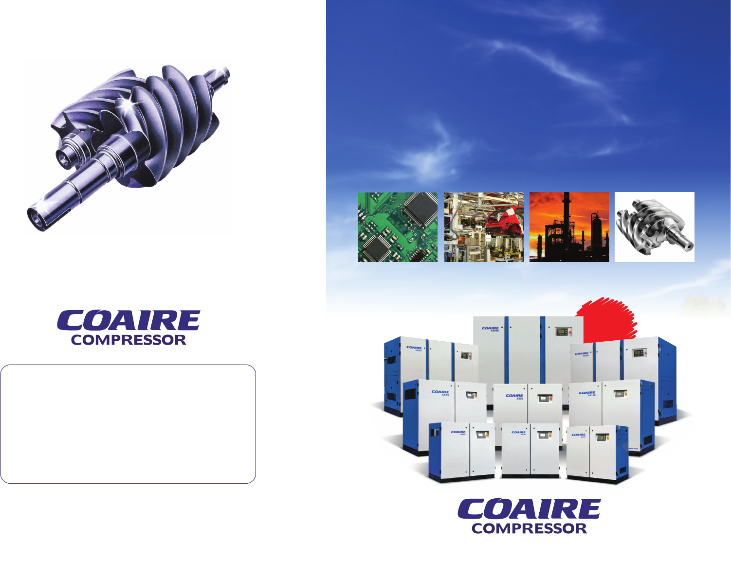 www.coaire.com.br www.coaire.com.br TREA COM. IMP. EXP. LTDA Escritório Principal: Rua: Henrique Ongari, 59 Água Branca São Paulo-SP Brasil - Cep: 05037-150 Fone: 55 11 3337.3077 Fax: 55 11 3362.2738 www.coaire.com.br COMPRESSORES - PARAFUSO Sistemas com Acoplamento Direto E"ciente Tecnologia 2011 NOVOS MODELOS 2011 NOVOS MODELOS Forte Poder Operação Silenciosa Forte Unidade Compressora Motor Altamente E"ciente Uma Conversa Privada Durante a Operação Silenciosa Superioridade Em Baixo Nível de Ruído A e!ciência volumétrica é maximizada pelo per!l de design exclusivo Coaire, que otimizam as linhas de vedação e minimizam os vazamentos. Mais forte e arejado, com uma melhor vedação, os rotores between em linha são desenvolvidos pela Coaire. O per!l 4+5 assimétrica aumenta a e!ciência de isolamento térmico de 9% em relação ao per!l conven- cional. A Coaire garante a vazão de ar de alta e!ciência por unidade de energia, reduz as despesas de operação do cliente. O sistema que diretamente acoplado a unidade compressora com motor, reduz as despezas com manuteção. O motor altamente e!ciente utiliza as normas e padrões internacionais de fabricação. São aplicados testes (OMNI) permitindo o consumo mínimo de energia de operação.(Modelo 100HP, ALTO RENDIMENTO DE 94,5%). Seção de rolamentos SKF e baixa velocidade. Motor de 4 pólos de indução tipo gaiola de esquilo irá prolongar a vida útil do produto. O design exclusivo e o duplo revestimento na unidade compressora minimizam o ruído do ar comprimido. Os silenciosos ventiladores Siroco, foram submetidos a testes e fabricados após terem sidos concebidos resultados excelentes otimizando o 7uxo de ar de arrefecimento, o que permitiu reduzir o ruído do atrito do ar. Inoxidáveis tubos 7exíveis são utilizados em peças articuláveis para evitar a vibração ao mesmo tempo que reduzem signi!cativamente o nível de ruído e vazamentos. A alta densidade de absorção dos isoladores acústicos são usados para minimizar os níveis de ruído. AS30 AS50 AS100 70dB(A) 68dB(A) 74dB(A) AS30 AS50 AS100 68dB(A) 65dB(A) 72dB(A) AS30 AS50 AS100 71dB(A) 67dB(A) 75dB(A) AS30 AS50 AS100 71dB(A) 66dB(A) 75dB(A) Controle Standard Praticidade e Elegância Fácil Operação Fácil Manutenção Fácil Instalação Excelente Durabilidade Componentes Top-Class 5 Etapas - Sistema De Qualidade O teclado é projetado tendo em conta os movimentos do operador. Multi idiomas (Português, Inglês e Coreano) são produzidos em função de utilização internacional. A interface de controle torna mais fácil o acesso para usuários iniciantes. Tela grande de LCD permite um fácil acompanhamento visual. Histórico de operação salvo em 160 itens. O nível de óleo é indicado com precisão através da opção de indicador de nível de óleo. Um registro reduz o tempo de serviço para efetuar a drenagem do óleo. Os manômetros e indicadores de temperatura que estão ligados ao tanque de separação são uma referência útil durante a manutenção O ventilador de refrigeração mantém o motor da máquina funcionando de forma estável à uma temperatura ambiente de 50 º C. O sistema de rolamentos duplos que possuem uma estrutura de pré-carga tem a durabilidade de 50.000 horas. O Verdadeiro Óleo Coaire é desenvolvido em parceria com empresas nacionais, garantindo a qualidade e aumentando o tempo de vida útil do equipamento. : O design de todos os produtos Coaire são executados e !nalizados com a simulação em condições reais de uso. Todos os componentes utilizados pela Coaire são rigorosamente testa- dos. Testes de performance são realizados de acordo com a ISO e KS. Todas as simulações são efetuadas em sevéras condições de operação, para realmente obter a durabili- dade do produto. testes de campo são realizados em nossa empresa para diferentes tipos de clientes – todos bem sucedi- dos! Alta Durabilidade A manutenção é feita com tempo e esforço mínimo por uma simples abertura frontal, no qual a maioria dos componentes substituíveis são acessados. Os anéis com alta qualidade na borda do tanque separador minimizam as peças a serem alteradas e, portanto, reduz o custo de manutenção. Baixo nível de ruído de funcionamento do compressor de ar Coaire. - A tubulação curta também minimiza os custos de instalação. - O funcionamento silencioso do compressor de parafuso não exige uma sala separada e minimiza os custos de instalação. Compressores de ar Coaire podem operar em condições de alta temperatura ambiente, minimizando assim os dutos de ventilação. - A sala de máquina pode obter espaços maiores, devido aos poucos requisitos de instalação. O sistema de refrigeração projetado pela simulação do 7uxo de ar mantém a baixa temperatura dentro do equipamento, usando um descarregamento do ar quente. O !ltro de sucção, !ltro de óleo e separador de óleo são desenvolvidos e produzidos por uma empresa Alemã. Sua qualidade tem sido rigorosamente testada com sucesso. A válvula de sucção, válvula by-pass e outras válvulas garantem um funcionamento estável em qualquer condi- ção. Nossos produtos passaram por mais de 500 mil testes de durabilidade. Os controladores microprocessados da Coaire são certi!cados pela EMI, EMC e CE (órgãos certi!cadores). 30% Carga 30% 50% 70% 90% 50% 70% 90% Força Standard VSD 30% Energy Saving MAX MIN Capacidade de Saída Controle de Velocidade Variável Características e Benefícios Exemplos De Operação (VSD) Controle Inversor Efeitos do Inversor de Frequência Aplicação Do Inversor No Compressor Opções Inversor e Painel Elétrico Motor Principal Tanque Separador Unidade Compressora Filtro de Sucção Resfriador de Óleo Painel (controle inversor) Taxa de carga: 76,7% Consumo de energia elétrica total: - Carga Elétrica: 89,2% - Descarregamento de Eletricidade: 10,8% O adaptador VSD tem 10,8% de economia em energia em comparação com a condição de entrad