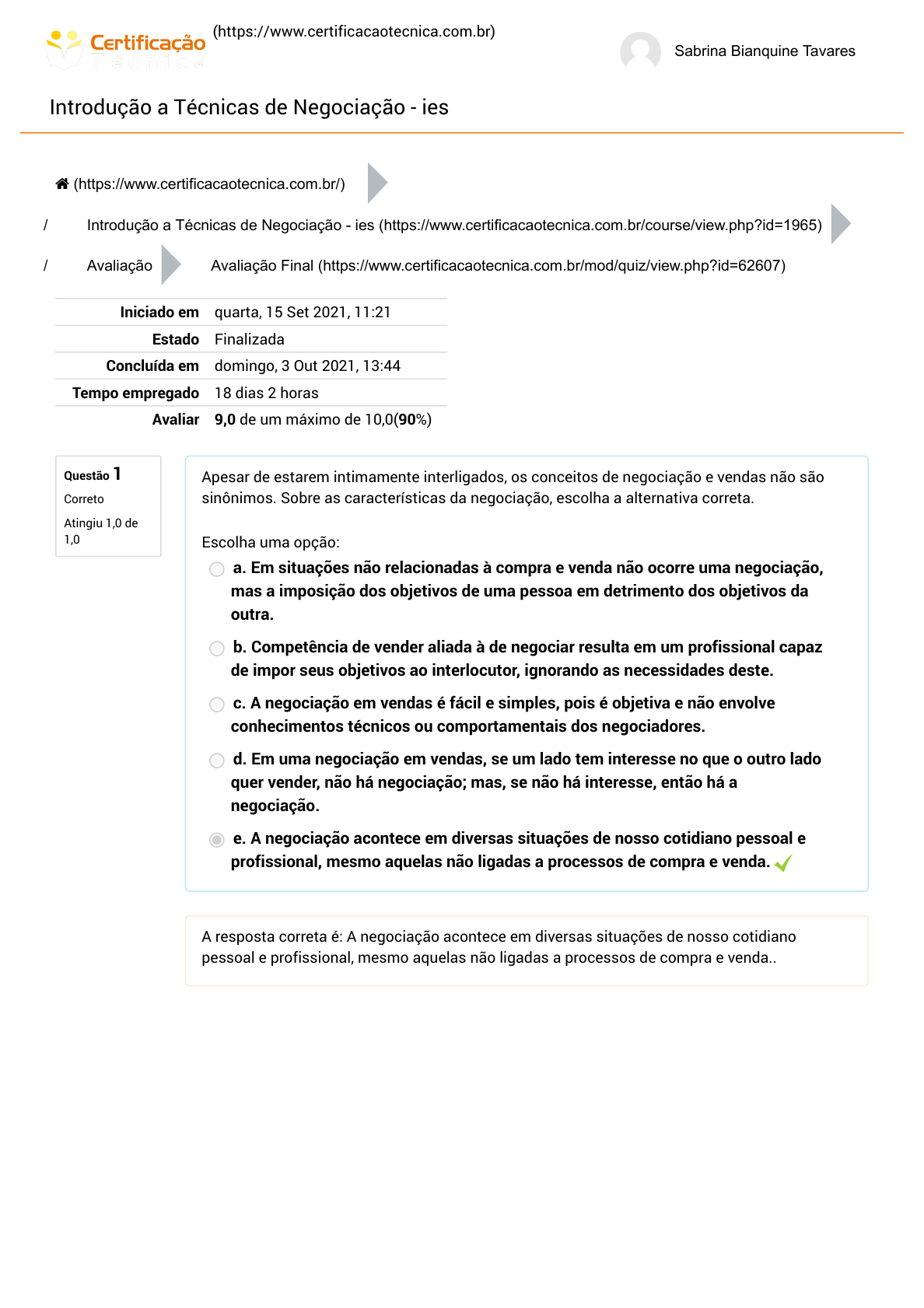 (https://www.certificacaotecnica.com.br) Sabrina Bianquine Tavares Introdução a Técnicas de Negociação - ies Questão 1 Correto Atingiu 1,0 de 1,0 / / / Iniciado em quarta, 15 Set 2021, 11:21 Estado Finalizada Concluída em domingo, 3 Out 2021, 13:44 Tempo empregado 18 dias 2 horas Avaliar 9,0 de um máximo de 10,0(90%) Apesar de estarem intimamente interligados, os conceitos de negociação e vendas não são sinônimos. Sobre as características da negociação, escolha a alternativa correta. Escolha uma opção: a. Em situações não relacionadas à compra e venda não ocorre uma negociação, mas a imposição dos objetivos de uma pessoa em detrimento dos objetivos da outra. b. Competência de vender aliada à de negociar resulta em um profissional capaz de impor seus objetivos ao interlocutor, ignorando as necessidades deste. c. A negociação em vendas é fácil e simples, pois é objetiva e não envolve conhecimentos técnicos ou comportamentais dos negociadores. d. Em uma negociação em vendas, se um lado tem interesse no que o outro lado quer vender, não há negociação; mas, se não há interesse, então há a negociação. e. A negociação acontece em diversas situações de nosso cotidiano pessoal e profissional, mesmo aquelas não ligadas a processos de compra e venda. A resposta correta é: A negociação acontece em diversas situações de nosso cotidiano pessoal e profissional, mesmo aquelas não ligadas a processos de compra e venda.. (https://www.certificacaotecnica.com.br/) Introdução a Técnicas de Negociação - ies (https://www.certificacaotecnica.com.br/course/view.php?id=1965) Avaliação Avaliação Final (https://www.certificacaotecnica.com.br/mod/quiz/view.php?id=62607) https://www.certificacaotecnica.com.br/ https://www.certificacaotecnica.com.br/ https://www.certificacaotecnica.com.br/course/view.php?id=1965 https://www.certificacaotecnica.com.br/mod/quiz/view.php?id=62607 Questão 2 Correto Atingiu 1,0 de 1,0 Questão 3 Correto Atingiu 1,0 de 1,0 Assinale a alternativa que completa corretamente a sentença. O cargo de supervisor de vendas externas pode ter diversos nomes diferentes em cada empresa, como supervisor de vendas, coordenador de vendas ou gerente de vendas. Sobre esse cargo, é correto afirmar que ________________. Escolha uma opção: a. não desempenha papel na gestão. Sua atividade consiste em acompanhar relatórios e análises do desempenho de sua equipe. b. tem responsabilidades ligadas à gestão de processos e atividades, mas não exerce o papel de líder. c. tem o papel de supervisionar, orientar e controlar a execução das atividades da equipe de vendas externas. d. deve evitar visitar o mercado com os vendedores externos. Sua agenda é interna, acompanhando o gerente ou diretor comercial. e. participa do planejamento e acompanha a agenda de visitas dos vendedores, sem, contudo, acompanhá-los fisicamente na rota. A resposta correta é: tem o papel de supervisionar, orientar e controlar a execução das atividades da equipe de vendas externas.. Assinale a alternativa que completa corretamente a sentença. A negociação é um tema que pode ser analisado de várias formas, pois há diversas maneiras de ela ocorrer e já foi objeto de estudo para muitos pesquisadores. No contexto da gestão comercial, um dos modelos mais conhecidos é o Método Harvard de Negociação. Sobre a forma como ele ocorre, podemos afirmar que Escolha uma opção: a. o negociador precisa falar bastante, para evitar que o outro lado possa opinar. b. é composto de quatro fases: planejamento, sondagem, propostas e acordo. c. tem como pilar o uso do poder para obrigar o outro lado a aceitar a proposta. d. é composto de quatro fases: levantamento de dados, propostas, pressão e fechamento. e. os objetivos de cada lado se mantêm ocultos, o que impede a criação de relacionamentos. A resposta correta é: é composto de quatro fases: planejamento, sondagem, propostas e acordo.. Questão 4 Incorreto Atingiu 0,0 de 1,0 Questão 5 Correto Atingiu 1,0 de 1,0 Um dos aspectos que diferencia o conceito de liderança do conceito de autoridade formal é que a liderança é baseada na crença dos membros da equipe quanto às qualidades do líder. Sobre essa visão de liderança, escolha a alternativa correta. Escolha uma opção: a. O principal papel do líder é dar ordens ao grupo e punir as pessoas que não exercem suas atividades. b. Mesmo que o grupo não enxergue mais valor ou utilidade no líder, continua seguindo suas orientações. c. A liderança é ligada necessariamente ao cargo hierárquico e extrapola os limites do grupo que acredita no líder ou precisa dele. d. As pessoas respeitam o líder pelas suas competências e decidem seguir suas orientações. e. Pessoas ou grupos que não estão sob a influência do líder devem seguir as ordens e orientações dadas por ele. A resposta correta é: As pessoas respeitam o líder pelas suas competências e decidem seguir suas orientações.. A última fase da negociação é o acordo. Para que o acordo final ocorra, é importante que ambas as partes concluam que seus objetivos foram alcançados. Sobre essa fase, marque a alternativa correta. Escolha uma opção: a. Quando um dos lados faz concessões maiores do que poderia durante a negociação, o desfecho é denominado acordo interativo. b. O acordo é o momento do intercâmbio final, do fechamento do negócio, em que todos os pontos negociados devem ser repassados. c. Durante uma negociação, poucas condições são oferecidas durante o processo, portanto não há necessidade de repassar os pontos do acordo. d. Deve-se evitar repassar os pontos acordados ao final da negociação, para evitar alertar o outro lado sobre algum ponto que ele não tenha entendido. e. Mal-entendidos e erros de comunicação não geram problemas nas negociações, pois podem ser resolvidos tranquilamente depois do acordo. A resposta correta é: O acordo é o momento do intercâm