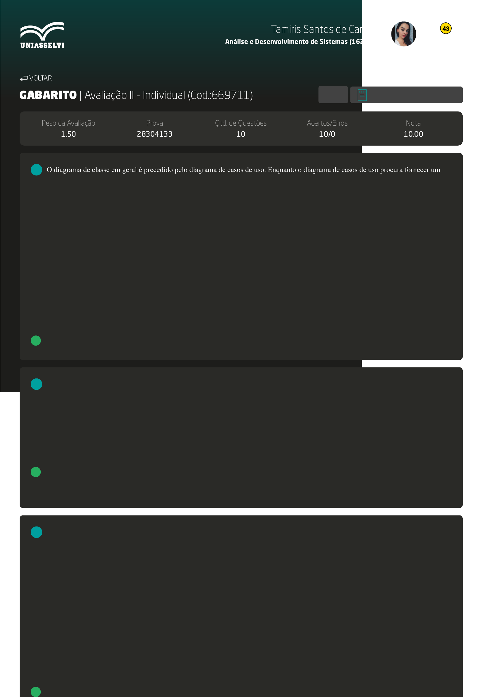 GABARITO | Avaliação II - Individual (Cod.:669711) Peso da Avaliação 1,50 Prova 28304133 Qtd. de Questões 10 Acertos/Erros 10/0 Nota 10,00 O diagrama de classe em geral é precedido pelo diagrama de casos de uso. Enquanto o diagrama de casos de uso procura fornecer uma representação do problema que deve ser solucionado de forma sistêmica, o diagrama de classes tem seu enfoque em fornecer a representação de uma solução para este problema, na forma de classes, atributos, métodos e relacionamentos. Considerando as características dos diagramas de classes, classifique V para as sentenças verdadeiras e F para as falsas: ( ) Os métodos setters fornecem acesso de escrita a um atributo. ( ) Através da herança, é possível reaproveitar atributos já definidos em uma classe mãe. ( ) A herança múltipla consiste em uma classe mãe possuir várias filhas. Agora, assinale a alternativa que apresenta a sequência CORRETA: A F - F - V. B F - V - F. C V - F - F. D V - V - F. São diagramas estáticos e estruturais. Auxiliam a visualizar, descrever e documentar diferentes perspectivas de um sistema. Servem de alicerce para a construção da codificação do aplicativo. São amplamente utilizados na modelagem de sistemas orientados a objetos, porque eles são os únicos diagramas UML que podem ser mapeados diretamente em linguagens orientadas a objeto. As características apresentadas definem o diagrama de: A Casos de uso. B Atividades. C Classes. D Sequência. A Linguagem de Modelagem Unificada - UML - é uma notação de diagramas que facilita a especificação, a visualização e a documentação de softwares desenvolvidos no paradigma de orientação a objetos. É composta por muitos elementos que têm o objetivo de representar de forma clara todas as partes de uma aplicação computacional. Estes elementos são usados na criação dos diagramas que representam partes do sistema de forma individual. Sobre os elementos que compõem o diagrama de classes, analise as opções a seguir: I- Classes. II- Associações. III- Mensagem. IV- Estado. V- Transição. Agora, assinale a alternativa CORRETA: A As opções I, II e III estão corretas. B As opções I e II estão corretas. VOLTAR A+ Alterar modo de visualização 1 2 3 Tamiris Santos de Campos Análise e Desenvolvimento de Sistemas (1628578) 43 C As opções II, III e IV estão corretas. D As opções I, III e IV estão corretas. Uma classe num Diagrama de Classes (ou até mesmo no código fonte) é apenas um conceito. Um conceito em forma de desenho (se num diagrama) ou texto (se em código fonte). Quando a Classe é materializada através de um software, (quando o software está "rodando") torna-se um objeto (isso se dá quando é alocado um ponteiro de memória para esta classe). O diagrama de classes ilustra graficamente como será a estrutura do software (em nível micro ou macro), e como cada um dos componentes da sua estrutura estarão interligados. Considerando as características dos diagramas de classes, classifique V para as sentenças verdadeiras e F para as falsas: ( ) Os métodos setters fornecem acesso de escrita a um atributo. ( ) Através da herança, é possível reaproveitar atributos já definidos em uma classe mãe. ( ) A herança múltipla consiste de uma classe mãe possuir várias filhas. ( ) Objetos ou atributos transientes não são serializados e, consequentemente, não são persistidos. Assinale a alternativa que apresenta a sequência CORRETA: A F - F - V - F. B V - F - F - V. C F - V - F - V. D V - V - F - V. Um diagrama UML é uma apresentação gráfica de uma coleção de elementos do modelo de um sistema. Existe uma classificação para o diagrama utilizado pela UML que apresenta a interação entre os objetos com relação ao tempo e sequência de execução. Sobre esse diagrama, assinale a alternativa CORRETA: A Objetos. B Sequência. C Componentes. D Classe. O diagrama de sequência é usado em UML para representar a sequência de processos em um programa de computador ou sistema de informação. Ele dá ênfase à ordenação temporal em que as mensagens são trocadas entre os objetos de um sistema. Com relação ao diagrama de sequência, analise as sentenças a seguir: I- A notação para uma mensagem em um diagrama de sequência é uma flecha. II- A seta de envio de mensagens parte sempre do objeto remetente. III- O formato da ponta da seta indica o tipo de mensagem enviada. IV- Os tipos de mensagens enviadas são: assíncrona, síncrona e duplamente encadeada. Assinale a alternativa CORRETA: A As sentenças I e IV estão corretas. B As sentenças I, II e III estão corretas. C As sentenças I, III e IV estão corretas. D As sentenças II e IV estão corretas. Podemos dizer que os diagramas de classes são os principais diagramas estruturais da UML, pois ilustram as classes, as interfaces e os relacionamentos entre elas. Os diagramas de classes ilustram atributos e operações de uma classe e as restrições com o que os objetos podem 4 5 6 7 Tamiris Santos de Campos Análise e Desenvolvimento de Sistemas (1628578) 43 ser conectados; descrevem também os tipos de objetos no sistema e os relacionamentos entre estes objetos. Sobre o diagrama de classe da UML, assinale a alternativa CORRETA: A Seu foco é a estrutura do software. B Tem ampla utilização, pois mostra o conjunto de classes, interfaces, colaborações e relacionamentos. C As classes não representam as tabelas na base de dados. D Todos os objetos mapeados obrigatoriamente devem pertencer a um diagrama de classes. A Linguagem de Modelagem Unificada - UML - dá suporte para a criação de modelos claros e objetivos para facilitar a construção de aplicativos computacionais. É composta por 23 diagramas e os divide em duas categorias: estruturais e comportamentais. Podemos dizer que é um exemplo de diagrama estrutural e comportamental, respectivamente, os diagramas de: A Tempo e Componentes. B Sequência e Pacote. C Objeto e Sequ