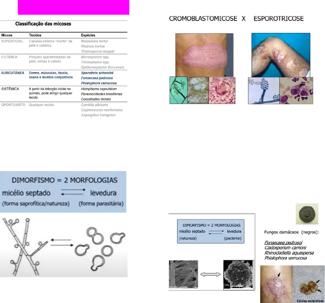 Infecções Subcutâneas Essas infecções subcutâneas são causadas por fungos dimórficos, que apresentam dimorfismo térmico e apresentam uma transição entre as formas filamentosas (de vida saprofítica – na natureza) e levedura (de vida parasitária – no paciente). Características gerais -Agentes etiológicos que são fungos dimórficos: forma filamentosa (saprofítica) e levedura (parasitária) -Doença se inicia pela implantação traumática do fungo direto no tecido subcutâneo, pressupõe um corte para implantar ou um acidente com um espinho, que perfura. Mas a pele precisa ser rompida. -Fungos sem capacidade de invadir pele integra, ausência de queratinase diferente dos fungos que causam a dermatofitose que possuem essa queratinase e são capazes de causar lesão na pele integra. As infecções subcutâneas causadas por fungos que são mais predominantes no Brasil: -Cromoblastomicose: acontece na América como um todo, mas o Brasil é o pais que tem a maior prevalência, sendo com maior número de casos no Pará. -Esporotricose Cromoblastomicose -É uma micose subcutânea, de curso crônico, causada por fungos demáceos (negros). -Este fungo vive em plantas e restos de matéria orgânica em decomposição no solo. -Usualmente, acomete trabalhadores rurais, que trabalham sem vestimentas adequadas e descalços. Dimorfismo nos agentes da cromoblastomicose O fungo demáceos que é negro na forma filamentosa, na placa de Petri. E na lesão ele estará na forma leveduriforme no paciente, e apresenta esse formato, que são as células escleróticas, que são isoladas da lesão. Nas fotos são os mesmos fungos só que em formas diferentes. Essa espécie (Fonsecaea pedrosoi) foi isolada de uma planta Mimosa Pudica (“dormideira”), no Belém do Pará. Na lesão do paciente ele lembrava que havia caído em cima dessa planta. E esse fungo fica nessa planta ou em qualquer outro substrato, ou seja, na lesão do paciente tinha células escleróticas e na planta sendo na natureza tinha o micélio septado. Indução do dimorfismo em Fonsecaea pedrosoi Requer primeiro a implantação traumática do fungo e a colonização da derme, e com isso iremos observar que haverá um: aumento da temperatura local, resposta imune, atividade lisossomal (pH baixo), sinalização dependente de Ca+2, indução do dimorfismo fúngico passando da forma filamentosa para a forma leveduriforme. Manifestações clínicas da cromoblastomicose 1. Forma nodular: ocorre na fase inicial da doença, podendo permanecer estacionária. 2. Forma ulcero-vegetante (placa): lesões de crescimento crostoso, muitas vezes confluem entre si. 3. Forma verrucosa: caracteriza-se por espessamento e endurecimento da derme e epiderme, decorrente de hiperceratose e hiperacantose. -Hiperceratose: aumento da espessura da camada córnea da pele. -Hipercantose: espessamento do corpo mucoso de Malpighi (estrato germinativo) da epiderme. Diagnóstico Laboratorial 1. Exame direto (raspado da borda da lesão): Fungos demáceos. -Espera-se que, usualmente encontra-se elementos arredondados, de 5-12 micrometros de diâmetro, cor marrom, parede espessa, com os septos transversais e/ou longitudinais. -Forma tecidual: denominada de células escleróticos ou corpos muriformes. 2. Exame de cultura: Observando a forma saprofítica. Fundamental para identificação dos gêneros e espécies. -Observa-se os diferentes tipos de formação de conídios (conidiogênese). Na imagem acima mostra o padrão de conidiogênese que diferem entre si. Tratamento x Cura: Difícil de ser obtida -Extração cirúrgica (ou crioterapia) associada a antifúngico. -Itraconazol -Itraconazol + Terbinafina -Anfotericina B (+ 5 fluorocitosina quando disponível) -Tratamentos prolongados: 6-24 meses -Alta taxa de recorrência – houve realmente cura, ou o paciente se infectou novamente??? Esporotricose Teve um surto epidêmico no Estado do Rio de Janeiro, onde observou que a partir de um determinado momento a esporotricose tinha um caráter de doença vinculada mais a situações de trabalho, ou de lazer. E passou a ser uma zoonose no estado do RJ. -É uma micose subcutânea, com formação de nódulos subcutâneos. -Agente etiológicos mais comuns são: Sporothrix schenckii e Sporothrix brasiliensis. Mas existem outras espécies do gênero Sporothrix envolvidas nessa condição. -Transmissão: Fungo encontrado em plantas e debris orgânicos. -Tradicionalmente: Doença adquirida por ferimentos durante manuseio de vegetais contaminados ou no contato com terra contaminada. Inclusive por conta disso tinha um nome popular “Doença da Roseira”. Mas ao longo do tempo sofreu uma modificação no seu processo de transmissão. Manifestações clínicas da Esporotricose 1. Forma cutânea fixa ou localizada: Lesão solitária confinada ao local de inoculo. Não há difusão. A lesão fica localizada no local do trauma onde o fungo foi implantado. 2. Forma linfocutânea: O fungo se dissemina pela circulação linfática, produzindo uma sequência de nódulos, que ficam restritos num único membro, onde ocorreu a lesão primária. 3. Forma cutânea disseminada: Forma mais rara, pode resultar da disseminação hematogênica, com comprometimento geral da pele do paciente. Usualmente, associada com pacientes com baixa imunidade. Obs: raramente, a esporotricose afeta pulmão, juntas - articulações, sistema nervoso central. No Rio de Janeiro a esporotricose passou a ter um caráter zoonótico, ou seja, passou a ter um animal transmitindo a infecção para seres humanos. Aconteceu na década de 90, onde se observou um aumento do número de casos de forma cutânea disseminada, aumento do número de casos de formas raras: como lesões no rosto e oculares. Na esporotricose ocular tem a opacificação da córnea que gera o impedimento da passagem de luz, e a pessoa fica cega, dependente de um transplante de córnea. -O RJ é uma área epidêmica para Esporotricose -Durante o ano de 1998