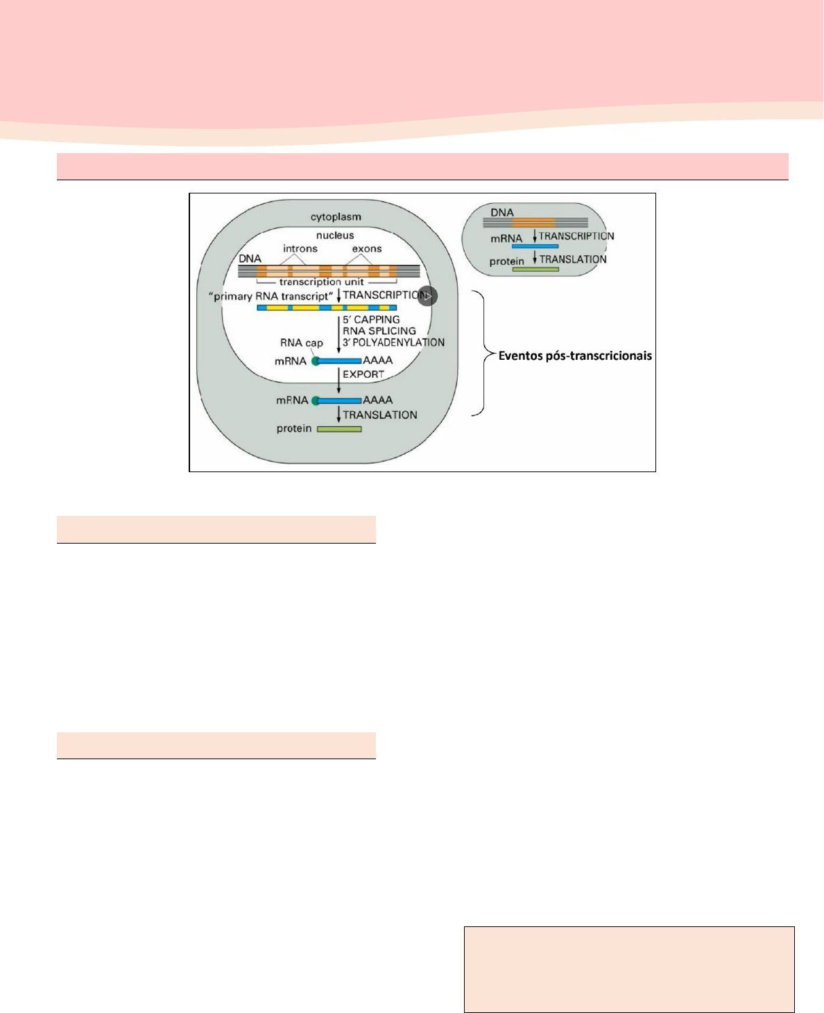 EVENTOS PÓS EVENTOS PÓS TRANSCRICIONAIS: Conceitos: Gene: sequência codificadora para formar a proteína. Nele há exons e introns. Exons (regiões em laranja escuro): partes codificadoras do gene Introns (região em laranja claro): sequência espaçadora entre os exons que não codificam gene. Processo: Durante a transcrição a RNA polimerase não identifica qual parte é exon e qual é intron, por isso há a transcrição completa. A transcrição gera o RNA mensageiro primário (mRNA primário). Splicing de introns: Os introns (sequências não codificadoras/representadas em amarelo na imagem) serão retirados, de forma que permaneçam só os exons (sequências codificadoras/representados em azul). Quando há apenas os exons no gene, o RNA passa a ser chamado de RNA mensageiro maduro (mRNA maduro/ representado todo em azul na imagem). Após isso, a mensagem do RNA mensageiro maduro precisa ser protegida antes de ir para fora do núcleo porque no citoplasma não pode ter ácido nucleico se não ele será degradado pelas exonucleases (enzimas que degradam ácidos nucleicos pelas pontas/extremidades). Na 5’ é acrescentado um CAP metilado ou guanosina modificada quimicamente (guanina modificada). Na 3’ é acrescentado uma cauda poli-A (de 50 a 200 adeninas) Em resumo, os eventos pós transcricionais são: • Splicing de introns; • Adição de G* a 5’ (CAP); • Adição de cauda poli-A a 3’. Todos esses eventos acontecem no núcleo e, após eles, o RNA mensageiro maduro segue para o citoplasma para ser lido através da tradução e posteriormente formar uma proteína. EVENTOS PÓS TRANSCRICIONAIS E TRADUÇÃO TRADUÇÃO – LEITURA DO MRNA: Quando o RNA mensageiro chega no citoplasma protegido para não ser degradado, um ribossomo se acopla ao mRNa e com o auxílio dos tRNA (RNA transportadores que transportam aminoácidos) acontece a tradução. Composição do ribossomo: proteína e rRNA. Enzima que coloca o aminoácido no tRNA = aminoacil – t- sintetase Os tRNA trazem aminoácidos, de forma que ele faz a leitura do códon e deixa o aminoácido para formação da proteína. 3 nucleotídeos da mensagem = 1 códon (O Anticódon é a parte que vai se complementar com 3 nucleotídeos do mRNA/Códon) Cada códon codifica um aminoácido (existem 20 diferentes tipos de aminoácidos e existem aqueles que só podem ser codificados por um único tipo de códon) e cada tRNA lê um códon. No final da leitura do mRNA, cada aminoácido codificado por cada códon vai sendo colocado no sítio da produção de proteína e então ela é sintetizada. Enzima peptidil-transferase = promove a ligação peptídica para formação da proteína. ESTRUTURAS PROTEICAS APÓS TRADUÇÃO: Após a adição do último aminoácido da proteína, inicia-se a curvatura (estrutura secundária). Proteína funcional = proteína tridimensional RECAPTULANDO - TIPOS E FUNÇÕES DO RNA: RNAm: contém o código do gene RNAt: é o adaptador que liga o mundo do ácido nucleico ao mundo das proteínas RNAr: faz parte do ribossomo e contém a enzima que catalisa a ligação entre aminoácidos adjacentes.