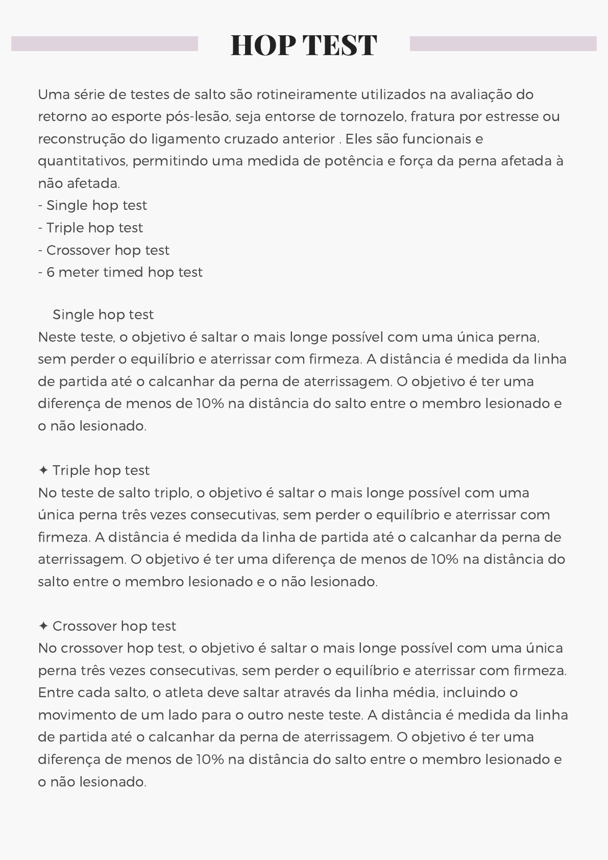 ✦ Single hop test Neste teste, o objetivo é saltar o mais longe possível com uma única perna, sem perder o equilíbrio e aterrissar com firmeza. A distância é medida da linha de partida até o calcanhar da perna de aterrissagem. O objetivo é ter uma diferença de menos de 10% na distância do salto entre o membro lesionado e o não lesionado. ✦ Triple hop test No teste de salto triplo, o objetivo é saltar o mais longe possível com uma única perna três vezes consecutivas, sem perder o equilíbrio e aterrissar com firmeza. A distância é medida da linha de partida até o calcanhar da perna de aterrissagem. O objetivo é ter uma diferença de menos de 10% na distância do salto entre o membro lesionado e o não lesionado. ✦ Crossover hop test No crossover hop test, o objetivo é saltar o mais longe possível com uma única perna três vezes consecutivas, sem perder o equilíbrio e aterrissar com firmeza. Entre cada salto, o atleta deve saltar através da linha média, incluindo o movimento de um lado para o outro neste teste. A distância é medida da linha de partida até o calcanhar da perna de aterrissagem. O objetivo é ter uma diferença de menos de 10% na distância do salto entre o membro lesionado e o não lesionado. HOP TEST Uma série de testes de salto são rotineiramente utilizados na avaliação do retorno ao esporte pós-lesão, seja entorse de tornozelo, fratura por estresse ou reconstrução do ligamento cruzado anterior . Eles são funcionais e quantitativos, permitindo uma medida de potência e força da perna afetada à não afetada. - Single hop test - Triple hop test - Crossover hop test - 6 meter timed hop test https://www.physio-pedia.com/Stress_Fractures https://www.physio-pedia.com/Anterior_Cruciate_Ligament_(ACL)_Injury ✦ 6 meter timed hop test No teste de salto cronometrado de 6 metros, o objetivo é saltar o mais rápido possível com uma única perna ao longo de uma distância de 6 metros, sem perder o equilíbrio e aterrissar com firmeza. O objetivo é ter uma diferença de tempo inferior a 10% no tempo necessário para saltar entre o membro lesionado e o membro não lesionado.