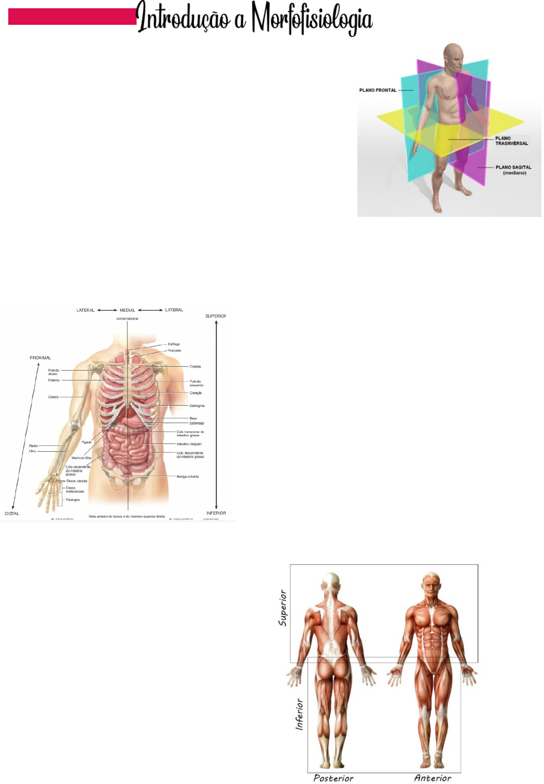 · INTRODUÇÃO À MORFOFISIOLOGIA Termos direcionais: · Superior e inferior · Anterior e posterior (anterior- frente/ posterior- trás) · Proximal- próximo e distal- distante. (duas estruturas corporais sendo comparadas qual delas é mais perto ou distante da área central do corpo) · Lateral, media e intermediário (medial para o meio, centro, lateral para fora, intermediário é o que está entre o lateral e o medial) · Profundo e superficial (costelas e pulmão) · Ipsilateral e contralateral (ipsilaterais- estruturas do mesmo lado/ contralateral- órgãos de lados oposto) · TERMINOLOGIA ANATÔMICA BÁSICA: · POSICAÇÃO ANATÓMICA: · Decúbito dorsal: costa em contato com superfície · Decúbito ventral: ventre em contato com a superfície · PLANO E SECÇÕES CORPORAIS: · O plano sagital é um plano paralelo à linha sagital. Divide o corpo nas porções esquerda e direita. · O plano frontal ou coronal divide o corpo nas porções anterior (frente) e posterior (costas). · O plano transversal divide o corpo nas porções cranial (superior) e caudal (inferior) · PLANO E SECÇÕES CORPORAIS: Paramediano: é paralelo ao mediano, ao lado dele Obliquo: não é um plano reto · CAVIDADES CORPORAIS: Nosso corpo possui cavidades onde ficam “guardados” os órgãos. Elas servem para isolar, proteger e dar sustentação para os órgãos internos. As cavidades do corpo são: • Cavidade dorsal – se encontra na região posterior corporal e é subdividida em cavidade do crânio (guarda o encéfalo) e cavidade vertebral (abriga medula espinhal). • Cavidade ventral – está localizada anteriormente ao tronco e se divide em cavidade torácica e abdominopélvica. • A cavidade torácica - se subdivide em duas cavidades pleurais (cada uma abriga um pulmão) e mediastino (contém coração). • A cavidade abdominopélvica - se subdivide em cavidade abdominal (aloja baço, fígado, vesícula biliar, pâncreas, estômago e intestinos) e cavidade pélvica (composta pela bexiga e pelos órgãos do sistema genital). • Outras cavidades – oral (boca), nasal (nariz), orbitais (olhos), auriculares (orelhas), sinoviais (encontradas em articulações móveis). · QUADRANTES ABDOMINAIS: · Região Abdominopélvica superior: - No nível da nona costela - Região hipocondríaca direita - Região epigástrica - região hipocondríaca esquerda · Região Abdominopelvica Media - Entre as nonas costelas e os ossos do quadril - Região Lateral direita - Região umbilical - Região lateral esquerda