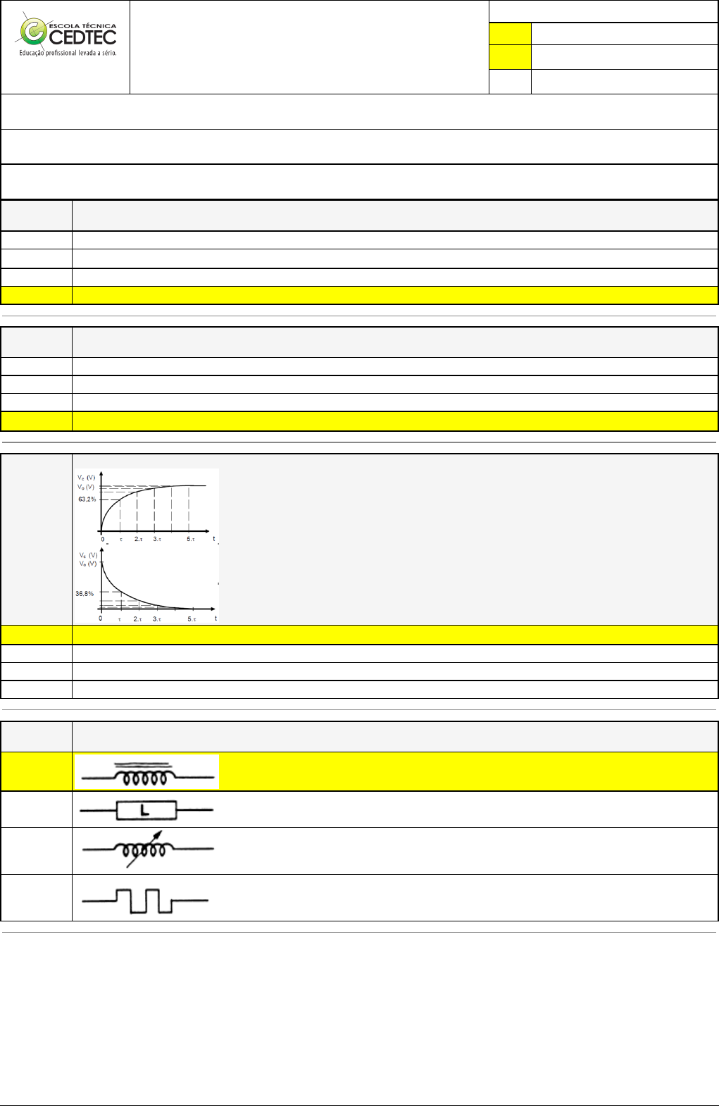 Pincel Atômico - 06/10/2021 19:39:47 1/1 LUCIO DE ASSIS MARTINS Exercício Caminho do Conhecimento - Etapa 13 (948) Atividade finalizada em 18/09/2021 08:37:25 (tentativa: 1) LEGENDA Resposta correta na questão # Resposta correta - Questão Anulada X Resposta selecionada pelo Aluno Disciplina: ELETRÔNICA [capítulos - 103] - Avaliação com 4 questões, com o peso total de 3,25 pontos Turma: Curso Técnico: Eletrotécnica - Grupo: EAD - FEVEREIRO/21 - EAD ELE [21241] Aluno(a): 91196423 - LUCIO DE ASSIS MARTINS - Respondeu 3 questões corretas, obtendo um total de 2,44 pontos como nota Questão 001 Os capacitores eletrolíticos podem funcionar: Em alta frequência X Com corrente contínua e com corrente alternada Só com corrente alternada Só com corrente contínua Questão 002 Os capacitores cerâmicos e de mica são adequados para circuitos: A baixa tensão A alta potência A alta intensidade de corrente X A alta frequência Questão 003 Os gráficos a seguir demonstram as operações no capacitor descritas como: X Carga e Descarga Corrente de sobrecarga e de Curto Circuito Efeito Joule Carregamento de bateria interna Questão 004 O símbolo gráfico de indutância com núcleo magnético é: X