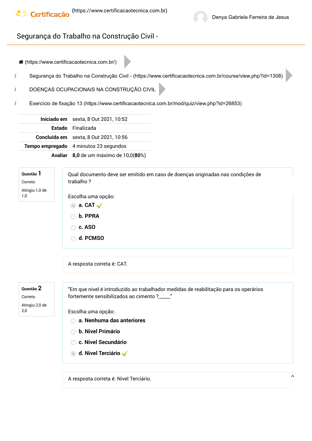 (https://www.certificacaotecnica.com.br) Denya Gabriela Ferreira de Jesus Segurança do Trabalho na Construção Civil - Questão 1 Correto Atingiu 1,0 de 1,0 Questão 2 Correto Atingiu 2,0 de 2,0 / / / Iniciado em sexta, 8 Out 2021, 10:52 Estado Finalizada Concluída em sexta, 8 Out 2021, 10:56 Tempo empregado 4 minutos 23 segundos Avaliar 8,0 de um máximo de 10,0(80%) Qual documento deve ser emitido em caso de doenças originadas nas condições de trabalho ? Escolha uma opção: a. CAT b. PPRA c. ASO d. PCMSO A resposta correta é: CAT. "Em que nivel é introduzido ao trabalhador medidas de reabilitação para os operários fortemente sensibilizados ao cimento ?_____" Escolha uma opção: a. Nenhuma das anteriores b. Nivel Primário c. Nivel Secundário d. Nivel Terciário A resposta correta é: Nivel Terciário. (https://www.certificacaotecnica.com.br/) Segurança do Trabalho na Construção Civil - (https://www.certificacaotecnica.com.br/course/view.php?id=1308) DOENÇAS OCUPACIONAIS NA CONSTRUÇÃO CIVIL Exercício de fixação 13 (https://www.certificacaotecnica.com.br/mod/quiz/view.php?id=26853) https://www.certificacaotecnica.com.br/ https://www.certificacaotecnica.com.br/ https://www.certificacaotecnica.com.br/course/view.php?id=1308 https://www.certificacaotecnica.com.br/mod/quiz/view.php?id=26853 Questão 3 Incorreto Atingiu 0,0 de 1,0 Questão 4 Incorreto Atingiu 0,0 de 1,0 Questão 5 Correto Atingiu 1,0 de 1,0 "Nivel Terciário _____" Escolha uma ou mais: a. Em que nivel é introduzido ao trabalhador medidas de reabilitação para os operários fortemente sensibilizados ao cimento ? b. Nenhuma das anteriores c. Nivel Primário "Do ponto de vista técnico o material Cimento é um material insalubre ?_____" Escolha uma ou mais: a. Verdadeiro b. Falso A resposta correta é: Verdadeiro. "Os critérios de seleção de respiradores de uso rotineiro e de acordo com os tipos de contaminantes ambientais contra os quais prover proteção, podemos estabelecer que o tipo de filtro para situações Particulados altamente tóxicos (LT<0,05 mg/m3) e/ou de toxidez desconhecida. Devera ser a mascara de qual tipo ? _____" Escolha uma opção: a. PFF3/ P3 b. PFF1/ P1 c. Conjunto Autonomo d. PFF2/ P2 A resposta correta é: PFF3/ P3. Questão 6 Correto Atingiu 2,0 de 2,0 Questão 7 Correto Atingiu 2,0 de 2,0 "De acordo com Ali o cimento é muito irritante para a pele em virtude de ser abrasivo, higroscópico e altamente alcalino. Sua alcalinidade muitas vezes atinge quanto em seu PH ?_____" Escolha uma opção: a. pH próximo a 14 b. pH próximo a 4 c. pH próximo a 10 d. pH próximo a 8 A resposta correta é: pH próximo a 14. "Os critérios de seleção de respiradores de uso rotineiro e de acordo com os tipos de contaminantes ambientais contra os quais prover proteção, podemos estabelecer que o tipo de filtro para situações de Fumos (aerossóis termicamente gerados) e/ou Agentes Biológicos. Devera ser a mascara de qual tipo ? _____" Escolha uma ou mais: a. Conjunto Autonomo b. PFF2/ P2 c. PFF3/ P3 d. PFF1/ P1 A resposta correta é: PFF2/ P2.