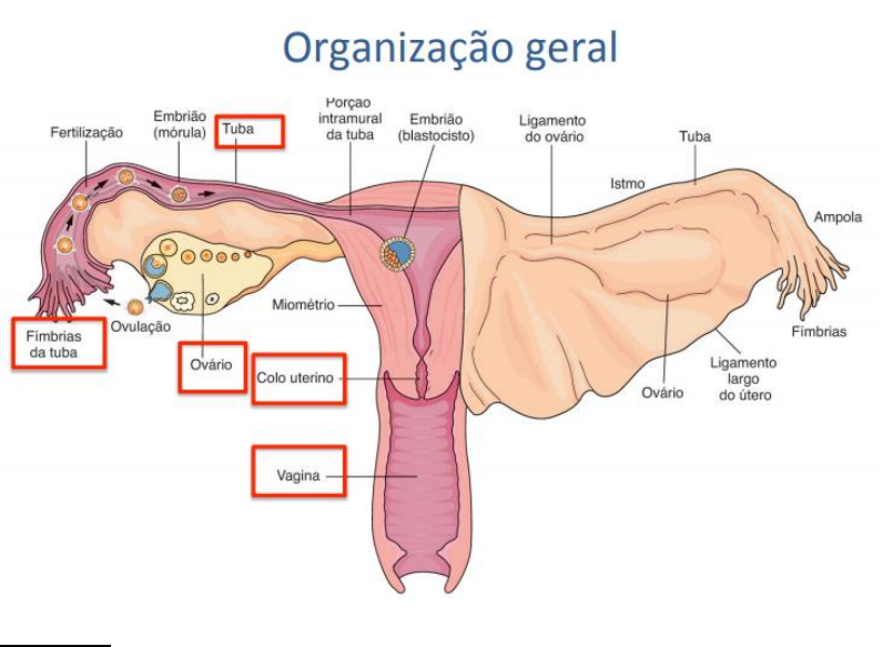 Daniel V. Rordrigues-M33 Anatomia e histologia do sistema reprodutor feminino Antes de adentrarmos no assunto de histologia, é importante relembrar as estruturas que fazem parte desse sistema reprodutor. As estruturas são, Canal vaginal; Útero (fundo-corpo-colo); Tubas uterinas; Ovários. Histologia Ovário É recoberto por um epitélio germinativo (tecido epitelial simples pavimentoso ou cúbico), ligado ao peritônio, suspenso pelo ligamento do ovário, com o formado de uma amêndoa. Logo abaixo do epitélio, se tem a túnica albugínea (que é um tecido conjuntivo denso) possuindo mais fibras que células, quais são as fibras colágenas. O ovário pode ser dividido em 2 regiões: Região cortical, onde se encontra o folículo ovariano + estroma – tec. Conjuntivo celularizado (fibroblasto-hormonais; células estromais; intersticiais) Conceituando que folículo ovariano é um ovócito coberto por células foliculares/granulosas. A outra região do ovário, é a Região medular, ao qual observamos os vasos + tecido conjuntivo frouxo. Caracterização dos folículos ovarianos a) Folículo primordial: ovócito primário + epitélio simples pavimentoso b) Folículo primário unilaminar: ovócito primário + epitélio simples cubico + zona pelúcida (camada de glicoproteínas), ao qual acoberta o ovócito. Daniel V. Rordrigues-M33 c) Folículo primário multilaminar ou pré-antral: ovócito primário + epitélio estratificado cubico + zona pelúcida + teca interna + teca externa d) Folículo secundário ou antral: presença de ovócito primário + zona pelúcida+ teca interna + teca externa + cavidade antral, preenchido pelo líquido antral. Dependência de FSH e) Folículo de Graaf ou dominante: ovócito secundário + amplo antro + cumulo oophorus. Ocorreu o termino da meiose II; o FSH estimula a maduração do folículo. O cumulo oophorus que dará origem a corona radiada. O hormônio FSH atua no folículo, estimulando sua maduração, principalmente o folículo secundário para o folículo de Graaf. Apenas 1 folículo chegará a ser folículo dominante, sendo os outros, folículos atrésicos. f) Folículo atrésico: é o folículo que começou o desenvolvimento, mas não respondeu tão bem ao FSH, estagnando sua evolução, não havendo maduração, e assim, entrando em atresia, ou seja, sofreu um retrocesso. Será representado como um folículo que possui o ovócito primário, mas no antro, possui fibroblasto e colágeno e não liquido antral. O fibroblasto possui reticulo rugoso e complexo de golgi. É degenerado por fagocitose (macrófagos). . Quando chega no folículo de Graaf, ocorre um pico de LH, que promove uma ruptura no folículo dominante, liberando o ovócito secundário estagnando na metáfase II, coberto pela zona pelúcida e pela corona radiada. Esse folículo remanescente é invadido por tecido conjuntivo propriamente dito na cavidade antral, tornando-se corpo lúteo, pelo processo de luteinização, estimulando o hormônio LH. O corpo lúteo possui 2 células: CLT (células lúteas tecais), que é a diferenciação das células da teca, por ação do LH; CLG (células lúteas granulosas), diferenciação das células foliculares. Essas células são responsáveis pela produção de hormônios ovarianos, como o estrogênio e a progesterona. Lembrando que quem produz os hormônios antes da ovulação, é o folículo ovariano. . O estrogênio e principalmente a progesterona, causam feedback negativo no LH, sendo assim, haverá degradação do corpo lúteo, ocorrendo um processo fibrótico no corpo lúteo, havendo cicatrização, se tornando um corpo albicans ou branco, composto por tecido conjuntivo propriamente dito denso (tecido fibrótico). Com o fim do corpo lúteo, ocorre redução na produção de progesterona, por consequência, fim da manutenção do endométrio, levando a descamação, o que seria a menstruação em si. Porém, havendo a fecundação, irá ser produzido o hormônio HCG, inicialmente pelo blastócito, este que estimula o corpo lúteo a continuar a produção de progesterona e assim, manutenção do endométrio. Tuba uterina A mulher possui duas tubas uterinas. Anatomicamente, a tuba uterina pode ser dividida em intramural, istmo, ampola e infundíbulo. O infundíbulo e ampola são pregueados. Além de regiões associadas, como o ligamento útero-ovariano. Lembrando que ao Daniel V. Rordrigues-M33 ocorrer a liberação do ovócito secundário estagnado na metáfase II, será transportado por ação das fimbrias para a tuba uterina, ocorrendo a fecundação geralmente na região da ampola. Histologicamente a tuba uterina é dividida em mucosa, muscular e serosa (de interno para externo) . A mucosa é composta por epitélio simples colunar com células secretora não ciliadas e uma lâmina basal composta por tecido conjuntivo frouxo (fibroblasto, mastócito, linfócitos). A mucosa apresenta pregas que são dobramentos/invaginações. . A muscular é liso, é composta por circular interna e longitudinal externa (mal definidas) . A serosa é formada por mesotélio (tecido epitelial simples pavimentoso atrelado ao peritônio) e tecido conjuntivo frouxo a fibroelástico + vasos sanguíneos + fibras nervosas Útero O útero é formado por três camadas. . Endométrio: camada muscular mais interna, onde o embrião irá se implantar. O endométrio é composto por uma área mucosa, sendo um epitélio simples colunar com células ciliadas e secretoras. Possuindo uma lâmina basal composto por tecido conjuntivo frouxo + celularizado (fibroblasto, leucócitos, fibras, MO) + vasos sanguíneos (artérias retas e espirais). O endométrio é dividido em estrato funcional e estrato basal. A camada basal geralmente, se mantem intacta durante o período menstrual. Por outro lado, o estrato funcional irá crescer e descamar uma vez por mês. O estrato basal é composto por tecido conjuntivo + porção inicial das glândulas uterinas + artéria reta. E o estrato func