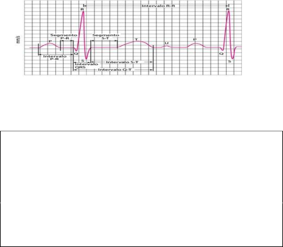 INTRODUÇÃO AO ELETROCARDIOGRAMA (ECG) Por: Júlia Micheli Perez Velocidade que corre o eletro: 25mm/seg, logo 25x60=1500mm em 1 min. 1 Quadradinho = 1 mm = 0,04 seg ou 40 ms. Passo a passo: 1° FC 2° ONDA P 3° INTERVALO PR 4° QRS ➢ - ONDA Q PATOLÓGICA? ➢ - BLOQUEIO DE RAMO ➢ - SOBRECARGA VENTRICULAR 5° CALCULAR EIXO FREQUÊNCIA CARDÍACA 300/n° de quadradrões OU 1500/5,10,15... (Cada quadradrão = 5). Frequência cardíaca normal: Entre 60 a 100 bpm. ONDA P Sinusal (Onda P positiva em DI,DII,aVF) Sobrecarga atrial – “SAD” É ALTO E MAGRO. Onda P normal: Largura < 0,12s/120ms e Altura < 2,5mm. SAD: Largura > 0,12s/120ms e Altura > 2,5mm. INTERVALO PR (0,12s a 0,2s) Todas as ondas P antecedem um co Todas as ondas P antecedem um complexo QRS. O que existe é um atraso na condução, ou seja, o intervalo PR é MAIOR que 200ms. O intervalo PR alarga progressivamente pra então falhar e não produzir QRS. Ou seja, o intervalo PR não é constante! Quando não produz QRS o ciclo se reinicia. Pode-se analisar em qualquer derivação, entretanto na DII é a mais fácil por conta da onda P ser maior. Os intervalos PR são alargados, porém são fixos! É como se você tivesse um PR constante até chegar um momento que a onda P é bloqueada e não produz QRS - podem existir diversas ondas P sequenciais sem QRS. PRECISA DE MARCAPASSO! Um ritmo totalmente anárquico! O átrio bate em uma frequência e o ventrículo em outra. Melhor forma de ver é pedindo um DII longo, pois assim daria pra ver QRS em cima de onda P e um ritmo anárquico por ex. Q PATOLÓGICA Patológica quando maior que 1 quadrado de duração e/ou do que 1/3 da altura do QRS. Devemos analisar a onda Q sempre em 2 derivações contíguas para atestar que é patológica. BLOQUEIO DE RAMO Ritmo sinusal com QRS alargado (>1,2s ou 3 quadradinhos) na derivação V1. Direito se: QRS pra cima E Esquerdo se: QRS para baixo. - Lembrar da relação c/ IAM. SOBRECARGA VENTRICULAR SOBRECARGA DE VENTRÍCULO DIREITO: Se o R > 5mm (5 Quadradinhos) em V1. SOBRECARGA DE VENTRÍCULO ESQUERDO: Socolow-Lion: Soma da onda S no V1 e onda R em V5 ou V6 dando >35mm. (Se (–) não exclui sobrecarga, se (+) confirma SVE). Cornel: Soma da onda R em aVL + Onda S em V3 dando > 2mm em mulheres ou > 28 mm em homens. Eixo NEGATIVO > 30° ------------> BDAS (Bloqueio divisional ântero-superior) PAREDES aVL, DI ---- Parede Lateral alta DIII, aVF, DII – Parede inferior V1-V4 – Parede Anterior V5-V6 – Parede Lateral baixa V3r-V4r – Ventrículo direito EIXO CARDÍACO