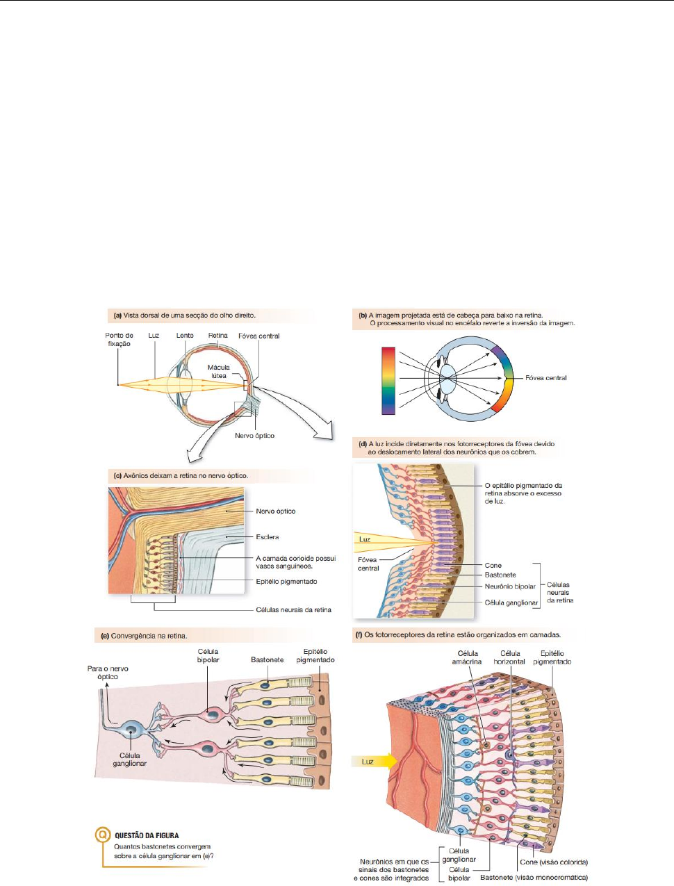 FISIOLOGIA DA VISÃO A retina é a estrutura responsável por receber e converter os estímulos luminosos em estímulos elétricos/nervosos (transdução), através dos fotorreceptores. Os estímulos nervosos percorrem o nervo óptico (II NC). O nervo óptico apresenta várias fibras que, em um determinado ponto, se dividem em fibras homolaterais e heterolaterais. O cruzamento entre as fibras heterolaterais é denominado quiasma óptico. A partir dele, as fibras são chamadas de trato óptico. Os receptores visuais se encontram na retina, estrutura formada por um neuroepitélio que reveste internamente o olho. A retina é formada por uma camada pigmentar externa e uma camada nervosa interna. Alinhada com a ppila na parte posterior da retina, existe a mácula lútea, onde se encontra a fóvea cexntral. A camada nervosa da retina é composta por três principais neurônios da via óptica. Do externo para o interno se tem: a) Camada de células fotossensíveis; b) Camada de células bipolares; c) Camada de células ganglionares. Os axônios das células ganglionares, inicialmente amielínicos, convergem para a papila óptica (não existem fotorreceptores na papila óptica, é chamada de ponto cego), atravessam as camadas o olho, se tornam mielínicos e então formam o nervo óptico. Os prolongamentos das células fotossensíveis são chamados de cones e bastonetes. São esses os receptores da visão, que fazem a fototransdução do estímulo luminoso em estímulo elétrico/nervoso. Os dois nervos ópticos convergem para a formação do quiasma óptico, onde ocorre uma decussação parcial – as fibras vindas das retinas nasais decussam e as fibras vindas das retinas temporais não. A partir do quiasma, partem os dois tratos ópticos que terminam nos corpos geniculados laterais. Existem 4 tipos de fibras na via óptica: a) Fibras retinogeniculadas: são as principais. São as fibras responsáveis diretamente pela visão. Partem da retina e terminam no corpo geniculado lateral, onde fazem sinapse com o quarto neurônio da via óptica. b) Fibras retino-hipotalâmicas: saem do quiasma e vão até o núcleo supra-quiasmático do hipotálamo. São responsáveis pelo ritmo circadiano. c) Fibras retinotectais: partem da retina e vão até o colículo superior e se relacionam aos reflexos dos olhos (como piscar). d) Fibras retino pré-tectais: chegam na parte mais anterior do colículo superior e estão relacionadas aos reflexos pupilares. Resumo Trajeto da via óptica: nervo óptico → quiasma óptico → trato óptico → corpo geniculado lateral → córtex visual (sulco calcarino do lobo occipita)l.