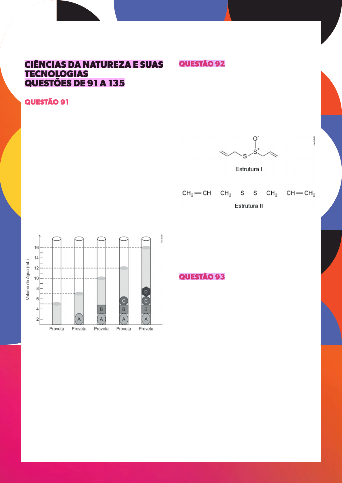 Ciências da Natureza e suas Tecnologias CIÊNCIAS DA NATUREZA E SUAS TECNOLOGIAS QUESTÕES DE 91 A 135 QUESTÃO 91 As moedas despertam o interesse de colecionadores, numismatas e investidores há bastante tempo. Uma moeda de 100% cobre, circulante no período do Bra- sil Colônia, pode ser bastante valiosa. O elevado valor gera a necessidade de realização de testes que validem a procedência da moeda, bem como a veracidade de sua composição. Sabendo que a densidade do cobre metálico é próxima de 39 g cm ,− um investidor nego- cia a aquisição de um lote de quatro moedas A, B, C e D fabricadas supostamente de 100% cobre e massas 26 g, 27 g,10 g e 36 g, respectivamente. Com o ob- jetivo de testar a densidade das moedas, foi realizado um procedimento em que elas foram sequencialmen- te inseridas em uma proveta contendo 5 mL de água, conforme esquematizado. Com base nos dados obtidos, o investidor adquiriu as moedas A e B. A e C. B e C. B e D. C e D. QUESTÃO 92 O odor que permanece nas mãos após o contato com alho pode ser eliminado pela utilização de um “sabo- nete de aço inoxidável”, constituído de aço inox (74%) cromo e níquel. A principal vantagem desse “sabonete” é que ele não se desgasta com o uso. Considere que a principal substância responsável pelo odor de alho é a alicina (estrutura I) e que, para que o odor seja elimina- do, ela seja transformada na estrutura II. Na conversão de I em II, o “sabonete” atuará como um ácido. redutor. eletrólito. tensoativo. catalisador. QUESTÃO 93 Com a chegada do novo coronavírus (Sars-cov-2, que provoca a doença batizada de Covid-19) ao Brasil, foi fundamental reforçar os hábitos de higiene e utilizar o álcool 70, isto é, sistema que é composto de 70% de álcool etílico (etanol) e 30% de água. De acordo com o Conselho Federal de Química (CFQ), essa é a concen- tração ideal para combater micro-organismos como bactérias, vírus e fungos. Fonte: http://cfq.org.br/noticia/alcool-legal A quantidade aproximada de água destilada que deve ser adicionada para preparar 400ml de uma solução de álcool etílico com concentração 96% (v/v) visando obter uma solução de álcool etílico com concentração 70% (v/v) é? 26 mL 548 mL 291 mL 160 mL 148 mL Reviewer Highlight Ciências da Natureza e suas Tecnologias QUESTÃO 94 O carvão é um combustível que tem várias substâncias em sua composição. Em razão disso, quando é repre- sentada sua queima com o oxigênio (massa molar 16 g mol -1) simplifica-se elaborando apenas a combus- tão completa do carbono (massa molar 12 g mol -1) De acordo com o conteúdo médio de carbono fixo, o car- vão é classificado em vários tipos, com destaque para o antracito, que apresenta, em média, 90% de carbo- no. Esse elevado conteúdo favorece energeticamente a combustão, no entanto, libera maior quantidade de gás que provoca efeito estufa. Supondo a queima completa de 100 g de carvão antra- cito, a massa de gás liberada na atmosfera é, em gra- ma, mais próxima de 90,0. 210,0. 233,3. 330,0. 366,7. QUESTÃO 95 “Infelizmente, a poluição por mercúrio na Amazônia é ignorada apesar das crescentes evidências dos pe- rigos que representa para as pessoas e a vida selvagem ao longo do sistema fluvial. (...) Além disso, as vítimas mais vulneráveis são os povos indígenas e as comuni- dades locais, além de milhares de espécies únicas des- se bioma.” Disponível em: <https://www.wwf.org.br/informacoes/noticias_meio_ ambiente_e_natureza/?uNewsID=68585>. Acesso em: 1 out. 2020. Adaptado. A principal fonte de contaminação por mercúrio na Amazônia é a mineração de ouro artesanal de peque- na escala extraído na região. Nessa atividade, o mercúrio é usado na purificação do ouro por meio do processo físico de separação deno- minado peneiração centrifugação decantação levigação destilação QUESTÃO 96 Esta questão relaciona-se com o texto a seguir, os gráfi- cos I e II e os conhecimentos já adquiridos. Em reações espontâneas, que necessitam de energia para sua realização, o nível de energia dos produtos fi- nais é mais baixo do que o nível de energia do substra- to inicial. Nas reações que se passam nos organismos vivos, tanto animais como vegetais, existem diferentes fatores, tanto físicos como químicos, que interferem nos processos metabólicos. Os gráficos I e II mostram a variação dos níveis de ener- gia de ativação em reações que se passam dentro e fora dos organismos vivos. Qual a afirmativa certa? Não existe qualquer fator que possa interferir na variação do nível de energia de ativação e na ob- tenção do produto final. A energia de ativação requerida para obter o produ- to final em I depende da redução da temperatura. Para reações em organismos vivos, interessa so- mente o produto final e, se existir um fator qual- quer alterando os níveis de energia, ele deve ser desconhecido. O comportamento mostrado no gráfico I deve ser próprio de uma reação metabólica porque, para reações nos seres vivos, a energia de ativação deve ser maior. A redução da energia de ativação para a obtenção do produto final observada em II depende da pre- sença de uma enzima. QUESTÃO 97 O colesterol tem sido considerado um vilão nos últi- mos tempos, uma vez que as doenças cardiovascula- res estão associadas a altos níveis desse composto no sangue. No entanto, o colesterol desempenha impor- tantes papéis no organismo. Analise os itens a seguir: Ciências da Natureza e suas Tecnologias I. O colesterol é importante para a integridade da membrana celular. II. O colesterol participa da síntese dos hormônios esteroides. III. O colesterol participa da síntese dos sais biliares. Da análise dos itens, é correto afirmar que somente I é verdadeiro. somente II é verdadeiro. somente III é verdadeiro. somente I e II são verdadeiros. I, II e III são verdadeiros. QUESTÃO 98 Leia as informações 