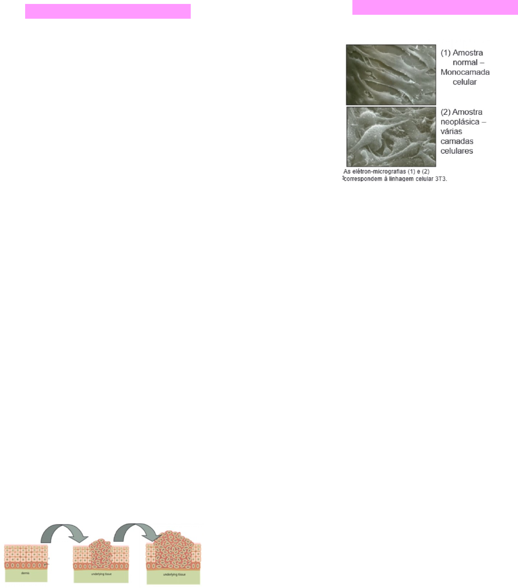 Patologia Neoplasias · Sempre de base genética, ou seja, presente nos genes, no Dna de uma célula, não necessariamente como uma mutação ou uma alteração nos nucleotídeos, mas como uma alteração que provém de um distúrbio genético presente nos genes dessa célula alterada geneticamente que é uma célula tumoral · Muitas vezes a célula pode sofrer essas mutações ao longo da vida e acumular as mutações necessárias para se tornar uma célula tumoral · Fatal, se não for tratado · Diagnóstico precoce e tratamento imediato · Objeto das pesquisas(prevenção) · Conceito: tumores são massas de tecidos cujo crescimento é praticamente autônomo e cuja taxa excede de replicação excede os tecidos normais Não respeita os sinais de parada de replicação = células acumuladas *Uma célula em divisão normal tem os sinais de replicação fazendo com que tenhamos uma célula recebendo o sinal mitótico se desenvolvendo ou se dividindo em duas novas células, que recebe mais um sinal mitótico e faz mais duas. E no momento, previamente a divisão uma célula apresenta erros antas que ela seja enviada para uma nova replicação, ela tem seu DNA checado e a partir dai ela é encaminhada pra via apoptótica. **Nos tumores células com erros mutacionais, ela é enviada para um caminho de divisão celular(caminho mitótico), ou seja, ela devia estar sendo suprimida e ela continua com erros mutacionais se dividindo e fazendo com que tenhamos um acumulo de células com DNA alterado. · Começa a manifestar alterações teciduais visíveis *perda da morfologia-pleomorfismo (características que dá para checar em microscopia) · Nem todo tecido cuja taxa de crescimento excede a dos tecidos normais é um tumor, muto menos um câncer *hiperplasia – nos distúrbios adaptativos, por estímulos hormonais ou fatores de crescimento tróficos(ganho de função) por exemplo a gente pode ter a célula amontoando em numero . **displasia(LEVE) -tem alteração no número de células quanto na morfologia (células com diferente do hiperplásico)perde sua arquitetura tecidual básica se empilha em quantidades maiores de célula ***(in situ) No momento que se tem uma displasia severa pode haverá herança de mutações de alterações de expressão em proteínas que fazem com que essa célula se transforme em células tumorais malignas . restrito a membrana basal ***invasor; células tem capacidade de se desprender de onde for geradas invadir cavidades,vasos sanguíneos e vasos linfáticos e se disseminar pra outros locais do corpo; alteração de varias proteínas e é invasiva Categorias tumorais (comportamento) 1. Tumor benigno: massas limitadas que não sofrem metástases, mas podem causar compreensão e aumento excessivo de produtos e função do órgão 2. Tumor maligno ou câncer: são capazes de invadir os tecidos vizinhos ou se espalhar para sítios distantes, através de metástases *não é todo tumor que termina com oma que é um tumor benigno Tumor benigno · Adenoma: tumores epiteliais benignos que surgem em glândulas ou que apresentam padrão glandular (mama, sudorípara, parótidas, nas porções glandulares do fígado, do pâncreas em todo tipo de tecido que tiver tecido glandular. · Papilomas: tumores epiteliais que formam projeções digitiformes.(HPV,verrugas plantares · Pólipos: tumor que se projeta a partir da mucosa para a luz de uma visceral oca (no trato gastro intestinal como no intestino no estomago) - muitas vezes predizendo a presença de tumores malignos. Tumores mailignos *para nomenclatura de tumor maligno tem que se entender que além da questão comportamental, tem que se entender a origem; os tecidos podem ser derivados de células tronco (pra tumores sólidos são classificados em tecido epitelial e mesenquimal) 1. Tecidos derivados a célula tronco epitelial da origem aos tecidos de · revestimentos (epitélio externo do nosso corpo, mucosas) - carcinoma; · glandular (da origem ao tecido glandular, glândulas) - adenocarcimos 2. Tecidos derivados da célula tronco-mesenquimal (Sarcomas)-osso, musculo, tecido adiposo, tendões (de sustentação) 3. Tumores não solido(sem tecido): derivados da célula tronco hematopoiética (da origem as células sanguíneas), medula óssea. E quando os precursores linfoides são acometidos vamos ter origem aos linfomas e quando os precursores mieloides forem acometidos vamos ter origem leucemias Carcinoma in situ x invasor · Os dois são malignos · Carcinoma in situ (no local): tumor que não ultrapassou a membrana basal dos epitélios · Carcinoma invasor ou infiltrativo: quando o tumor ultrapassa a membrana basal. Associado ao potencial metastático [ Diferenças tumor benigno e maligno · Baseado na avaliação da morfologia + evolução clinica · Diferenciação e anaplasia no tumor benigno as células se assemelham com as normais já no maligno temos células menos diferenciadas (processo de diferenciação completo), mas podem ser desde bem diferenciados are pouco diferenciados (anaplasia: falta de diferenciação celular) *pode se ter os tumores malignos bem diferenciados, moderados, bem diferenciados- quanto menor for a diferenciação de um tumor (anaplasia) mais rápido é sua evolução e replicação- mais agressivo · Taxa de crescimento: em geral os tumores malignos crescem mais que os benignos · Invasão local: nos benignos é restrito por capsula, com bordas bem limitas; já os malignos infiltram nos tecidos normais circundantes · Metástases Histologicamente todos tumores apresentam: Células neoplásicas + estroma de sustentação “normal” tecido conjuntivo colagenizado e vasta rede de vasos sanguíneos Dependentes da angiogênese (capilarização), aumento na formação de vasos sanguíneos Cancer (= tumor maligno) · Sofre metástase (o que é?) · Invasão dos vasos linfáticos, dos vasos sanguíneos e das cavidades corporais pelo tumor · Tumor primário · Tumor secundário (metástases)