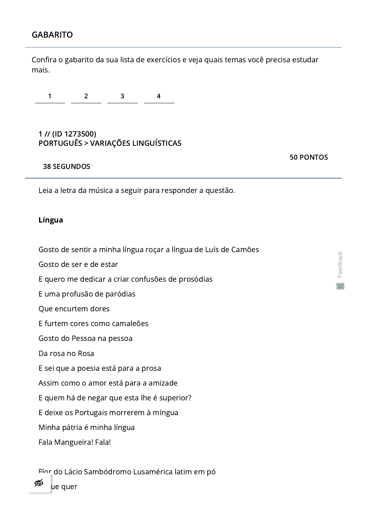 10/10/2021 19:17 Correção https://www.desafionotamaxima.com.br/mock_exams/95403374/correct_exam?locale=pt-BR 12/23 GABARITO Con�ra o gabarito da sua lista de exercícios e veja quais temas você precisa estudar mais. 1 2 3 4 1 // (ID 1273500) PORTUGUÊS > VARIAÇÕES LINGUÍSTICAS 38 SEGUNDOS 50 PONTOS Leia a letra da música a seguir para responder a questão. Língua Gosto de sentir a minha língua roçar a língua de Luís de Camões Gosto de ser e de estar E quero me dedicar a criar confusões de prosódias E uma profusão de paródias Que encurtem dores E furtem cores como camaleões Gosto do Pessoa na pessoa Da rosa no Rosa E sei que a poesia está para a prosa Assim como o amor está para a amizade E quem há de negar que esta lhe é superior? E deixe os Portugais morrerem à míngua Minha pátria é minha língua Fala Mangueira! Fala! Flor do Lácio Sambódromo Lusamérica latim em pó O que quer Fe ed ba ck 10/10/2021 19:17 Correção https://www.desafionotamaxima.com.br/mock_exams/95403374/correct_exam?locale=pt-BR 13/23 O que pode esta língua? Vamos atentar para a sintaxe dos paulistas E o falso inglês relax dos sur�stas Sejamos imperialistas! Cadê? Sejamos imperialistas! Vamos na velô da dicção choo-choo de Carmem Miranda E que o Chico Buarque de Holanda nos resgate E (xeque-mate) explique-nos Luanda Ouçamos com atenção os deles e os delas da TV Globo Sejamos o lobo do lobo do homem Lobo do lobo do lobo do homem Adoro nomes Nomes em ã De coisas como rã e ímã Ímã ímã ímã ímã ímã ímã ímã ímã Nomes de nomes Como Scarlet, Moon, de Chevalier, Glauco Mattoso e Arrigo Barnabé e Maria da Fé Flor do Lácio Sambódromo Lusamérica latim em pó O que quer O que pode esta língua? Se você tem uma idéia incrível é melhor fazer uma canção Está provado que só é possível �losofar em alemão Blitz quer dizer corisco Hollywood quer dizer Azevedo E o Recôncavo, e o Recôncavo, e o Recôncavo meu medo A língua é minha pátria E eu não tenho pátria, tenho mátria E quero frátria Poesia concreta, prosa caótica Ótica futura Fe ed ba ck 10/10/2021 19:17 Correção https://www.desafionotamaxima.com.br/mock_exams/95403374/correct_exam?locale=pt-BR 14/23 Samba-rap, chic-left com banana (Será que ele está no Pão de Açúcar? Tá craude brô Você e tu Lhe amo Qué queu te faço, nego? Bote ligeiro! Ma'de brinquinho, Ricardo!? Teu tio vai �car desesperado! Ó Tavinho, põe camisola pra dentro, assim mais pareces um espantalho! I like to spend some time in Mozambique Arigatô, arigatô!) Nós canto-falamos como quem inveja negros Que sofrem horrores no Gueto do Harlem Livros, discos, vídeos à mancheia E deixa que digam, que pensem, que falem VELOSO, C. “Língua”. In: Velô. Rio de Janeiro: Philips, 1984. Ao realizarmos a leitura da letra da canção de Caetano Veloso, “Língua” pode-se concluir que o autor elabora um verdadeiro tratado da língua portuguesa. Se levarmos em conta os dois fragmentos destacados da canção, podemos a�rmar entre outras coisas que a sintaxe dos paulistas relaciona-se exclusivamente com o sotaque da região de Sorocaba e o falso inglês dos sur�stas inclui termos como free surfer e storm a sintaxe dos paulistas relaciona-se exclusivamente com o sotaque da região de Sorocaba e o falso inglês dos sur�stas inclui termos como gap e business a sintaxe dos paulistas relaciona-se com o uso italianado que também está presente no Rio Grande do Sul e o falso inglês dos sur�stas inclui termos como brô e drop Fe ed ba ck 10/10/2021 19:17 Correção https://www.desafionotamaxima.com.br/mock_exams/95403374/correct_exam?locale=pt-BR 15/23 Enviar para revisão a sintaxe dos paulistas relaciona-se com o típico uso italianado da sintaxe entre paulistas da capital e o falso inglês dos sur�stas inclui termos como drop. A sintaxe dos paulistas relaciona-se com o uso italianado do pronome pessoal “me” e o falso inglês dos sur�stas inclui termos como gap e drop. Resolução da questão Veja abaixo o comentário da questão: Alternativa Correta: a sintaxe dos paulistas relaciona-se com o típico uso italianado da sintaxe entre paulistas da capital e o falso inglês dos sur�stas inclui termos como drop. A alternativa está correta, pois na canção se faz referência àquela sintaxe típica que é usada em regiões como o bairro da Mooca, na capital paulista, e por termos do inglês que fazem referência à atividade de surfar, como drop (pegar onda), entre outras. Comentário da sua resposta: Colocamos abaixo uma breve explicação sobre a alternativa que você marcou errada: Clique aqui para escrever porque a alternativa A é incorreta (se aplicável)... 2 // (ID 1273091) PORTUGUÊS > VARIAÇÕES LINGUÍSTICAS 33 SEGUNDOS 50 PONTOS Leia atentamente as informações para responder ao que se propõe em sequência: Texto I: Fe ed ba ck 10/10/2021 19:17 Correção https://www.desafionotamaxima.com.br/mock_exams/95403374/correct_exam?locale=pt-BR 16/23 Variação Regional (os chamados dialetos ou regionalismos) são variantes linguísticas ocorridas de acordo com a cultura de determinada região de um país. No Brasil, tem-se como exemplo recorrente a palavra ‘mandioca’, a qual, em certas regiões, é sinônimo de ‘macaxeira’; como também, ‘abóbora’, vocábulo mais utilizado no Sul e no Sudeste do país, mas empregado como ‘jerimum’ no Norte e no Nordeste para se referir ao legume. Nesse sentido, destaca-se também, o caso do dialeto caipira, com palavras especí�cas de cada região, não dicionarizadas, fruto da linguagem oral, utilizado por indivíduos que não tiveram oportunidade de receber educação formal e, em função dessa lacuna instrucional, não dominam a linguagem culta ou o�cial. Texto II: Um exemplo típico de Variação Linguística Regional bem se expressa no breve poema do modernista Oswald de Andrade, intitulado ‘Vício na fala’: Para dizerem milho, dizem mio Par