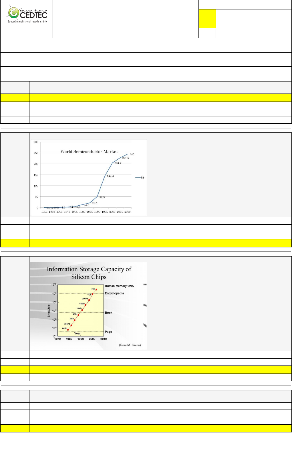 Pincel Atômico - 26/09/2021 23:11:19 1/1 MAURILHO BARBOSA DIAS Exercício Caminho do Conhecimento - Etapa 3 (940) Atividade finalizada em 18/09/2021 14:35:17 (tentativa: 1) LEGENDA Resposta correta na questão # Resposta correta - Questão Anulada X Resposta selecionada pelo Aluno Disciplina: ELETRÔNICA [capítulos - 101] - Avaliação com 4 questões, com o peso total de 3,25 pontos Turma: Curso Técnico: Eletrotécnica - Grupo: EAD - FEVEREIRO/21 - EAD ELE [21241] Aluno(a): 91193991 - MAURILHO BARBOSA DIAS - Respondeu 4 questões corretas, obtendo um total de 3,25 pontos como nota Questão 001 Os cientistas William Shockley, Walter Brattain e John Bardeen foram responsáveis pela criação do: X Transistor Resistor Capacitor Diodo Questão 002 Observando o gráfico do mercado dos semicondutores, pode-se observar que: Em 1955 não existia movimentação de dispositivos semicondutores. O mercado de semicondutores atual movimenta mais de 300 bilhões de dólares Os semicondutores foram descobertos em 1955 X O mercado de semicondutores aumentou exponencialmente a partir da década de 90 Questão 003 Observando o gráfico da capacidade de armazenamento dos chips, pode-se observar que: Em 2020 Os chips de silício terão a mesma capacidade do DNA humano Atualmente, o chips de silício possuem a mesma capacidade do DNA humano X A capacidade de armazenamento dos chips aumentou de forma linear nas últimas décadas A capacidade de armazenamento dos chips aumentou de forma exponencial nas últimas décadas Questão 004 De acordo com o que foi estudado, os circuitos integrados oferecem: Alto consumo de Potência Alto custo Baixa velocidade de operação X Várias funções em um único dispositivo medindo menos de 5 cm