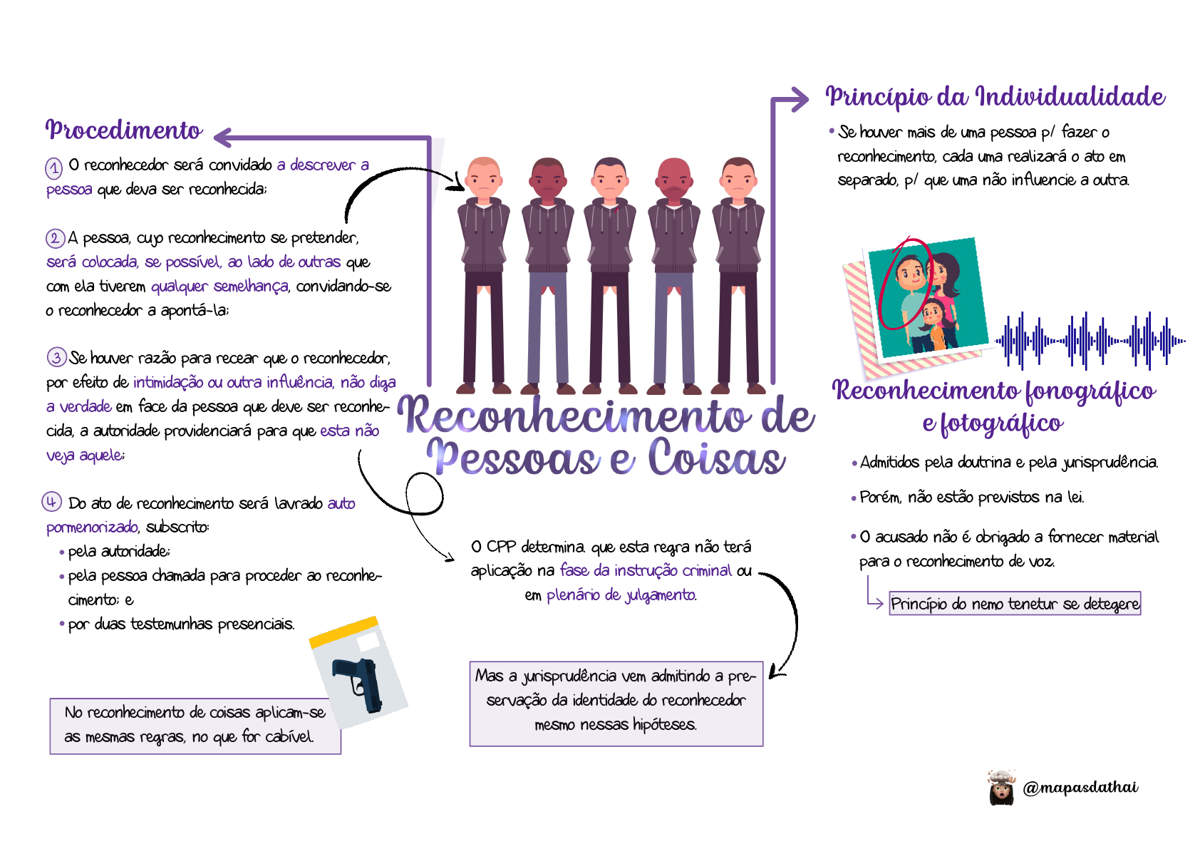 Se houver mais de uma pessoa p/ fazer o reconhecimento, cada uma realizará o ato em separado, p/ que uma não influencie a outra. Admitidos pela doutrina e pela jurisprudência. Porém, não estão previstos na lei. O acusado não é obrigado a fornecer material para o reconhecimento de voz. Princípio do nemo tenetur se detegere O reconhecedor será convidado a descrever a pessoa que deva ser reconhecida; A pessoa, cujo reconhecimento se pretender, será colocada, se possível, ao lado de outras que com ela tiverem qualquer semelhança, convidando-se o reconhecedor a apontá-la; Se houver razão para recear que o reconhecedor, por efeito de intimidação ou outra influência, não diga a verdade em face da pessoa que deve ser reconhe- cida, a autoridade providenciará para que esta não veja aquele; Do ato de reconhecimento será lavrado auto pormenorizado, subscrito: pela autoridade; pela pessoa chamada para proceder ao reconhe- cimento; e por duas testemunhas presenciais. O CPP determina. que esta regra não terá aplicação na fase da instrução criminal ou em plenário de julgamento. Mas a jurisprudência vem admitindo a pre- servação da identidade do reconhecedor mesmo nessas hipóteses. No reconhecimento de coisas aplicam-se as mesmas regras, no que for cabível. Procedimento Princípio da Individualidade Reconhecimento fonográfico e fotográfico 1 2 3 4 ] . ' o÷ . - 09701938402 - Camila Oliv