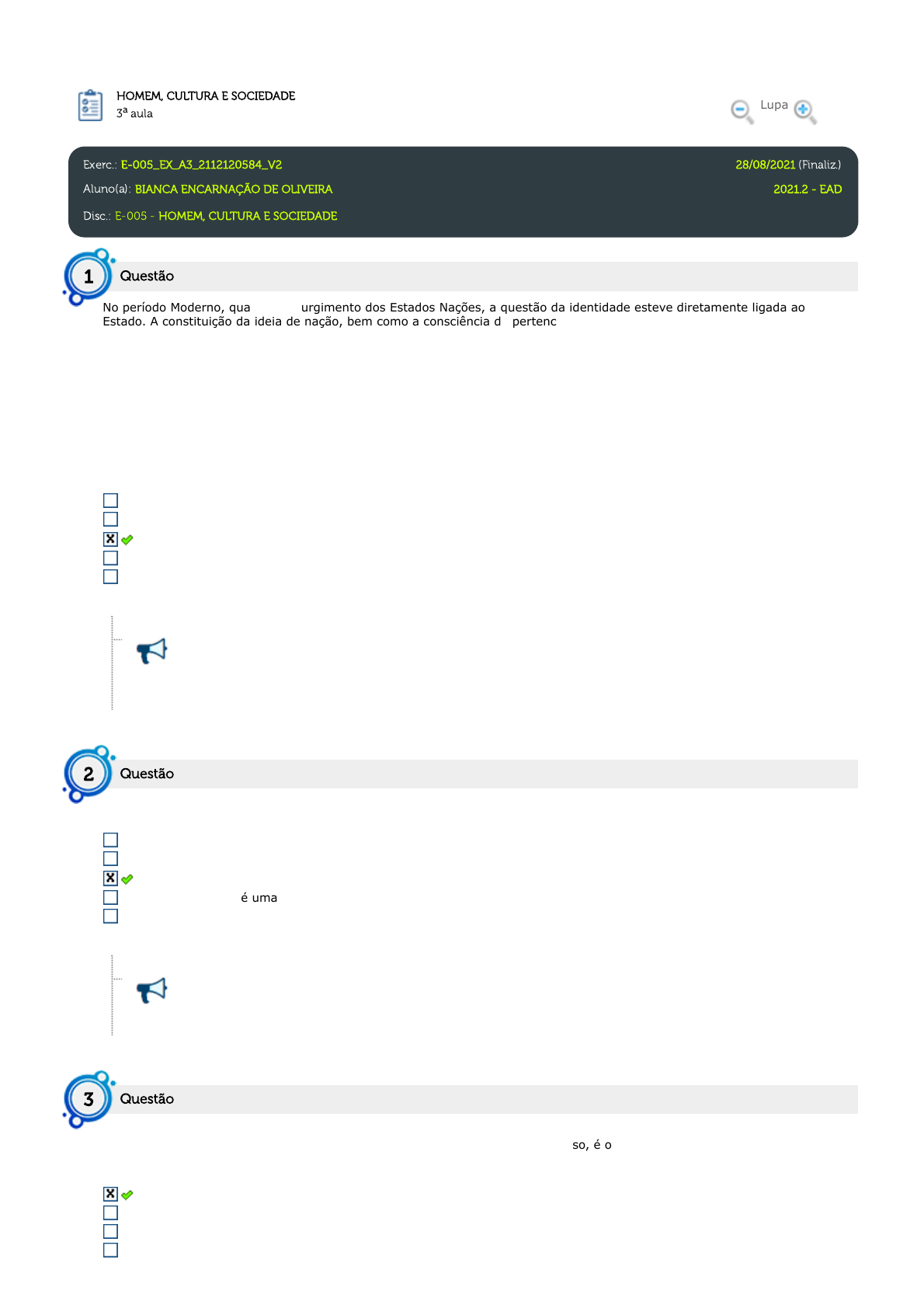 09/10/2021 15:44 EPS https://ensinounef.com.br/alunos/ 1/2 HOMEM, CULTURA E SOCIEDADE 3a aula Lupa Exerc.: E-005_EX_A3_2112120584_V2 28/08/2021 (Finaliz.) Aluno(a): BIANCA ENCARNAÇÃO DE OLIVEIRA 2021.2 - EAD Disc.: E-005 - HOMEM, CULTURA E SOCIEDADE Questão No período Moderno, quando do surgimento dos Estados Nações, a questão da identidade esteve diretamente ligada ao Estado. A constituição da ideia de nação, bem como a consciência de pertencimento que ela exige, pode ser fomentada por alguns dispositivos utilizados para representar a nação. Marque as assertivas correspondentes, que produzem significados. I. A língua. II. A raça. III. A história. IV. Algumas narrativas foram fundamentais para a formação das identidades e culturas nacionais (PACHECO, 2007, on- line). I, II, III I, IV I, II, III, IV II, IV I, III Explicação: Para muitos, a globalização tem contribuído para a desintegração das identidades nacionais em função da crescente homogeneização cultural imposta por esses fluxos culturais entre povos e nações. Questão Com relação á sociedade que vivemos, podemos inferir que: Nós só temos duas classes socais em nosso país As classes sociais são sempre as mesmas Vivemos em sociedade de classe A classe social é uma invenção da legislação do Estado Não vivemos em uma sociedade de classe Explicação: Vivemos em uma sociedade marcada pelas diferenças de classe. Questão Para Santos (2011), mais relevante do que adotar uma definição de identidade cultural, é questionar suas origens. Um dos princípios identificado pelo autor, que nos ajuda a compreender esse processo, é o de ________________ e __________________. Identidade e Alteridade Cultura e identidade Tradições e culturas Alteridade e Cultura 1 2 3 javascript:diminui(); javascript:aumenta(); 09/10/2021 15:44 EPS https://ensinounef.com.br/alunos/ 2/2 Costumes e Alteridade Explicação: Diversos antropólogos defendem a perspectiva de que a identidade cultural se dá por meio dessas relações de interação e interdependência entre o “eu” e o “outro”. Questão Ao afirmar que o homem é um ser que aprende e se modifica cotidianamente, fica evidente, portanto, que ao pensarmos em sociedade não há espaço para homogeneização. Analisando a frase podemos afirmar que: O ser humano é um ser homogêneo, uma vez que, ainda que tenha experiências diferentes continua com as mesmas concepções. O homem atual tem concepções modernas, decaindo o machismo. O ser humano é um ser estático, naturalmente machista e patriarcal. O ser humano é um ser em movimento, ou seja, está em continua transformação, e aprendizado. Um ser naturalmente heterogêneo. O termo homogêneo na frase quer dizer que o ser humano é o mesmo ao longo do anos. Explicação: O ser humano se modifica com o passar do tempo, e as experiências ao qual ele está vinculado. Não há como afirmar a homogeneidade de uma sociedade, uma vez que o seres humanos são ímpares, um a um. A sociedade e o próprio homem é um ser naturalmente heterogêneo, diferente do outro, e tantas vezes diferente de si mesmo. A vida se renova, o homem se renova, diariamente. Questão Segundo ---------------------------, “a medida em que as culturas nacionais tornam-se mais expostas a influências externas, é difícil conservar as identidades culturais intactas ou impedir que elas se tornem enfraquecidas através do bombardeamento e da infiltração cultural” (HALL, 2005, p. 74). Essa frase é do sociólogo Santos Ribeiro Hall Pancari Pacheco Explicação: Segundo Hall, “a medida em que as culturas nacionais tornam-se mais expostas a influências externas, é difícil conservar as identidades culturais intactas ou impedir que elas se tornem enfraquecidas através do bombardeamento e da infiltração cultural” (HALL, 2005, p. 74).Diversas identidades e culturas se comunicam de um jeito que nunca foi visto na história da humanidade. As redes sociais permitem que pessoas dos mais diferentes locais mantenham contato. Essas mudanças atravessam fronteiras em escala mundial, interligando comunidades e instituições, tornando o mundo mais interconectado. 4 5