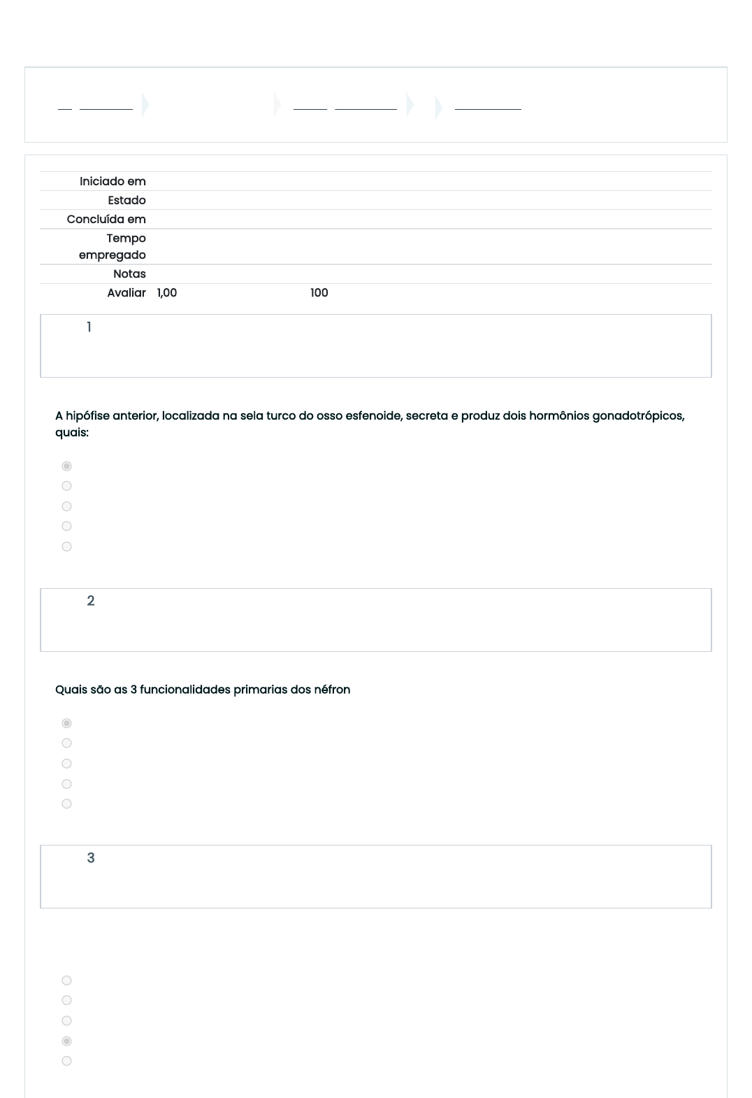Página inicial Minhas Disciplinas Fisiologia Humana Atividade IV Iniciado em quarta, 6 out 2021, 10:35 Estado Finalizada Concluída em quinta, 7 out 2021, 02:12 Tempo empregado 15 horas 36 minutos Notas 10,00/10,00 Avaliar 1,00 de um máximo de 1,00(100%) Questão 1 Completo Atingiu 1,00 de 1,00 Questão 2 Completo Atingiu 1,00 de 1,00 Questão 3 Completo Atingiu 1,00 de 1,00 A hipófise anterior, localizada na sela turco do osso esfenoide, secreta e produz dois hormônios gonadotrópicos, quais: a. FSH e LH. b. Aldosterona e estradiol. c. DHT e progesterona. d. FSH e testosterona. e. LH e estradiol. Quais são as 3 funcionalidades primarias dos néfron? a. filtração, reabsorção e secreção. b. Filtração, glomerulação, reabsorção. c. Nefrotização, secreção, reabsorção. d. Nefrotização e glomerulação. e. Filtração e secreção. O sistema urinário é formado por quais órgãos, exceto: a. Rins b. Ureteres c. Bexiga d. Próstata e. Uretra https://ead.unibrasil.com.br/ https://ead.unibrasil.com.br/course/view.php?id=60 https://ead.unibrasil.com.br/course/view.php?id=60§ion=3 https://ead.unibrasil.com.br/mod/quiz/view.php?id=3174 Questão 4 Completo Atingiu 1,00 de 1,00 Questão 5 Completo Atingiu 1,00 de 1,00 Questão 6 Completo Atingiu 1,00 de 1,00 Questão 7 Completo Atingiu 1,00 de 1,00 No sistema circulatório do organismo o oxigênio é transportado através: a. Insulina b. Hemoglobina c. Alvéolos d. Lisossomos e. Mitocôndrias O trato gastrintestinal consistem nos seguintes órgãos, exceto: a. Esôfago b. Estomago c. Intestino delgado d. Intestino grosso e. Baço As principais tarefas exercidas pelos rins são, exceto? a. excretar produtos rejeitados do metabolismo de substâncias químicas estranhas. b. regular o equilíbrio de água e eletrólitos. c. controlar a osmolalidade de líquidos do corpo e de concentração de eletrólitos. d. controle da pressão arterial. e. armazenar e liberar insulina. A filtração glomerular (FG) é determinada através de uma soma de duas forças: a. Hidrostáticas e coloidosmóticas. b. Hidroaérea e pressão negativa. c. Pressão positiva e hidroaérea. d. Pressão positiva e pressão negativa. e. Somente pelo fluxo de gradiente. Questão 8 Completo Atingiu 1,00 de 1,00 Questão 9 Completo Atingiu 1,00 de 1,00 Questão 10 Completo Atingiu 1,00 de 1,00 Mesmo o controle hormonal da função gonodal ocorrer no encéfalo as gônadas secretam dois hormônios peptídicos, quais? a. Inibinas e Ativinas. b. Serotonina e adrenalina. c. Aldosterona e estrogeno. d. Secretina e inibinas. e. Melatonina e serotonina. Qual característica abaixo não pertence aos néfrons. a. São ocos. b. Se parece com cano contorcido. c. Possui elementos tubulares. d. Contém capsula de Bowman. e. A alça de Henle possui uma torsão de duas voltas. Qual é a unidade funcional do rim? a. Néfron b. Alvéolo c. Ureter d. Uretra e. Pelve renal Atividade anterior ◄ Atividade III Seguir para... Próxima atividade Avalie sua disciplina ► https://ead.unibrasil.com.br/mod/quiz/view.php?id=3173&forceview=1 https://ead.unibrasil.com.br/mod/feedback/view.php?id=3177&forceview=1 Manter contato UniBrasil http://www.unibrasil.com.br/ Telefone : +55 (41) 3515 1448 Resumo de retenção de dados Obter o aplicativo para dispositivos móveis http://www.unibrasil.com.br/ tel:Telefone : +55 (41) 3515 1448 https://www.facebook.com/UniBrasilEAD/ https://www.instagram.com/eadunibrasil https://ead.unibrasil.com.br/admin/tool/dataprivacy/summary.php https://download.moodle.org/mobile?version=2020110900.02&lang=pt_br&iosappid=633359593&androidappid=com.moodle.moodlemobile