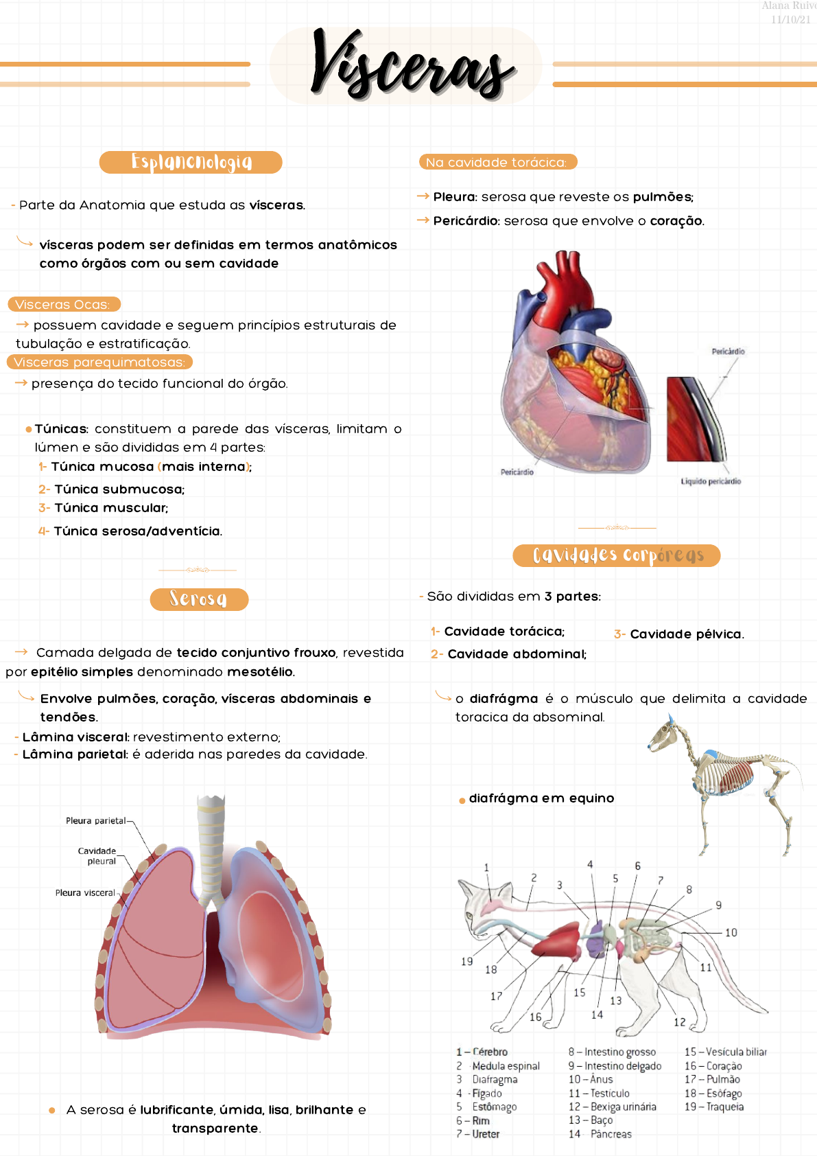 Visceras Ocas: SerosaSerosa Cavidades corpóreasCavidades corpóreas Na cavidade torácica: ViscerasViscerasVisceras EsplancnologiaEsplancnologia - Parte da Anatomia que estuda as vísceras. - Lâmina visceral: revestimento externo; - Lâmina parietal: é aderida nas paredes da cavidade. - São divididas em 3 partes: Túnicas: constituem a parede das vísceras, limitam o lúmen e são divididas em 4 partes: → possuem cavidade e seguem princípios estruturais de tubulação e estratificação. → presença do tecido funcional do órgão. → Pleura: serosa que reveste os pulmões; → Pericárdio: serosa que envolve o coração. vísceras podem ser definidas em termos anatômicos como órgãos com ou sem cavidade → Camada delgada de tecido conjuntivo frouxo, revestida por epitélio simples denominado mesotélio. Alana Ruivo 11/10/21 Visceras parequimatosas: 1- Túnica mucosa (mais interna); 1- Cavidade torácica; 2- Túnica submucosa; 2- Cavidade abdominal; 3- Cavidade pélvica. 3- Túnica muscular; 4- Túnica serosa/adventícia. Envolve pulmões, coração, vísceras abdominais e tendões. A serosa é lubrificante, úmida, lisa, brilhante e transparente. diafrágma em equino o diafrágma é o músculo que delimita a cavidade toracica da absominal.
