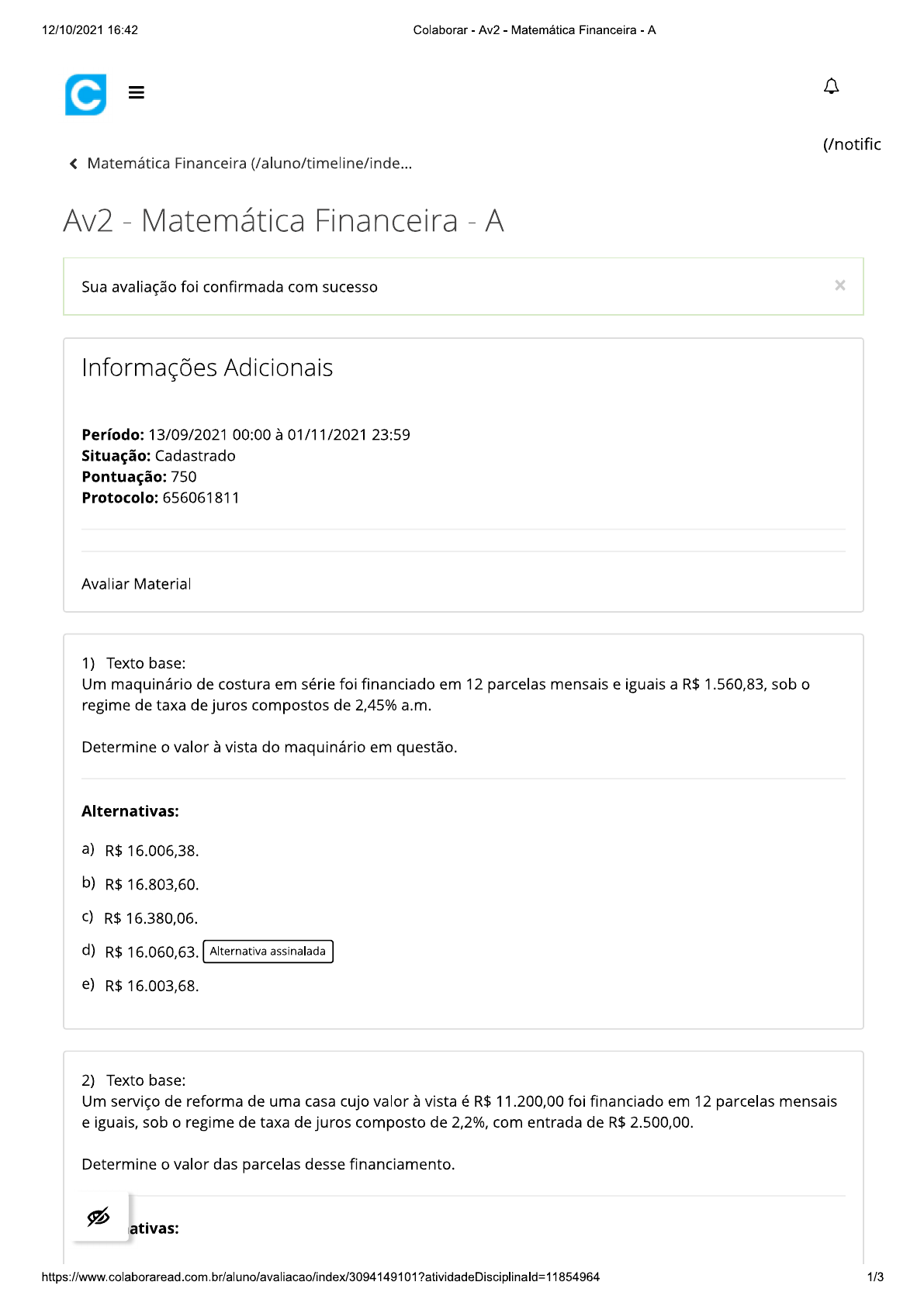 .edu.br/graduacao/mod/qu SulAmerica nbiente de 1 aduação S cursos / 952-94393 / AV2 / AV2 A taxa de uma aplicação financeira é de 6% ao semestre. S...
