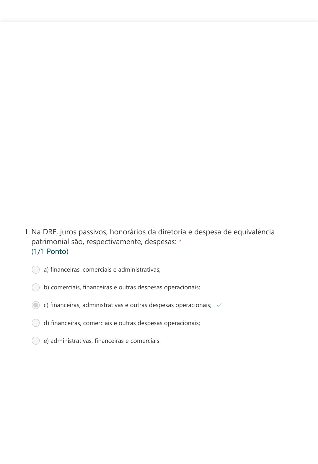 Pontos: 10/10 PROVA AV2 NOTURNO CONTABILIDADE INTERMEDIARIA 2 PROF: ED ANDERSON CAMPOS PROVA VALERÁ 10,0 PONTOS, TENDO PESO 2, OU SEJA SERÁ DIVIDIDA POR 2 E SOMADA COM A NOTA PARCIAL PARA COMPOR A MEDIA BIMESTRAL Na DRE, juros passivos, honorários da diretoria e despesa de equivalência patrimonial são, respectivamente, despesas: * (1/1 Ponto) 1. a) financeiras, comerciais e administrativas; b) comerciais, financeiras e outras despesas operacionais; c) financeiras, administrativas e outras despesas operacionais; d) financeiras, comerciais e outras despesas operacionais; e) administrativas, financeiras e comerciais. A empresa de Pedras & Pedreiras S/A demonstrou no exercício de 2001, os valores, como seguem: Lucro bruto R$ 90.000,00 Lucro operacional R$ 70.000,00 Receitas operacionais R$ 7.500,00 Despesas operacionais R$ 27.500,00 Participação de administradores R$ 2.500,00 Participação de debenturistas R$ 3.500,00 Participação de empregados R$ 3.000,00 A tributação do lucro dessa empresa deverá ocorrer à alíquota de 30% para Imposto de Renda e Contribuição Social sobre Lucro Líquido, conjuntamente. Assim, se forem calculados corretamente o IR e a CSLL, certamente o valor destinado, no exercício, à constituição da reserva legal, deverá ser de: * (1/1 Ponto) 2. a) R$2.000,00 b) R$2.070,00 c) R$2.090,00 d) R$2.097,00 e) R$2.135,00 É uma demonstração que informa quais foram as variações (mutações) sofridas pelas contas integrantes do grupo do Patrimônio Líquido da entidade entre a data inicial e final de um determinado exercício. Com relação à Demonstração das Mutações do Patrimônio Líquido (DMPL) pode-se afirmar que: * (1/1 Ponto) 3. esta demonstração é de apresentação obrigatória de acordo com as normas emanadas pela Lei das Sociedades por Ações. nela são evidenciadas todas as alterações ocorridas no Patrimônio Líquido da entidade e o Resultado Abrangente total do período, segregando-se o montante total atribuível aos controladores e o montante correspondente à participação de não controladores. a DMPL deve evidenciar somente as alterações ocorridas no Patrimônio Líquido relativas à parte do acionista controlador. as empresas de capital aberto estão desobrigadas de apresentar a DMPL se divulgarem em notas explicativas a apuração do Resultado Abrangente. as pequenas e médias empresas estão totalmente desobrigadas da apresentação desta demonstração, sendo a mesma, substituída integralmente pela Demonstração de Lucros/Prejuízos Acumulados. No Passivo Circulante, classificamos os credores ou investidores que não fazem parte do quadro societário da entidade e que geram obrigações que terão seus vencimentos no término do exercício subsequente ao término do Balanço. Assinale a opção em que TODAS as contas pertencem ao Passivo Circulante. * (1/1 Ponto) 4. a) Salários a Pagar, Impostos a Pagar, Encargos a recolher, 20ª parcela de Leasing. b) Caixa, Adiantamentos a Fornecedores, Adiantamento de Clientes, Energia Elétrica a pagar. c) Salários a Pagar, Imóveis, Impostos a Pagar, Encargos a recolher. d) Salários a Pagar, Empréstimos Bancário de Curto Prazo, Encargos a Recolher. NENHUMA DAS ANTERIORES Em 31/12/X7, o patrimônio líquido da empresa ABC apresentava saldo de R$875.000,00. Assinale a opção que corresponde ao aumento do ativo imobilizado dessa empresa. * (1/1 Ponto) 5. a) Contração de empréstimo. b) Compra de um prédio usado. c) Integralização de capital. d) Pagamento de dívidas em dinheiro. e) Recebimento de duplicatas com juros. Ao registrar a proposta de destinação dos resultados do exercício, o setor de Contabilidade da empresa deverá contabilizar: * (1/1 Ponto) 6. a) a formação de reserva legal, a débito da conta de Apuração do Resultado do Exercício. a formação de reserva legal, a crédito da conta de Lucros ou Prejuízos Acumulados. a distribuição de dividendos, a débito da conta de Lucros ou Prejuízos Acumulados. d) a distribuição de dividendos, a crédito de conta do Patrimônio Líquido. e) a distribuição de dividendos, a débito de conta do Passivo Circulante. A Demonstração das Mutações do Patrimônio Líquido (DMPL) de uma entidade evidenciava, em 31/12/X2, os seguintes saldos: Considere que, no período, ocorreram os seguintes lançamentos: Aumento de Capital com lucros R$ 32.000 Aumento de capital com reservas R$ 24.000 Dividendos distribuídos R$ 25.000 Constituição de reservas de lucros R$ 3.000 Com base apenas nas informações apresentadas, o lucro líquido do exercício encerrado em 20/X2 foi: * (1/1 Ponto) 7. a) R$ 69.000,00. b) R$ 94.000,00. c) R$ 81.000,00. d) R$ 84.000,00. e) R$ 70.000,00. Considere o Balanço Patrimonial da empresa Gama S/A referente ao exercício financeiro de X2: Balanço Patrimonial - empresa Gama S/A Ativo Passivo Ativo Circulante $ 7.200,00 Passivo Circulante $ 6.000,00 Ativo Não Circulante $ 7.800,00 Passivo Não Circulante $ 4.000,00 Realizável a longo prazo $ 1.550,00 Investimentos $ 1.000,00 Patrimônio Líquido $ 5.000,00 Imobilizado $ 3.750,00 Intangível $ 1.500,00 TOTAL $ 15.000,00 TOTAL $ 15.000,00 Com base nessas informações, é correto afirmar que: * (1/1 Ponto) 8. a) a dívida da empresa representa 200% do seu capital próprio. b) o capital de terceiros representa mais de 70% das fontes de recursos da empresa. c) o capital próprio é suficiente para cobrir os investimentos em ativos permanentes. d) a maior parte da dívida da empresa tem vencimento no longo prazo. e) o índice de imobilização dos recursos não correntes é de 0,80. Observe o Balanço Patrimonial da empresa ABC em 31/12/2010: Balanço Patrimonial - empresa ABC Ativo Passivo Ativo Circulante $ 30.000,00 Passivo Circulante $ 40.000,00 Caixa $ 2.000,00 Fornecedores $ 30.000,00 Bancos $ 13.000,00 Salários a pagar $ 7.000,00 Estoque de mercadorias $ 15.000,00 Impostos a pagar $ 3.000,00 Ativo Não Circulante $ 70.000,00 Patrimônio L