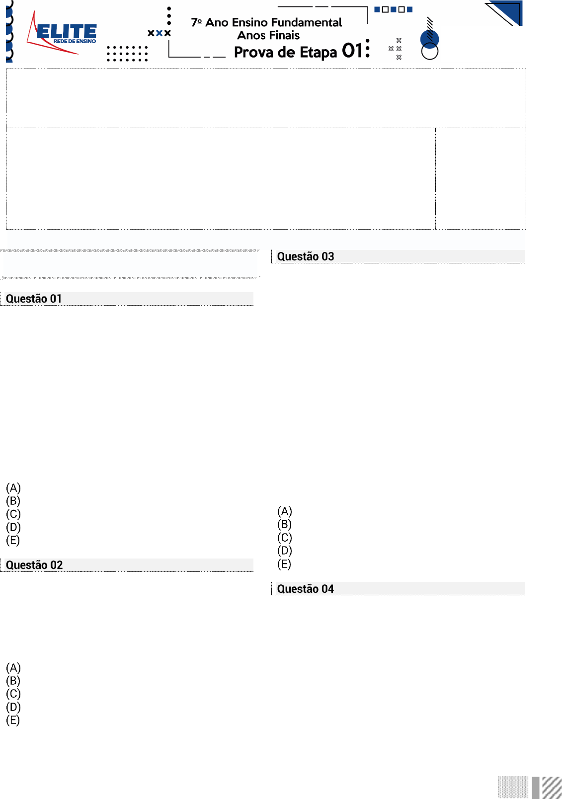 1 Código: 17004 Nome:____________________________________________________________________ Turma: __________ Unidade:____________________Professor:_____________________________________Data:___/____/___ Instruções: • Faça sua avaliação à caneta azul ou preta; • Provas feitas à lápis, com uso de corretivo ou rasuradas não serão recorrigidas; • assinale apenas uma alternativa para cada questão. A marcação em mais de uma alternativa anula a questão; • não serão fornecidas folhas para rascunho; • esta prova contém 3 páginas. MATEMÁTICA I O e-mail é uma forma segura de comunicação on- line que está presente desde os primórdios da internet. Se o assunto é relevante, você armazena a mensagem. Se não for, você simplesmente deleta o e-mail. Eduardo acumulou em sua caixa de e-mail 450 mensagens e deletou 188 delas. Dias depois, entraram 340 novas mensagens e ele apagou 400 mensagens. Marque a opção que representa quantas mensagens ficaram na caixa de entrada de Eduardo: 198 mensagens. 202 mensagens. 240 mensagens. 225 mensagens. 300 mensagens. As portas de acesso de todos os apartamentos de certo hotel são identificadas por meio de números ímpares formados com 3 elementos do conjunto M = {3, 4, 6, 7, 9}. Nessas condições, é correto afirmar que o número máximo de apartamentos desse hotel é: 125. 75. 15. 25. 100. Nas férias de julho, os quatro amigos de Pedro: Matheus, Eduardo, Gil e Victor, foram viajar para fora do Brasil com seus familiares, e Pedro ficou para visitar o Nordeste brasileiro. Certo dia, eles estavam conversando no celular sobre a temperatura de cada local onde estavam. Observe: – Pedro: Aqui no Nordeste fez 35°C hoje. – Matheus: Hoje, em Nova York, estava quente e os termômetros marcaram 24°C. – Eduardo: Senti muito frio aqui na Rússia, a temperatura foi de 10°C abaixo de zero. – Gil: Também senti frio aqui no Japão, a temperatura foi de 4°C negativos. – Victor: Hoje, pra mim, bateu recorde! Em Atacama estava 40°C. Analisando a conversa dos cinco amigos, determine quem vivenciou a maior temperatura: Pedro. Matheus. Eduardo. Gil. Victor. Uma pessoa tem um saldo negativo de R$80,00 na sua conta bancária. Fez um depósito de certa quantia, e seu saldo final passou a ser positivo em R$55,00. De acordo com essa situação, classifique as afirmativas em verdadeiras (V) ou falsas (F) e marque a alternativa que representa a sequência correta: I. ( ) O valor depositado foi de R$25,00. II. ( ) O saldo final passou a ser positivo porque o valor depositado foi inferior ao saldo inicial. III. ( ) O depósito feito foi no valor de R$135,00. 2 IV. ( ) O saldo negativo de R$50,00 pode ser representado pelo número inteiro –50. V. ( ) O valor depositado é superior ao saldo inicial. F – F – V – V – V. V – F – F – V – V. V – F – V – F – V. V – V – V – F – F. F – V – F – F – V. A Copa Elite é um evento esportivo que conta com mais de 20 atividades, que engaja a comunidade de pais e alunos, ensinando sobre os benefícios e a importância da manutenção da vida saudável. Para a realização desse grande evento, cada equipe participante deverá confeccionar uma bandeira conforme esquema abaixo: Cada equipe terá 4 cores distintas para colorir a bandeira. De quantas formas pode-se pintar cada uma dessas bandeiras, sabendo-se que duas listras vizinhas não podem ser da mesma cor? 100 formas diferentes. 125 formas diferentes. 108 formas diferentes. 210 formas diferentes. 150 formas diferentes. MATEMÁTICA II O gráfico abaixo representa o balanceamento de uma empresa no primeiro semestre de 2019, apresentando o saldo ao final de cada mês. Analisando esse gráfico, indique em qual mês houve o maior prejuízo nessa empresa: Janeiro. Fevereiro. Abril. Maio. Junho. Em uma certa região do país, os nutricionistas fizeram uma pesquisa sobre como era a ingestão, em calorias, dos seguintes grupos de alimentos: gordura, açúcares, carboidratos e proteínas. Fizeram um gráfico de barras para registrar a porcentagem ideal de ingestão desses grupos de alimentos nessa região diariamente e a ingestão diária dos pesquisados. Dessa forma, segundo o gráfico, podemos afirmar que: gorduras e carboidratos tiveram um consumo menor do que o esperado. açúcares e proteínas tiveram um consumo maior do que o esperado. o consumo de gordura foi o ideal. o consumo de carboidratos foi superior ao ideal. o consumo de açúcares foi inferior ao ideal. O gráfico abaixo ilustra a taxa de analfabetismo entre pessoas com 15 anos ou mais no Brasil entre os anos de 1940 e 2010. 3 Com base no gráfico, podemos concluir que o período em que se observou a maior redução na taxa de analfabetismo foi entre os anos: 1940 e 1950. 1950 e 1960. 1970 e 1980. 1991 e 2000. 2000 e 2010. “O Governo Federal, sempre muito estratégico, pensando em fugir da crise econômica, liberou recentemente o saque de todas as contas inativas do FGTS, desde que as contas tenham ficado inativas a partir do dia 31 de dezembro de 2015.” Disponível em: <pis.pro.br/fgts-inativo/>. Acesso em: 31 out. 2017. Gilmar sacou R$20.000,00 de seu FGTS, juntou esse valor com os R$180.000,00 guardados em sua poupança e fez uma aplicação a uma taxa anual de juros simples de 10%. Ou seja, daqui a um ano, Gilmar terá um acréscimo de 10% do valor atual. Qual o valor final, após a aplicação, do dinheiro de Gilmar? R$200.000,00. R$20.000,00. R$220.000,00. R$2.000,00. R$22.000,00. Para aumentar as vendas no início do ano, uma loja de departamentos remarcou os preços de seus produtos 20% abaixo do preço original. Quando chegam ao caixa, os clientes que possuem o cartão fidelidade da loja têm direito a um desconto adicional de 10% sobre o valor total de suas compras. Um cliente deseja comprar um produto que custava R$50,00 antes da remarcação de preços. Ele não possui o cartão fidelidade da loja. Se esse cliente possuísse o cartão fidelidade d