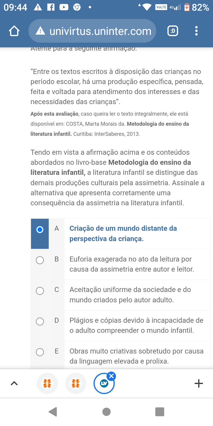 Entre os textos escritos à disposição das crianças no período escolar, há uma produção específica, pensada, feita e voltada para atendimento dos interesses e das necessidades das crianças. Tendo em vista a afirmação acima e os conteúdos abordados no livro-base Metodologia do ensino da literatura infantil, a literatura infantil se distingue das demais produções culturais pela assimetria. Assinale a alternativa que apresenta corretamente uma consequência da assimetria na literatura infantil. A Criação de um mundo distante da perspectiva da criança. B Euforia exagerada no ato da leitura por causa da assimetria entre autor e leitor. C Aceitação uniforme da sociedade e do mundo criados pelo autor adulto. D Plágios e cópias devido à incapacidade de adulto compreender o mundo infantil. E Obras muito criativas sobretudo por causa da linguagem elevada e prolixa.