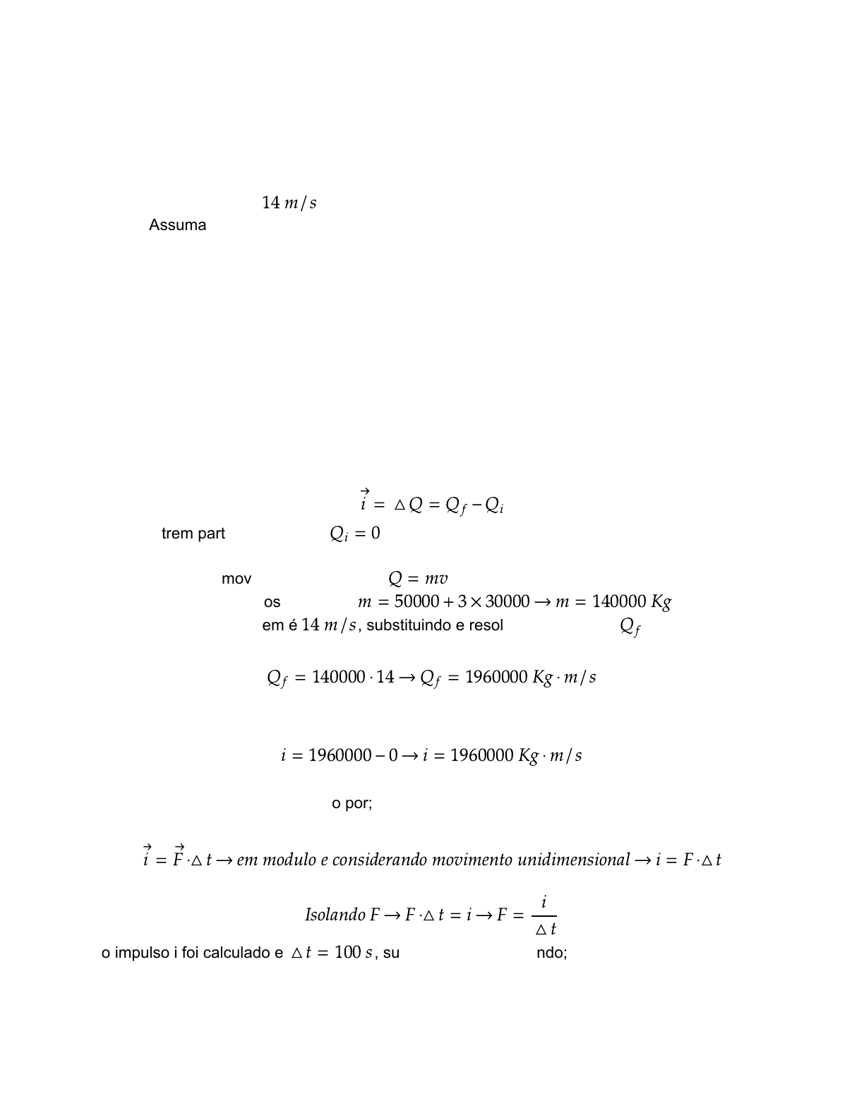 Tiago Lima - Instagram: @professor_disciplinas_exatas • Um trem é composto por uma locomotiva de 50000 kg e três vagões que possuem massas iguais a 30000 kg. Se partindo do repouso o trem leva 100 s para atingir a velocidade de , determine a força resultante agindo nas rodas do trem. 14 m / s Assuma que ela é constante a) 12,0 kN b) 1,4 kN c) 11,2 kN d) 15,4 kN e) 19,6 kN Resolução: Primeiro, vamos achar o impulso que é transmitido ao trem pelo atrito das rodas com os trilhos; este impulso é dado por = △Q = Q -Qi f i Como o trem partiu do repouso; Q = 0i A quantidade de movimento é dada por: Q = mv A massa do trem mais os vagões é: m = 50000 + 3 × 30000 m = 140000 Kg→ A velocidade final do trem é , substituindo e resolvendo achamos ;14 m / s Qf Q = 140000 ⋅ 14 Q = 1960000 Kg ⋅m / sf → f Assim, o impulso é; i = 1960000 - 0 i = 1960000 Kg ⋅m / s→ O impulso também pode ser dado por; = ⋅△ t em modulo e considerando movimento unidimensional i = F ⋅△ ti F → → Isolando F F ⋅△ t = i F =→ → i △ t o impulso i foi calculado e , substituindo e resolvendo;△ t = 100 s F = F = 19600 N F = 19, 6 KN 1960000 100 → → (Resposta )