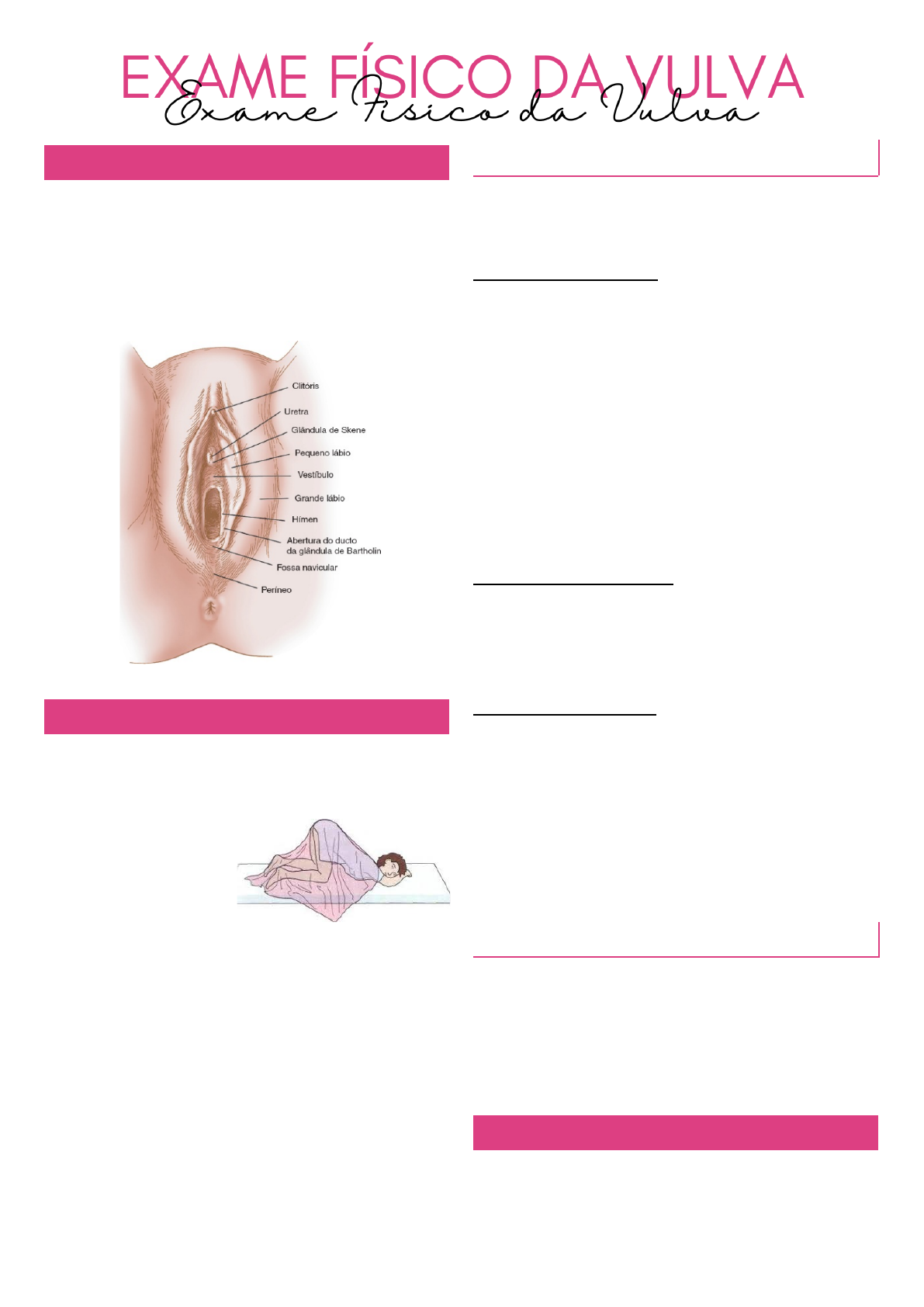 ANATOMIA DA VULVA A genitália externa, representada pela vulva, inclui o monte de Vênus, os grandes e os pequenos lábios, o vestíbulo (meato uretral, introito vaginal, hímen, glândulas parauretrais ou vestibulares menores ou de Skene e glândulas vestibulares maiores ou de Bartholin) e o clitóris. EXAME FÍSICO DA VULVA A paciente deve ser colocada na posição ginecológica, de modo a expor mais facilmente a genitália externa. Ps: Na maioria dos casos, essa posição é suficiente. Contudo, quando é preciso analisar melhor a parede anterior da vagina, no seu terço superior, torna-se necessária a posição genupeitoral ou de “prece maometana”. Nos casos de prolapso e de incontinência urinária de esforço, a paciente deve também ser examinada de pé, com as pernas entreabertas. Independente das posições, o examinador coloca- se entre as pernas da paciente; apoia o pé na escada e repousa o cotovelo da mão que examina na coxa. A finalidade disso é evitar tensão muscular e fadiga que embotem a sensibilidade. INSPEÇÃO À inspeção, em repouso, examinam se a vulva, o períneo e o ânus. Na vulva, observam se: ✓ Implantação dos pêlos; ✓ Aspecto da fenda vulvar (fechada, entreaberta, aberta); ✓ Umidade; ✓ Secreções; ✓ Hiperemia; ✓ Ulcerações; ✓ Distrofias; ✓ Neoplasias; ✓ Lesões cutâneas; ✓ Distopias; ✓ Malformações. No períneo, investiga- se: ✓ Se está íntegro ou se há ruptura de I, II ou III grau, complicada com extensão ao esfíncter e ao canal anal; ✓ Cicatrizes de episiorrafias ou perineoplastia. No ânus, procuram-se: ✓ Hemorróidas; ✓ Fissuras; ✓ Prolapso da mucosa; ✓ Malformações. A seguir, o examinador entreabre os grandes lábios e passa a observar o clitóris, o óstio uretral, o hímen e o introito vaginal. PESQUISA DE DISTOPIA Terminada a inspeção em repouso, o examinador solicita à paciente fazer esforço semelhante ao de evacuar ou de urinar, observando se há protrusão das paredes vaginais ou do colo que denuncie a presença de distopia. INFECÇÕES DO SISTEMA GENITAL FEMININO No grupo das infecções estão incluídas as skenites, as bartholinites, as vulvovaginites, as cervicites, as endometrites e as anexites. Laura Ellen | Medicina | P4 | 2021.1 Costumam dividir as infecções ginecológicas em dois grupos, usando se como limite o orifício interno do colo uterino: 1. Infecções altas (doença pélvica inflamatória - endometrites e as anexites); 2. Infecções baixas (vulvovaginites e as cervicites). A propagação ascendente dos processos infecciosos não ocorre com mais frequência em virtude da existência de mecanismos locais de defesa que funcionam como: ■ “Barreiras mecânicas”: ↳ Os pelos vulvares; ↳ Introito vaginal obliterado pelos pequenos lábios; ↳ Muco cervical agindo como verdadeiro tampão mucoso; ■ “Barreiras químicas”: ↳ Os bacilos de Döderlein; ↳ As lisozimas; ↳ Ácido undecilênico, os quais dão à vagina o meio ácido necessário para sua autodepuração. VULVITES E VULVOVAGINITES Nas vulvites, aparecem na pele dessa região eritema, bolhas, pústulas, flictenas, furúnculos e abscessos sebáceos. São comumente denominados foliculites e furunculoses, sendo causadas pela penetração de microrganismos nos folículos pilosos e nas glândulas sudoríparas. Os sintomas principais são: dor, sangramento, odor desagradável e prurido. Entre as vulvites destacam-se: as micoses superficiais, que se caracterizam principalmente pelo prurido. ISTs As enfermidades são agrupadas em lesões papulares, lesões planas e lesões granulomatosas. LESÕES PAPULARES A esse grupo pertencem o cancro mole e o cancro duro. As lesões ocorreram secundariamente. A diferenciação clínica entre o cancro mole e o cancro duro baseia-se na consistência da base da lesão e no número delas. CANCRO DURO: O cancro duro é geralmente único, tem base endurecida, por vezes é ulcerado discretamente na superfície e indolor. Representa o ponto de inoculação da sífilis, daí ser chamado de protossifiloma. Pode localizar se na vulva, na vagina, no colo do útero e na boca. A pesquisa direta do Treponema pallidum, seu agente etiológico, e os testes sorológicos (VDRL, RPR [rapid plasma reagin], FTA ABS) selam o diagnóstico. CANCRO MOLE: O cancro mole, causado pelo bacilo de Ducrey (cancro de Ducrey), é extremamente doloroso, a sua base é mole e as lesões disseminam-se. O diagnóstico é confirmado pelo encontro do Haemophilus ducreyi no exame bacteriológico. LESÕES PLANAS As lesões planas incluem a sífilis e o herpes genital. Pápulas planas, com extensão em superfície, podem aparecer na fase tardia da sífilis ou na infecção viral do tipo Herpes hominis. LESÕES HERPÉTICAS: As lesões herpéticas transformam-se em vesículas “em chuveiro”, sobre base eritematosa. Acompanham-se de prurido e de ardor. Quando as lesões planas se associam às lesões verrucosas, deve-se pensar em outra enfermidade viral: o condiloma acuminado, causado pelo papilomavírus humano (HPV), que pode tomar grandes proporções principalmente durante a gravidez. O condiloma acuminado produz secreção purulenta, sangramento e dor. LESÕES GRANULOMATOSAS As lesões granulomatosas compreendem o linfogranuloma venéreo e o granuloma inguinal ou donovanose. NEOPLASIAS VULVARES A região vulvar pode sofrer modificações da umidade e da ventilação causadas por pêlos, por Laura Ellen | Medicina | P4 | 2021.1 vestuário inadequado e por contato com secreções e com urina quando são precárias as condições de higiene. Além disso, a utilização de sabonetes, de desodorantes, bem como alterações metabólicas determinadas por diabetes, propiciam o aparecimento de uma afecção de aspecto polimorfo, denominada distrofia vulvar. As “distrofias vulvares”, atualmente denominadas neoplasia intraepitelial vulvar (NIV), são classificadas quanto ao seu grau de diferenciação, em NIV I, II 